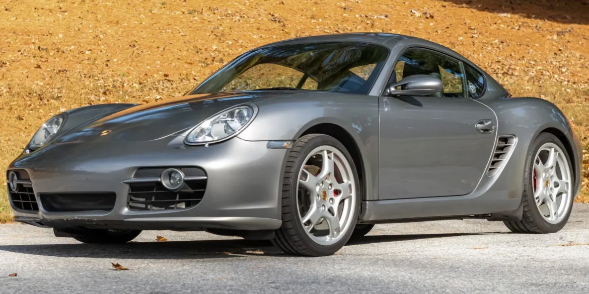 This 2006 Porsche Cayman S is powered by a 3.4-liter flat-six paired with a six-speed manual transaxle and is finished in Seal Gray Metallic over black leather. Equipment includes the Sport Chrono Package Plus, the Preferred Package, a deployable rear spoiler, bi-xenon headlights, fog lights, 19″ Carrera S wheels, Porsche...