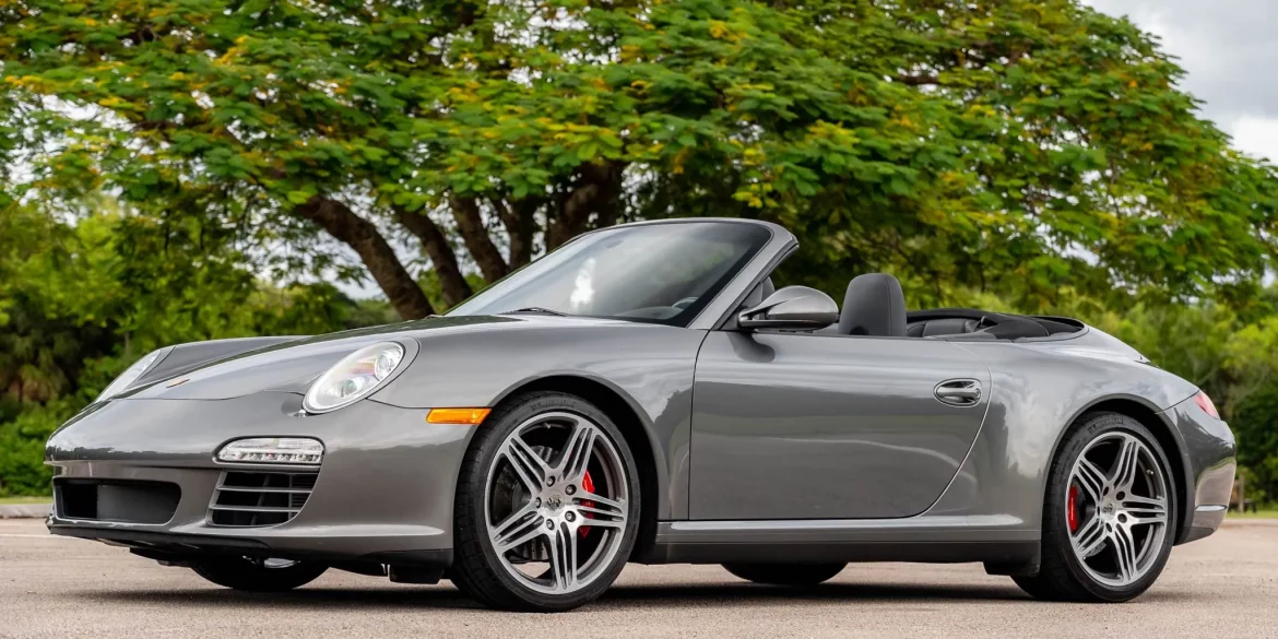 This 2009 Porsche 911 Carrera 4S cabriolet was specified in Meteor Gray Metallic over black leather, and it has 19k miles. Power is from a 3.8-liter flat-six that drives all four wheels through a seven-speed PDK dual-clutch transaxle, and equipment includes the Sport Chrono Package Plus, 19” Turbo wheels, a black...