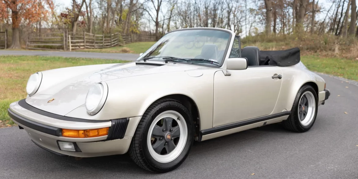 This 1989 Porsche 911 Carrera cabriolet is powered by a 3.2-liter flat-six paired with a G50 five-speed manual transaxle, and it is finished in Linen Grey Metallic over black leather. Equipment includes a limited-slip differential, a black soft top, power-adjustable front seats, an Alpine cassette head unit, a front trunk-mounted...