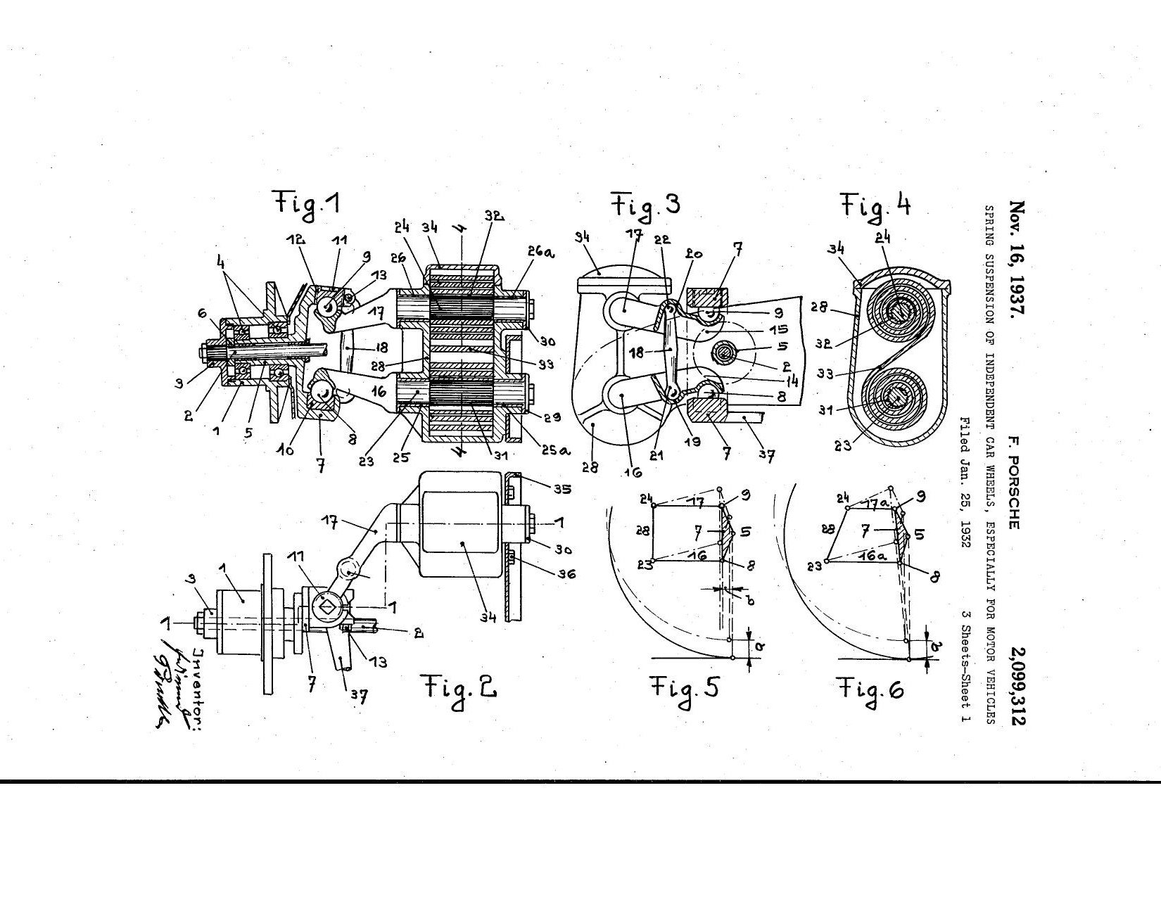 1932, Ferdinand Porsche patent: spring suspension of independent car wheels (typ 21)