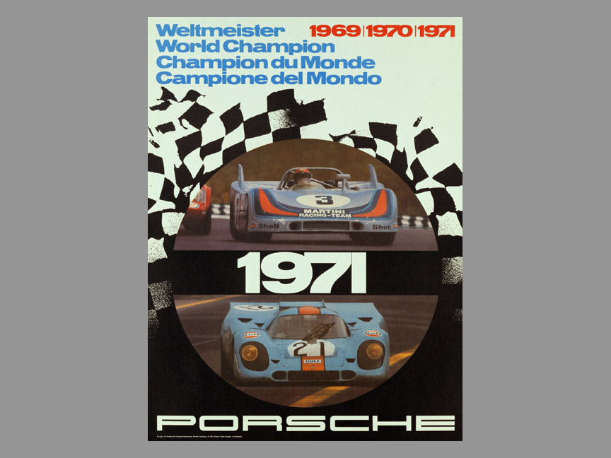 As the successor to the successful 907 and 908 types, the 917 got an air-cooled twelve-cylinder engine whose power in 1970 was an imposing 580 hp (426 kW) at 8,300 rpms. On June 14, 1970, Porsche bagged the first of 16 overall victories at the 24 Hours of Le Mans. After exactly 2,863.15 miles, or 343 laps, drivers Hans Herrmann and Richard Attwood took the checkered flag in the legendary Porsche 917 Kurzheck (KH) from Porsche Salzburg, with start number 23. When Gérard Larrousse and Willy Kauhsen took second in the Martini-917 Langheck and Rudi Lins and Helmut Marko came in third in the Porsche 908/02, the Porsche sweep of the podium was perfect.