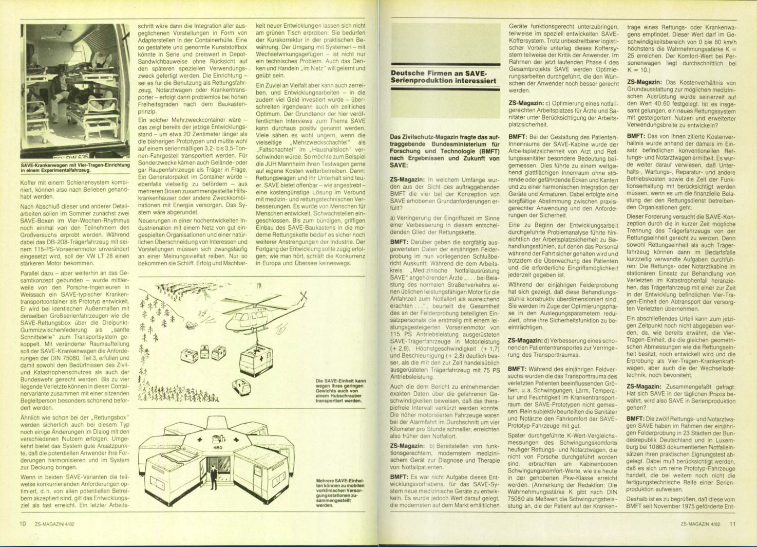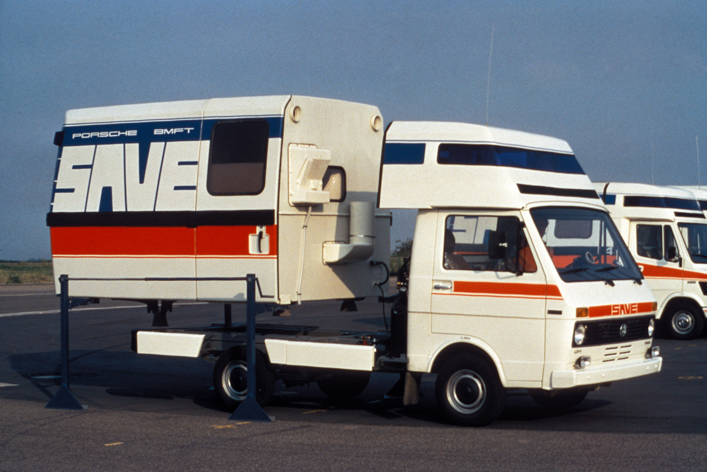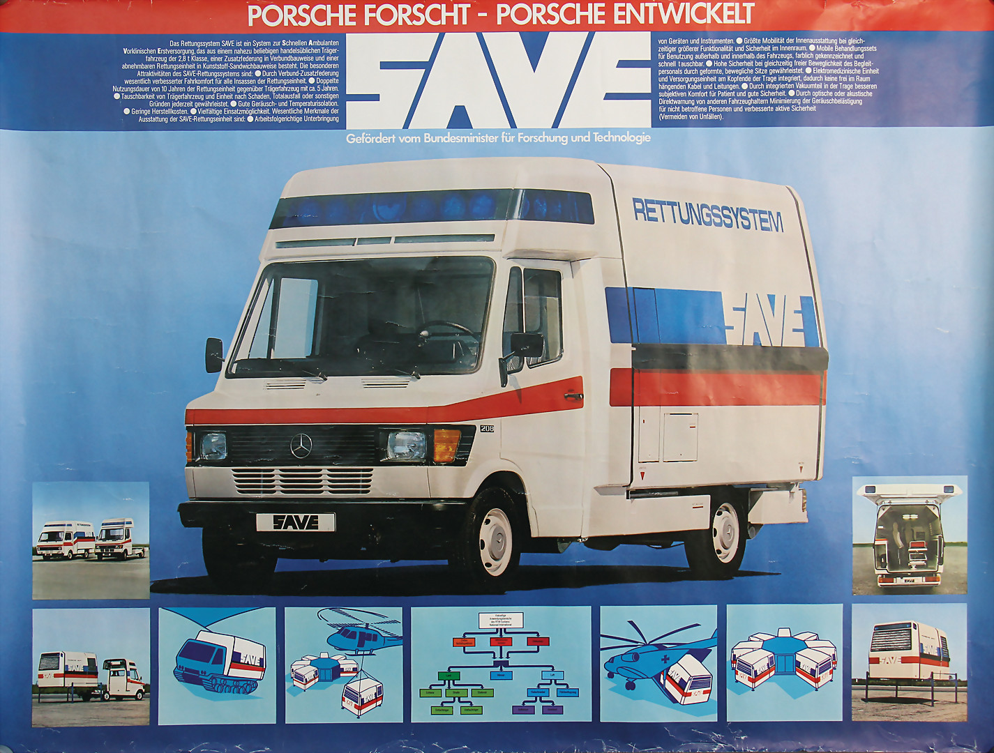 From April 18, 1980, to October 20, 1980, ASB Kassel participated in practical testing of the SAVE (Speedy Ambulance Pre-Clinical First Aid) prototype ambulance on behalf of the Federal Ministry of Research and Technology. This ambulance was developed and built by the Porsche Weissach Development Center under a contract with the Federal Ministry of Research and Technology.