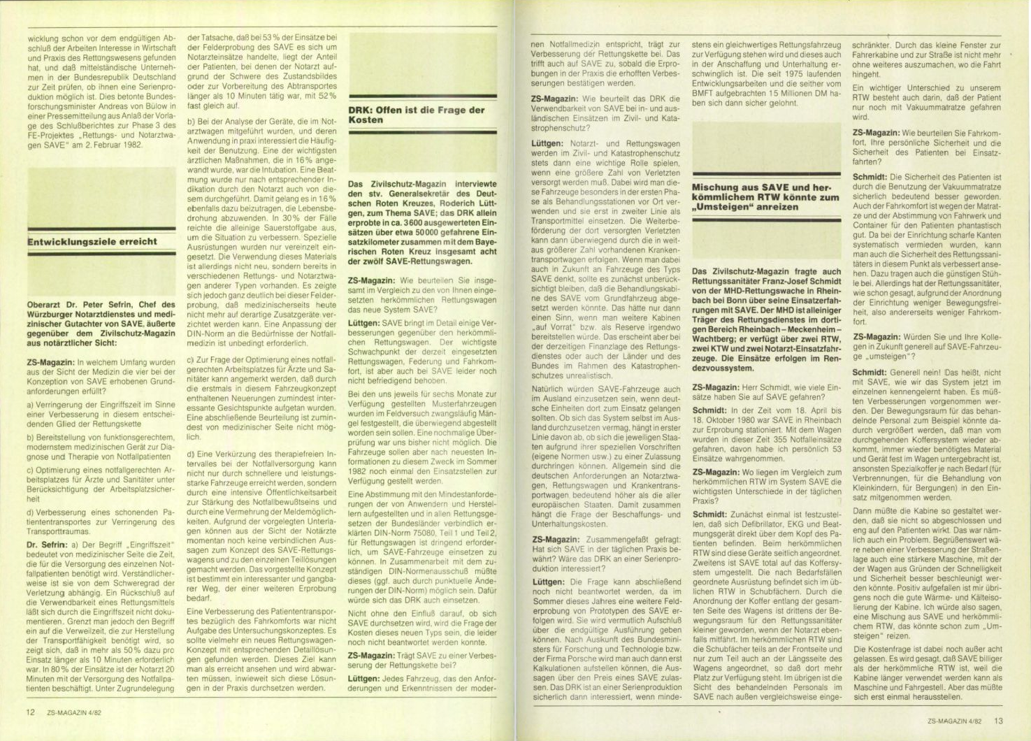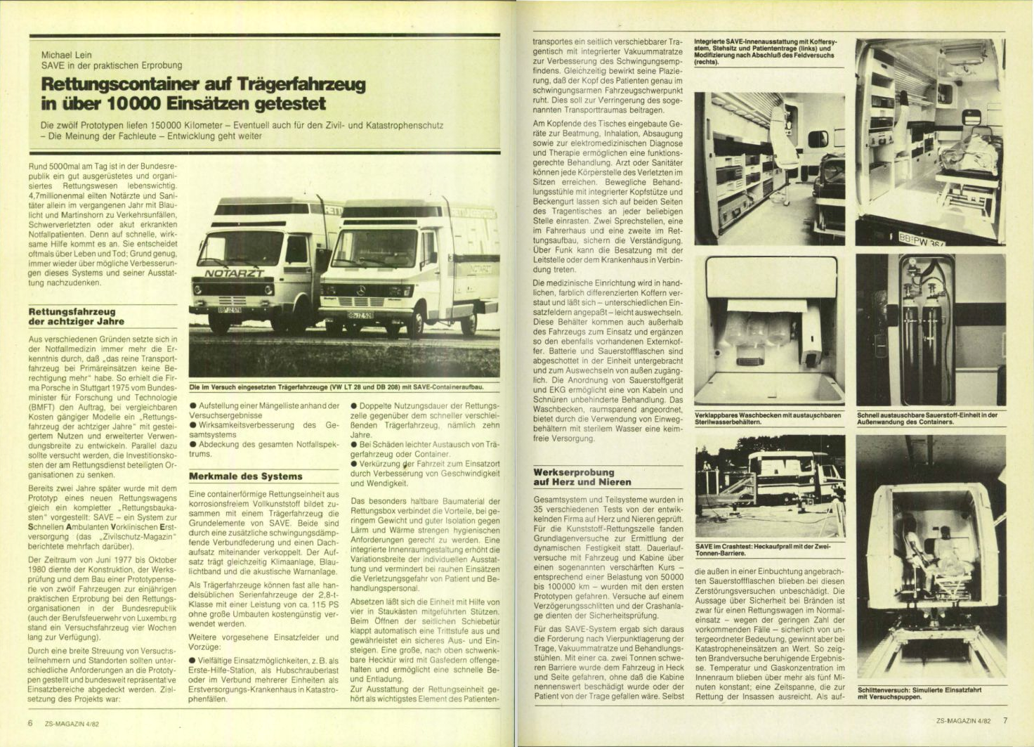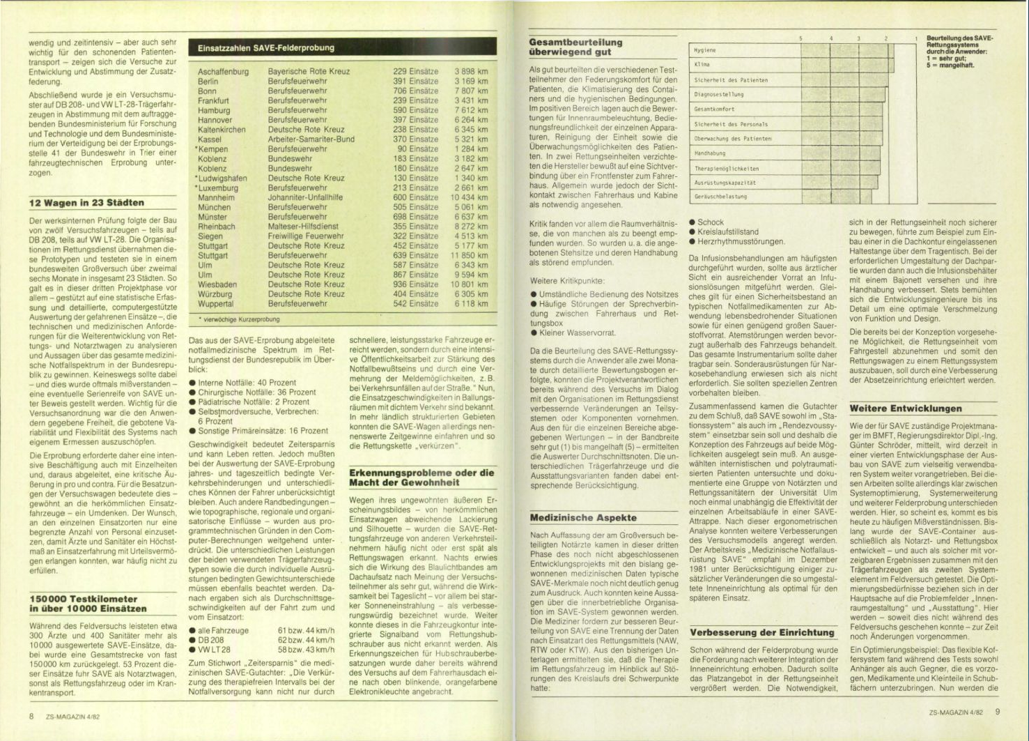 From April 18, 1980, to October 20, 1980, ASB Kassel participated in practical testing of the SAVE (Speedy Ambulance Pre-Clinical First Aid) prototype ambulance on behalf of the Federal Ministry of Research and Technology. This ambulance was developed and built by the Porsche Weissach Development Center under a contract with the Federal Ministry of Research and Technology.