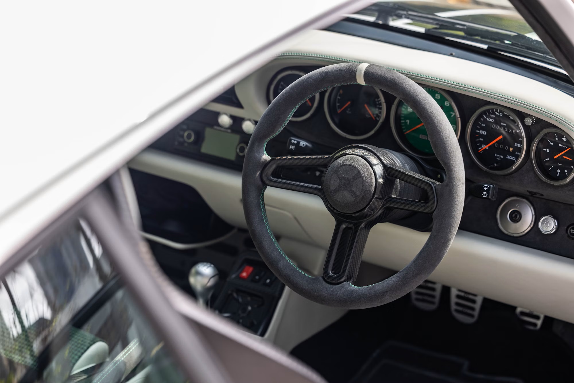 This particular Gunther Werks Coupe offered for sale on Collecting Cars was commissioned in 2022 and finished in 2023. It showcases a stunning white exterior with vibrant green accents and exposed carbon fiber elements. The interior complements the theme with houndstooth cloth inserts and green contrast stitching as well as desirable options like JRZ electronic adjustable dampers and a custom exhaust system.