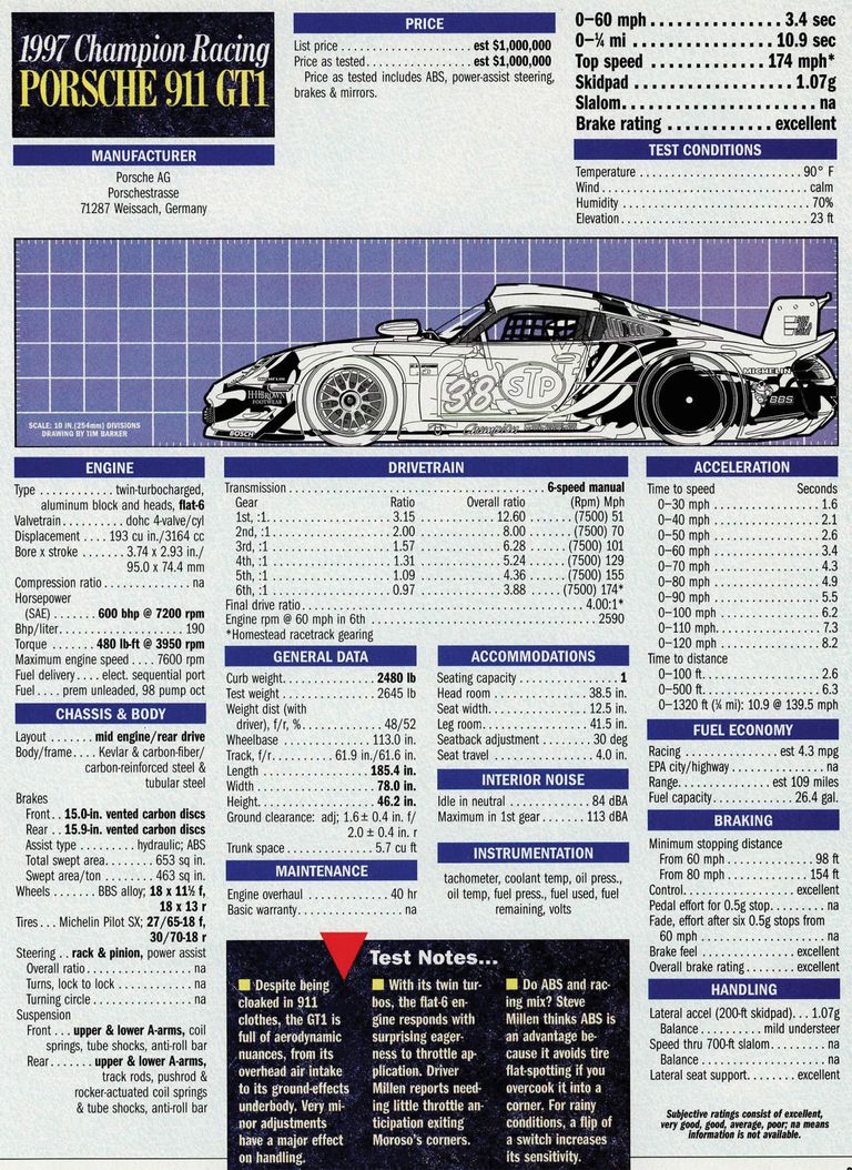 1997 Porsche 911 GT1 Specs Sheet (Car and Driver)