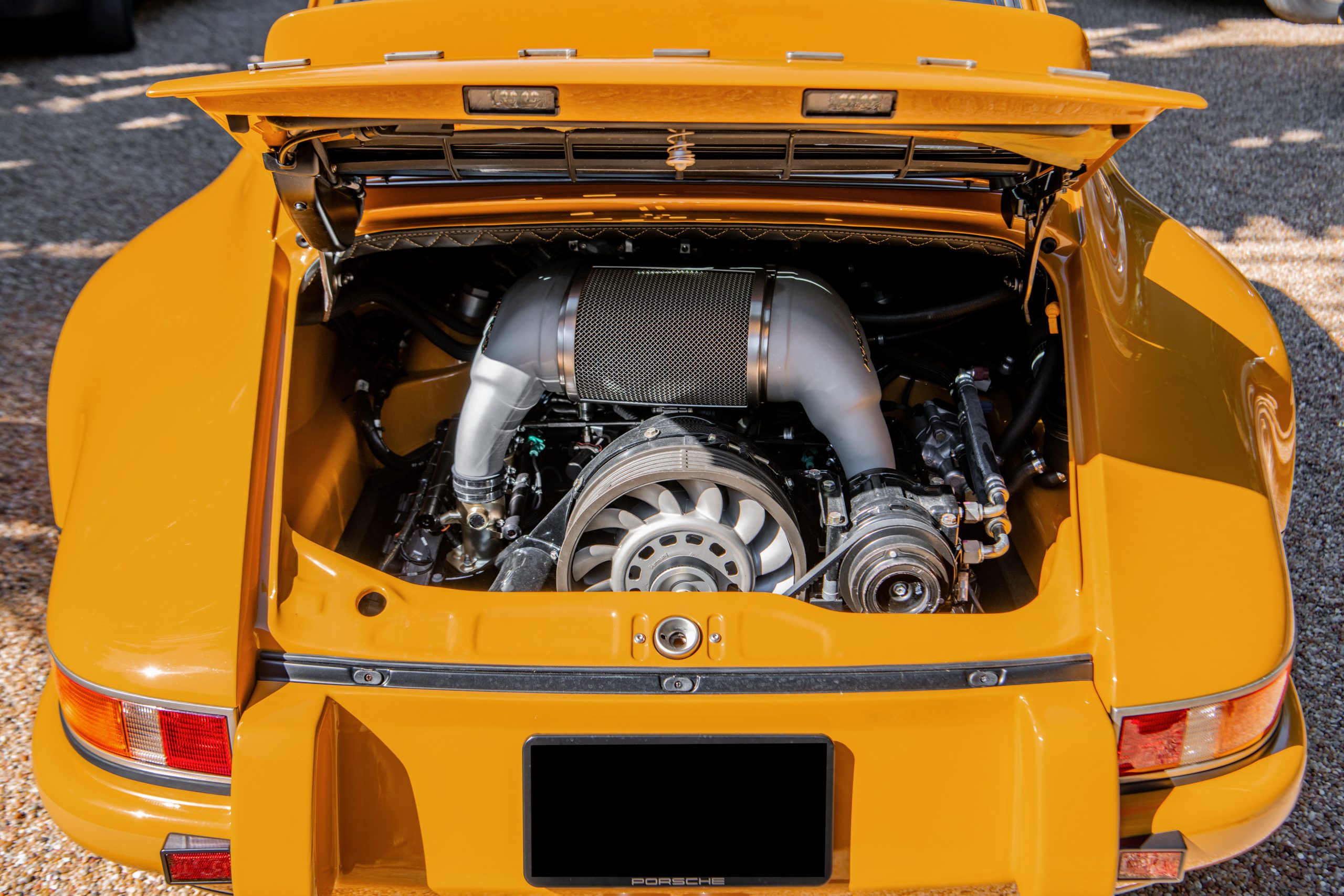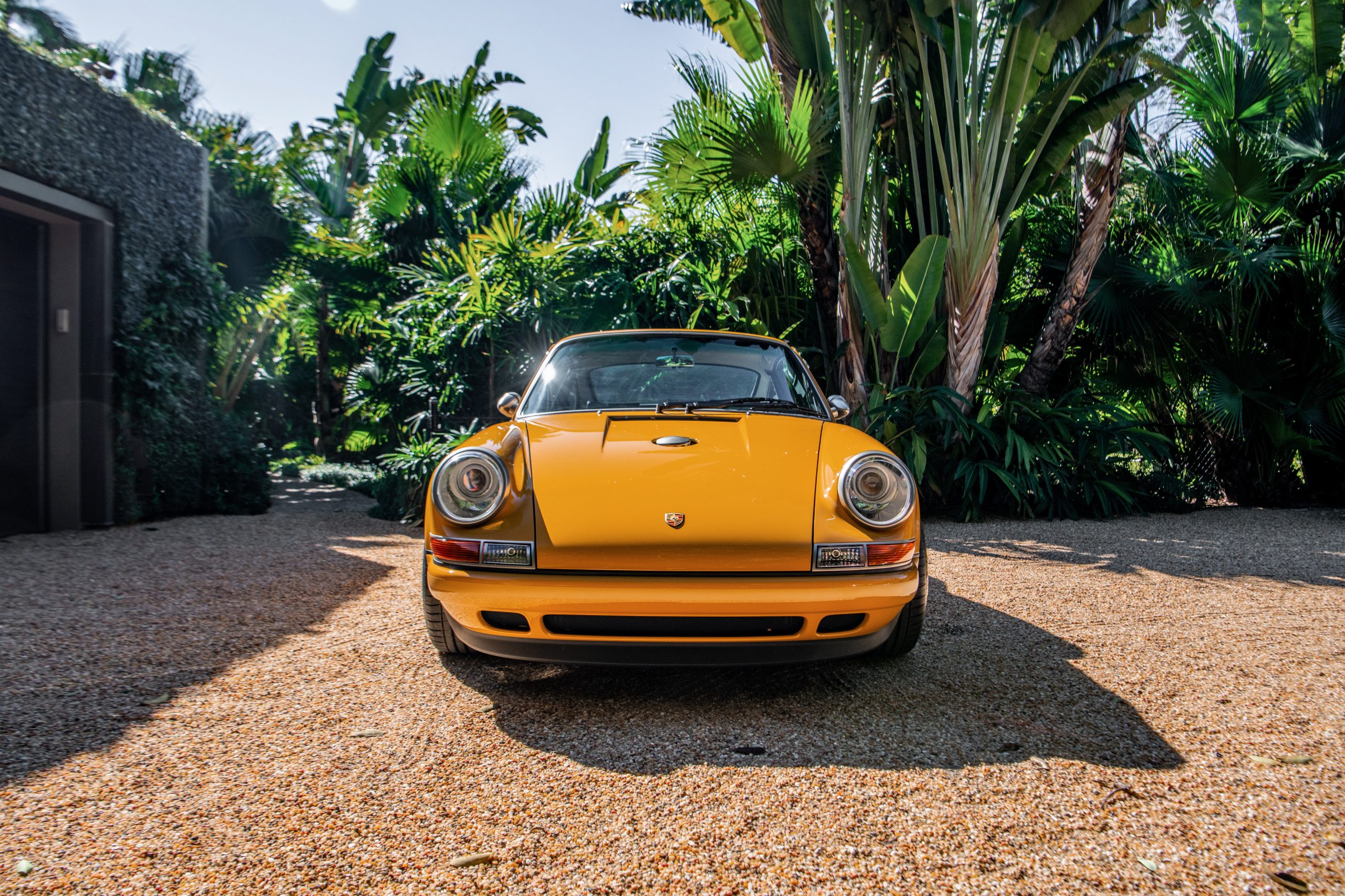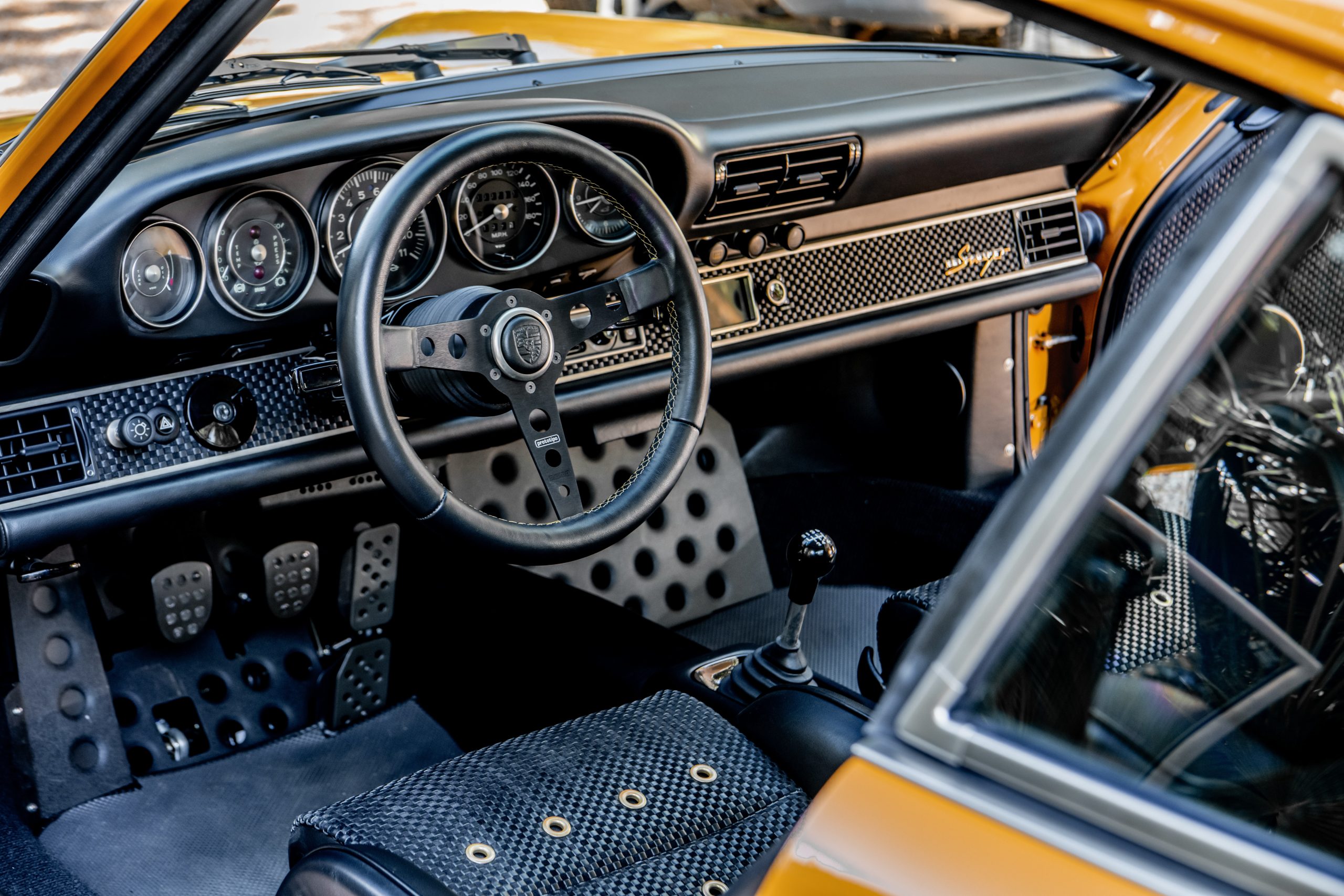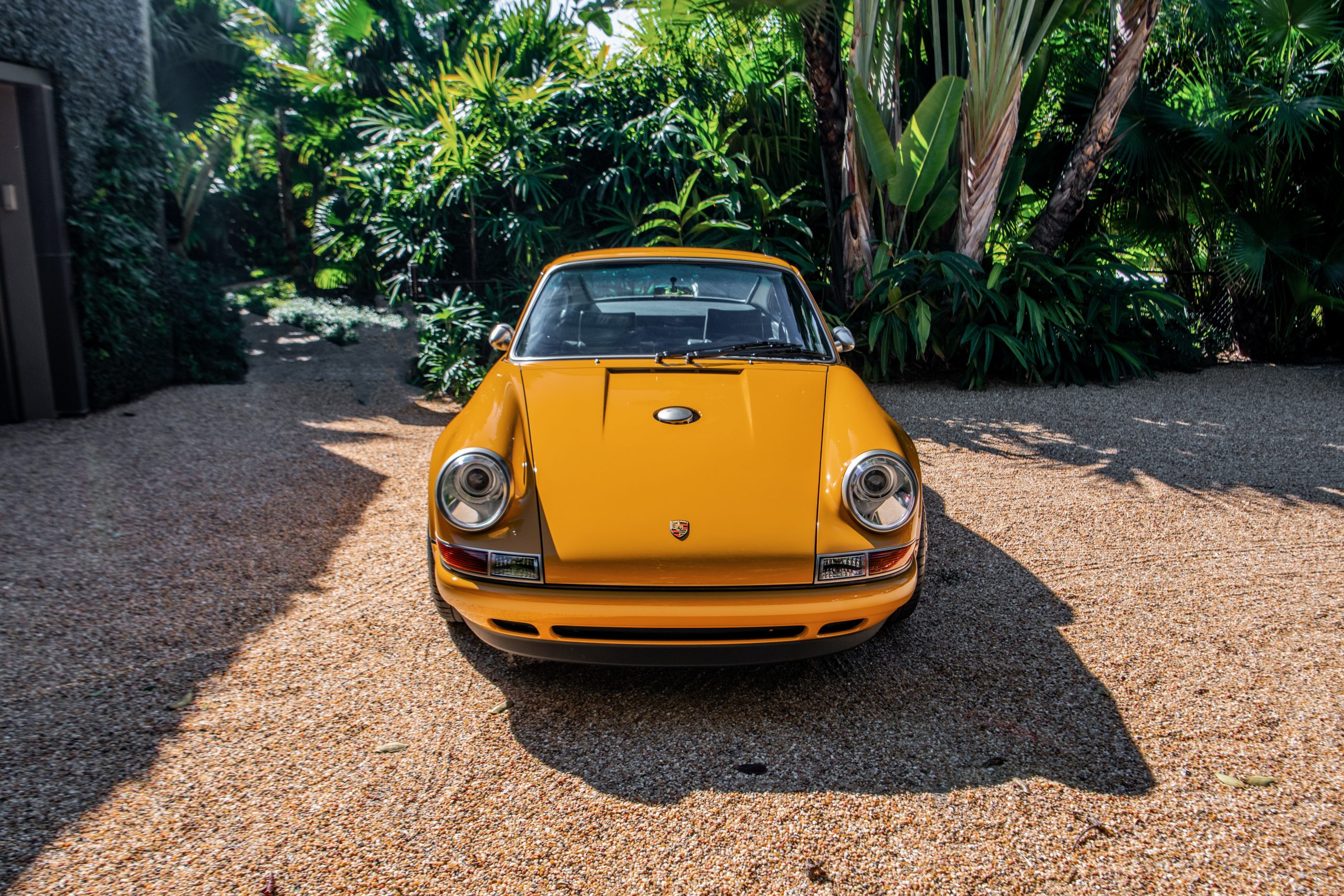 Finished in striking Bahama Yellow with subtle Ghosted Light rocker stripes and Porsche script, the car blends classic styling with modern craftsmanship. Details like polished-lip Fuchs wheels, center fuel filler, external oil filler, and backdated mirrors give it a timeless presence.
