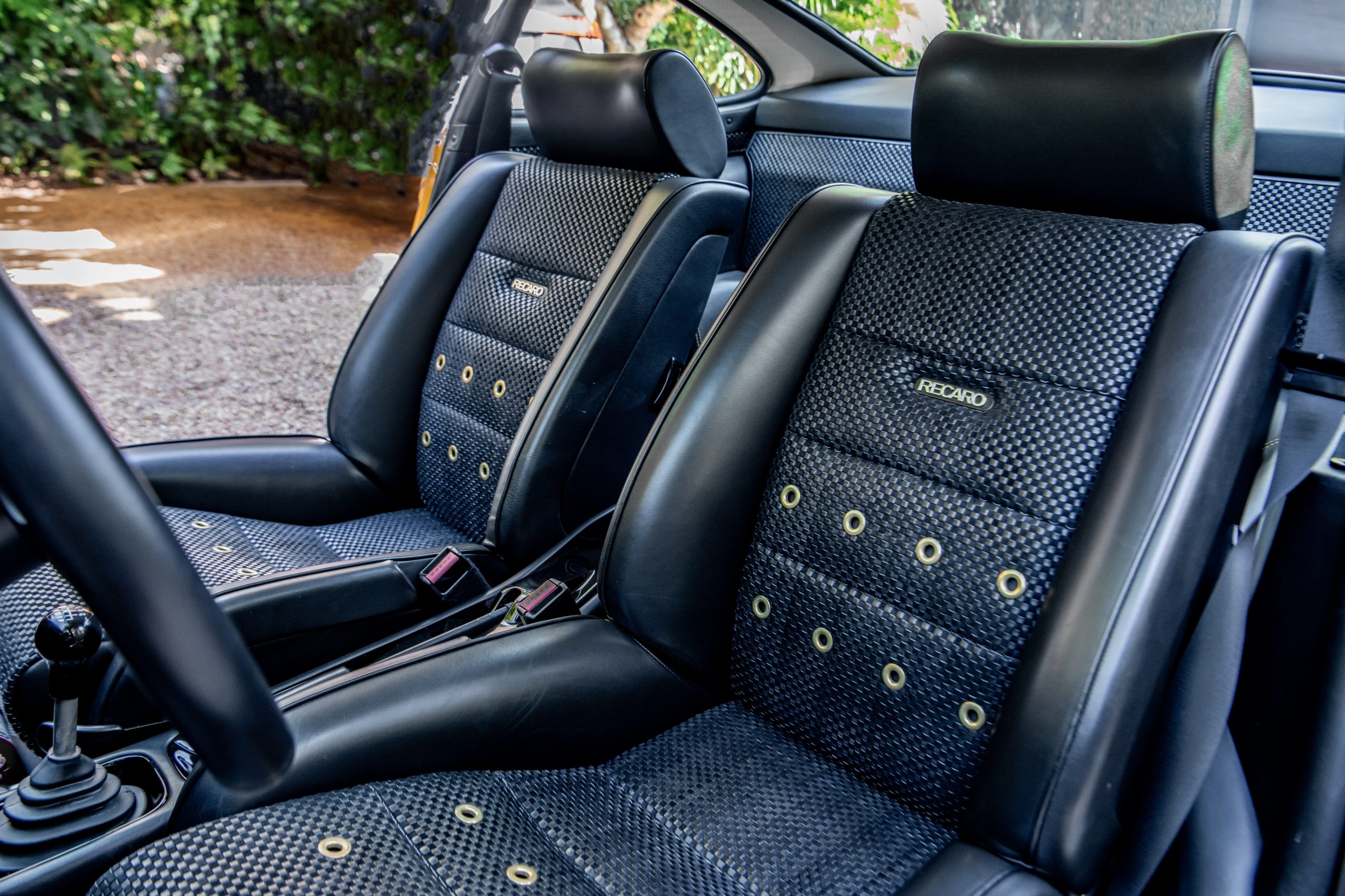 Inside, black leather dominates, complemented by Recaro Touring seats with suede-mix inserts, a leather-wrapped Prototipo steering wheel with yellow stitching, classic-style gauges, square-weave carpeting, and a modern navigation stereo with upgraded subwoofer.