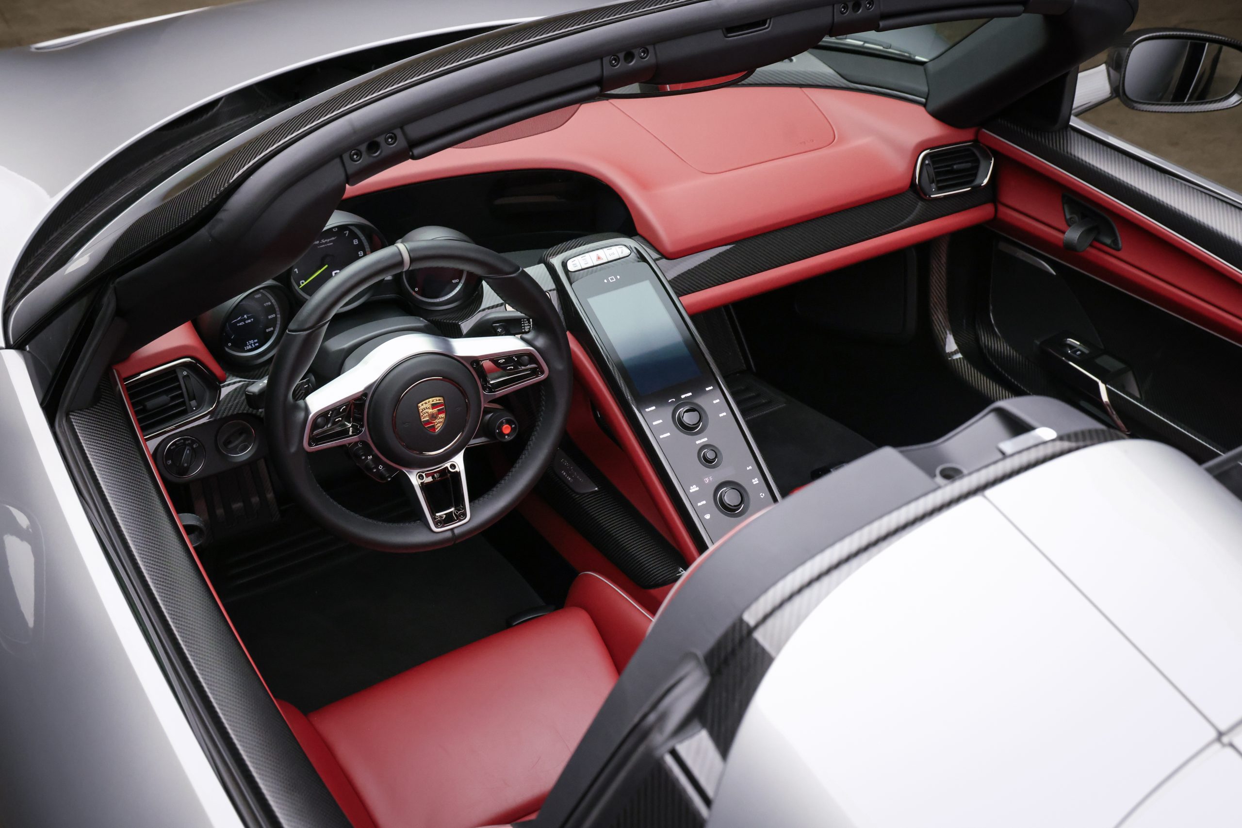 This 2015 Porsche 918 ‘Weissach’ Spyder has extremely low mileage and an array of desirable options. It features a sophisticated GT Silver Metallic exterior paired with a Garnet Red leather interior accented by silver piping and exposed carbon fiber—an elegant and striking combination.