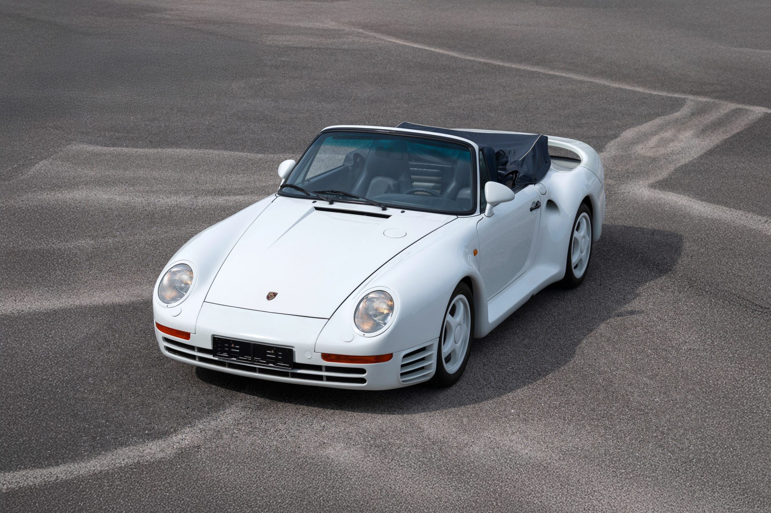 After an autobahn accident, it was acquired by Porsche specialist Karl-Heinz Feustel, who transformed the car into a one-of-a-kind 959 ‘Speedster’. The car featured Grand Prix White paint and a blue leather interior, including an electric soft-top and a removable hardtop. It was displayed at the 1989 Frankfurt and Essen Motor Shows, with an asking price of around $1.2 million.