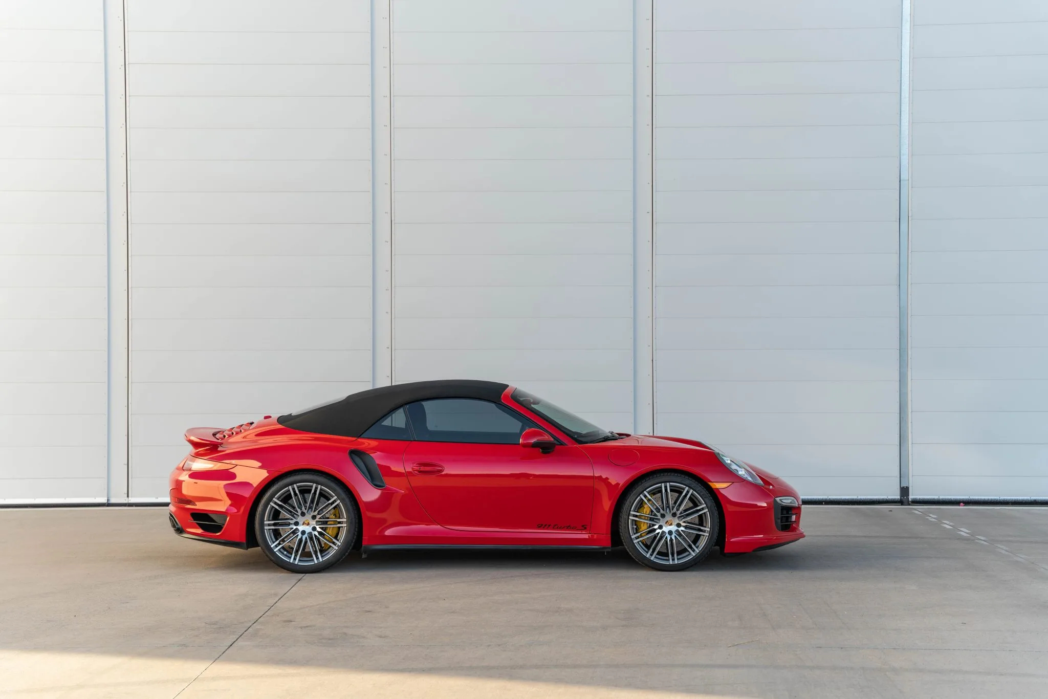 This 2014 Porsche 911 Turbo S Cabriolet was given a Guards Red finish with black 911 Turbo S decals applied to the lower doors. Additional exterior features includes a black convertible soft top, power-folding mirrors, speed-activated rear spoiler, quad exhaust outlets, black side air intakes, and LED headlights with the Porsche Dynamic Light System Plus (PDLS+)