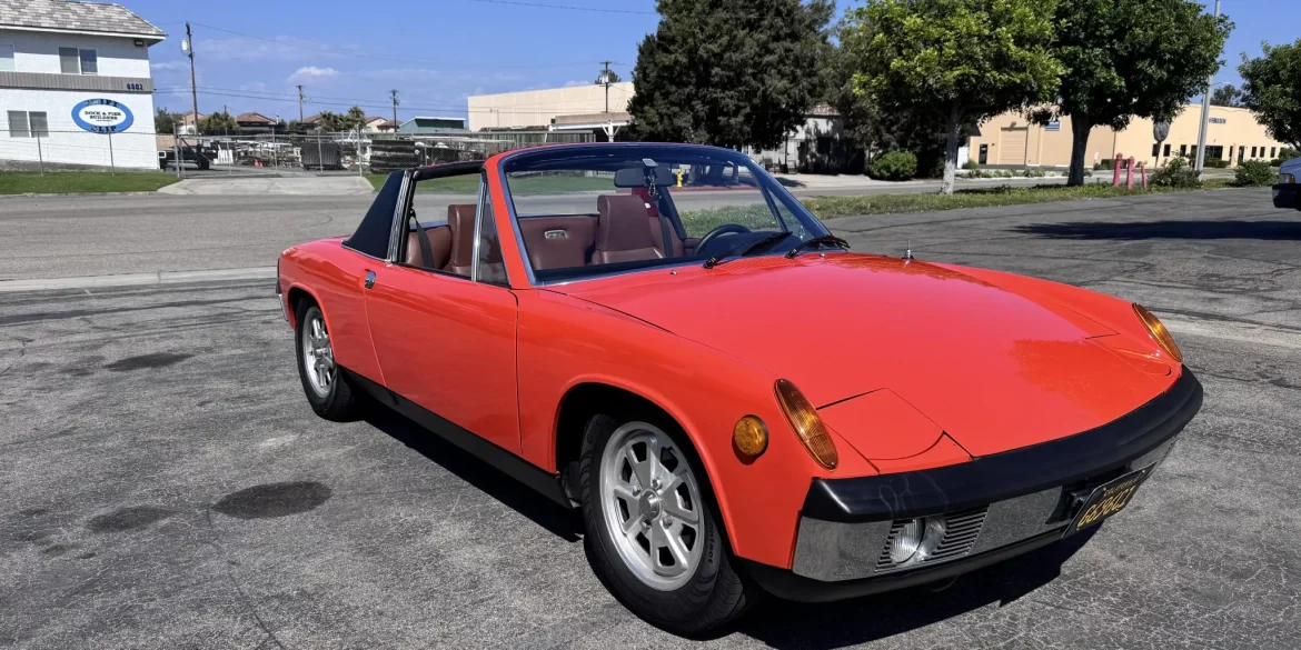 This 1972 Porsche 914 is finished in Tangerine over brown vinyl and is powered by a 1.7-liter flat-four paired with a five-speed manual transaxle. Equipment includes dual carburetors, a condenser and points ignition system, disc brakes, 15″ Fuchs alloy wheels, chrome bumpers, pop-up headlights, a removable Targa roof panel, a cabin...