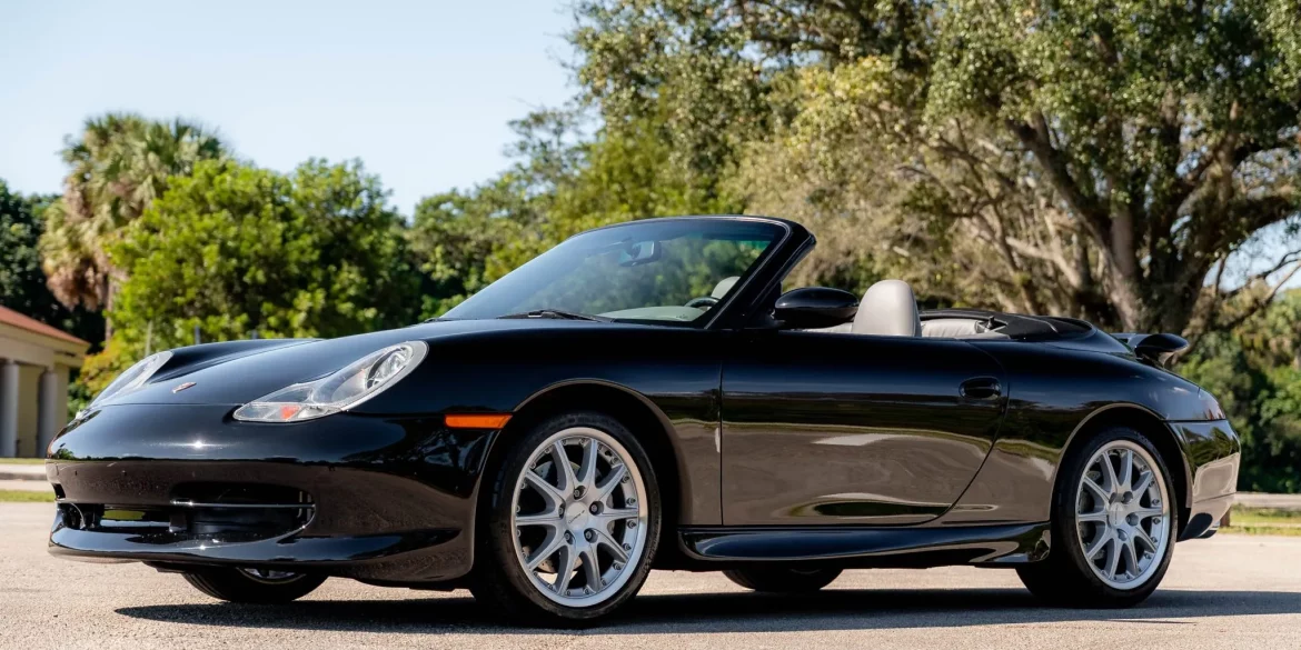 This 2001 Porsche 911 Carrera 4 cabriolet has 18k miles and was ordered with the Aerokit Package, xenon headlights, 18″ Sport Design wheels, carbon-fiber interior trim, a Black soft top, and power-adjustable front seats. Finished in Black over Graphite Grey Supple leather, the convertible is powered by a 3.4-liter M96...