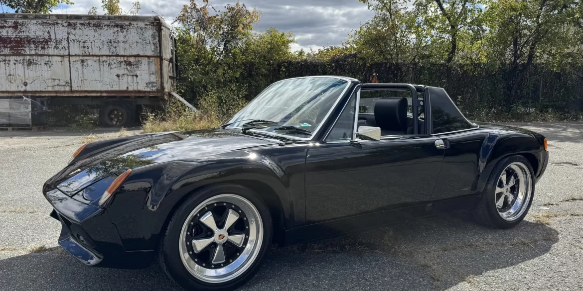 This 1974 Porsche 914 is powered by a 350ci General Motors V8 paired with a five-speed manual transaxle and is finished in Black over Black vinyl. Equipment includes multi-piece 17″ Fuchs-style wheels, a fiberglass 914/6 GT body kit, a removable Targa top, fog lights, a fixed-back BF Torino driver’s seat,...