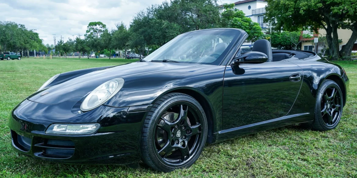 This 2004 Porsche 911 Carrera 4S is a black-over-black cabriolet powered by a 3.6-liter flat-six that drives all four wheels through a six-speed manual transaxle. It features a black convertible top, a Sport exhaust system, xenon headlights, an aftermarket rear spoiler, and 19″ Carrera Sport wheels along with heated power-adjustable...