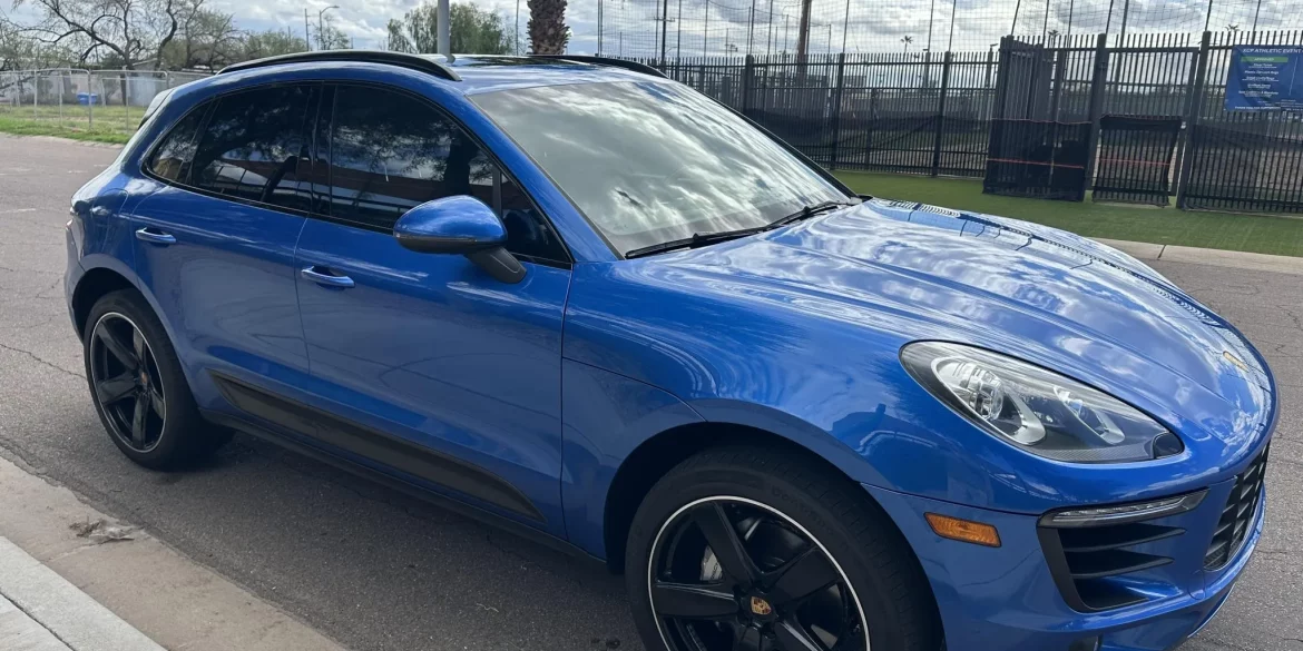 This 2016 Porsche Macan S is finished in Sapphire Blue Metallic over Black Standard leather and is equipped with the Premium Plus, Infotainment, Sport Chrono, and Carbon Fiber Interior packages as well as 21″ Sport Classic wheels, a panoramic sunroof, a heated carbon-fiber steering wheel, PCM with navigation, and xenon...