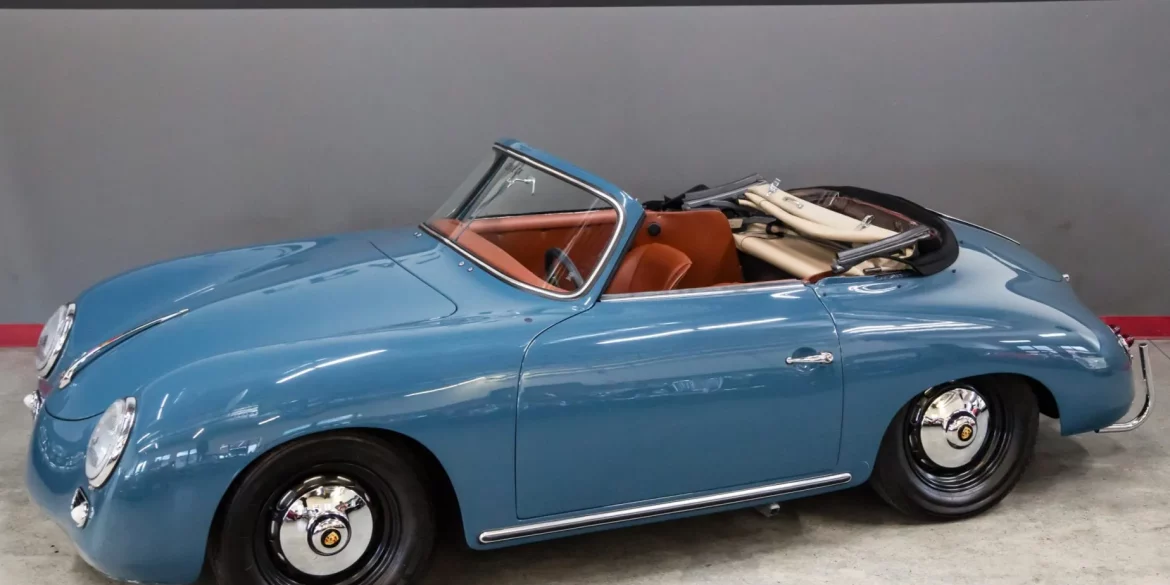 This 1957 Porsche 356A cabriolet was repainted Aquamarine Blue, and its replacement flat-four was fitted with a big-bore kit in the mid-2010s. The cabin houses Speedster-style seats trimmed in brown leather along with latch-and-link lap belts, a MOMO steering wheel, and an EMPI shifter. Additional equipment includes a four-speed manual...