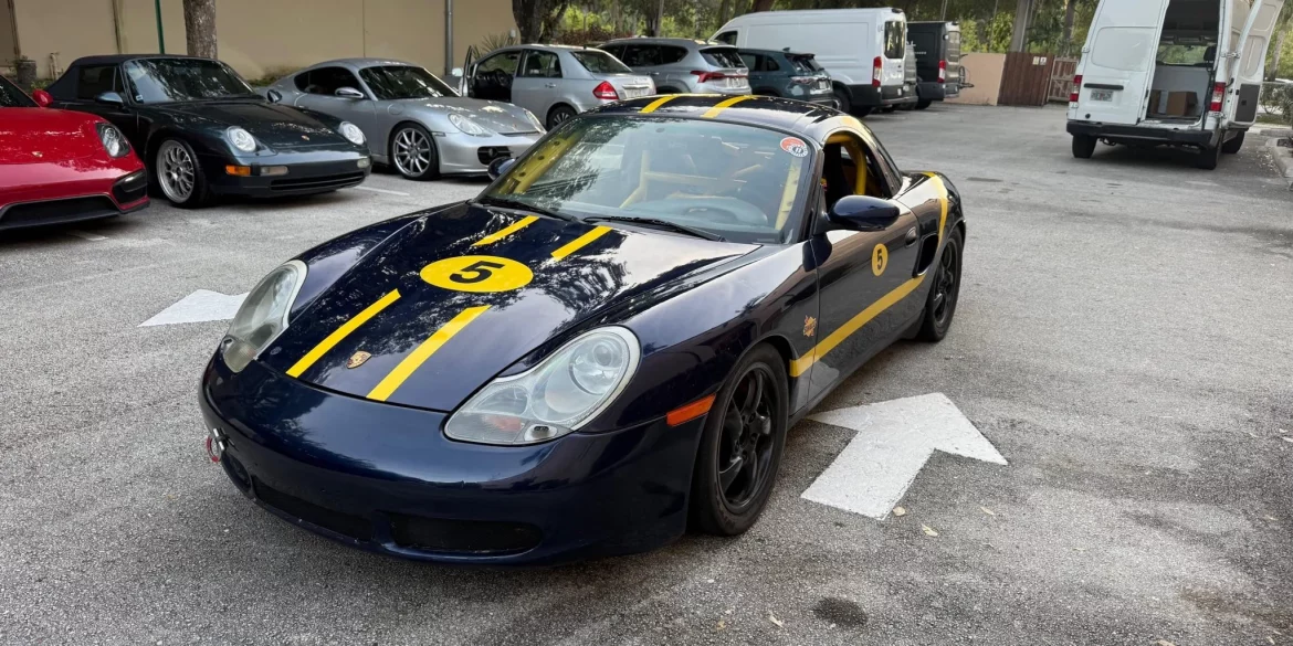 This 2002 Porsche Boxster S was modified for track use under previous ownership. It is finished in blue with a removable hardtop and features a stripped interior with a roll cage, a Sparco bucket seat, and a removable OMP steering wheel. Power is provided by a 3.2-liter flat-six paired with a...