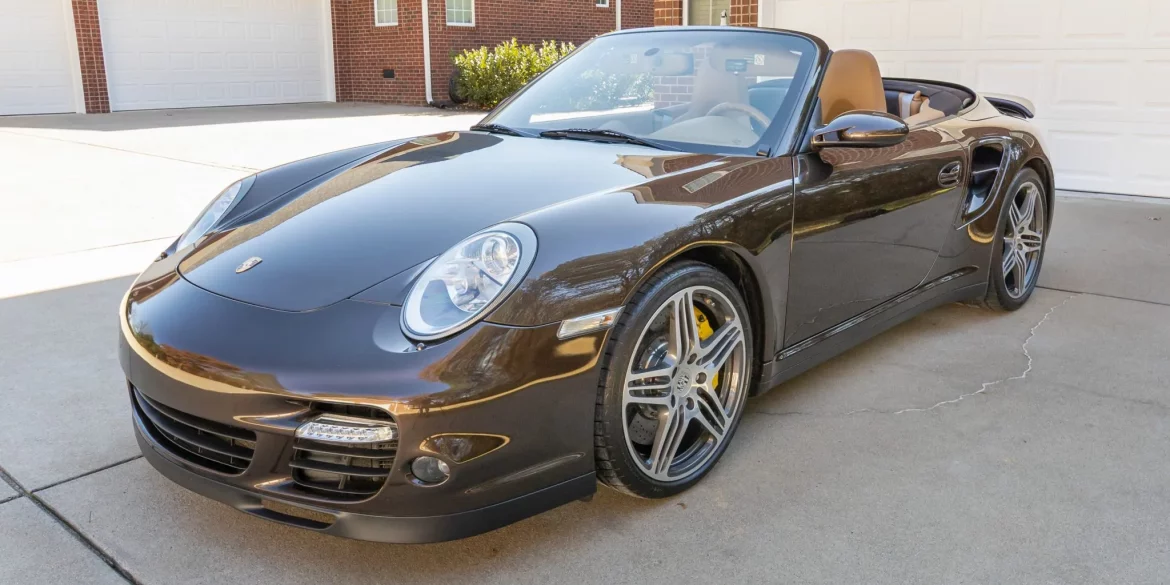 This 2008 Porsche 911 Turbo cabriolet spent time in Europe under previous ownership and is finished in Macadamia Metallic over Sand Beige and black leather. The car now has 12k miles and is powered by a twin-turbocharged 3.6L flat-six that drives all four wheels via a five-speed Tiptronic S automatic transaxle....