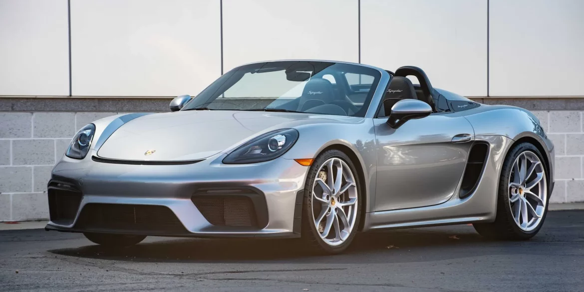 This 2020 Porsche 718 Spyder has 385 miles and is finished in GT Silver Metallic over black leather and Alcantara upholstery. Powered by a 4.0-liter flat-six paired with a six-speed manual transaxle, the car is equipped with a limited-slip differential with Porsche Torque Vectoring, the Sport Chrono Package, 20″ 718...