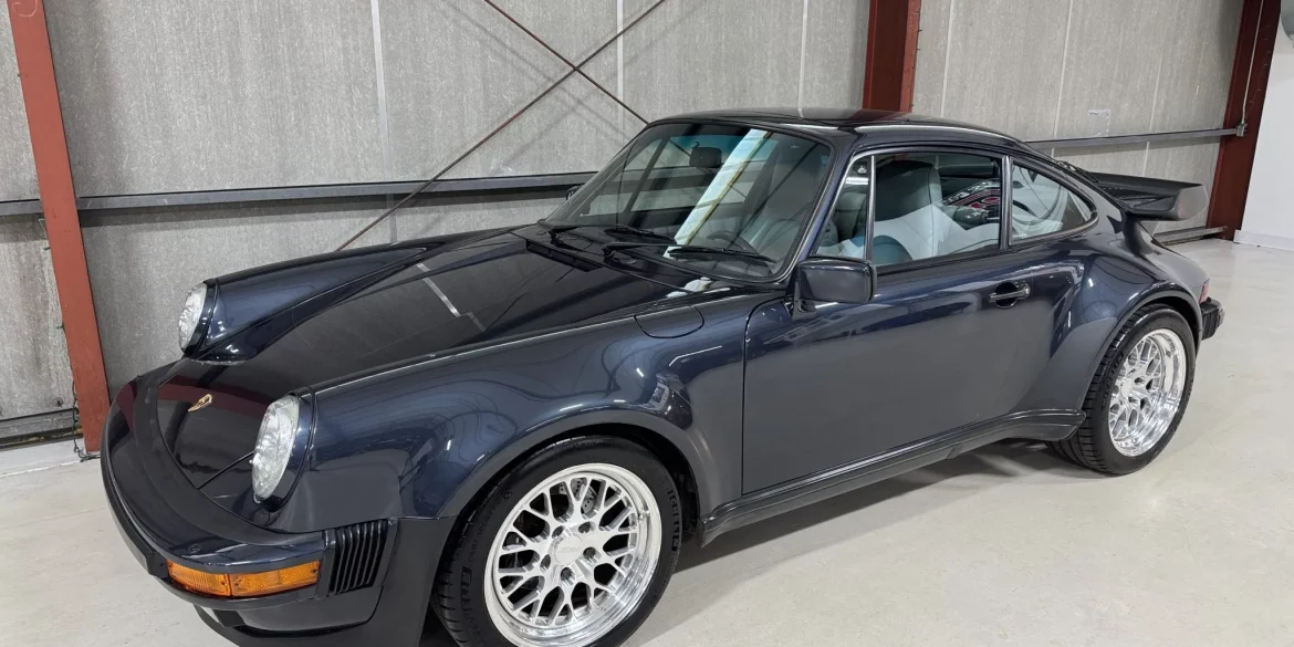 This 1987 Porsche 911 Turbo coupe is finished in metallic blue over gray leather upholstery and is powered by a turbocharged 3.3-liter flat-six that has been modified with a K27 turbocharger, an Andial fuel-enrichment system, and an aftermarket intercooler, airbox, exhaust, and camshafts. Shifting is through a four-speed manual transaxle...