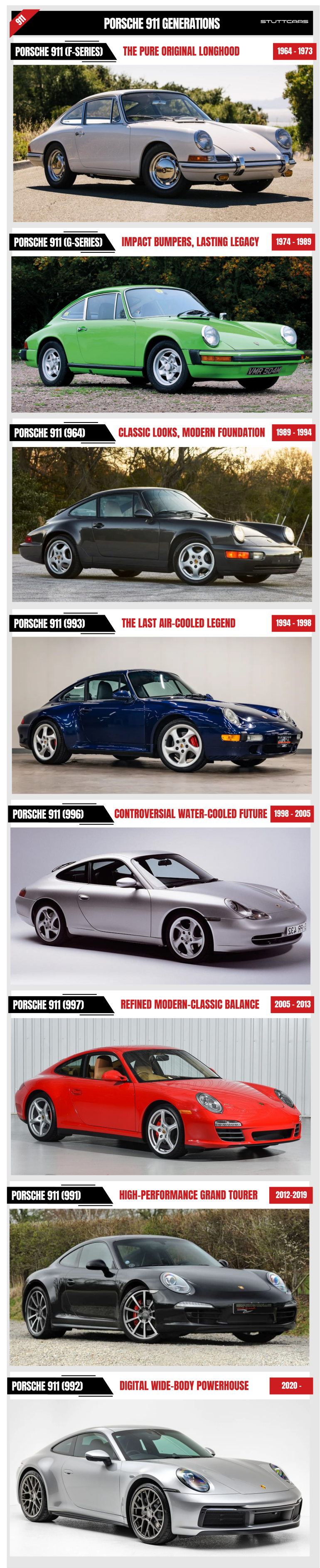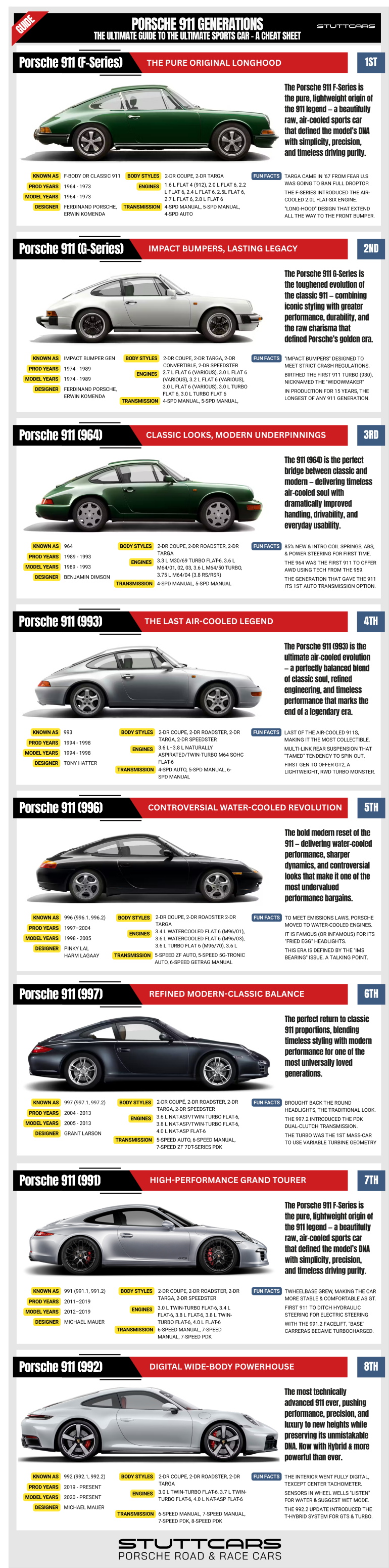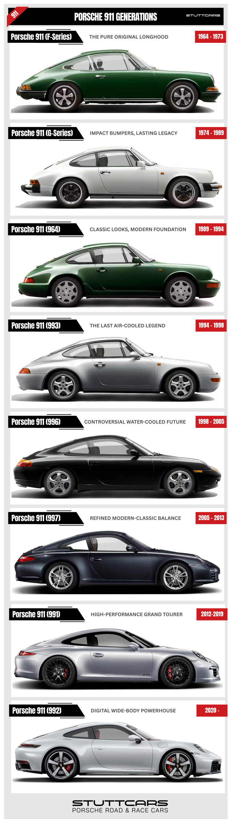 You’ll find clear summaries of every 911 generation, from classic F-Series and G-Series models through the 964, 993, 996, 997, 991 and the current 992 lineup. We explain how each era differs in performance, design, technology, and driving experience — helping you understand how the 911 transformed while staying true to its roots.