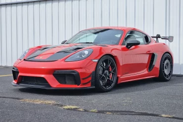 This 2023 Porsche 718 Cayman GT4 RS is finished in Guards Red over Black leather and Arctic Gray Race-Tex and...