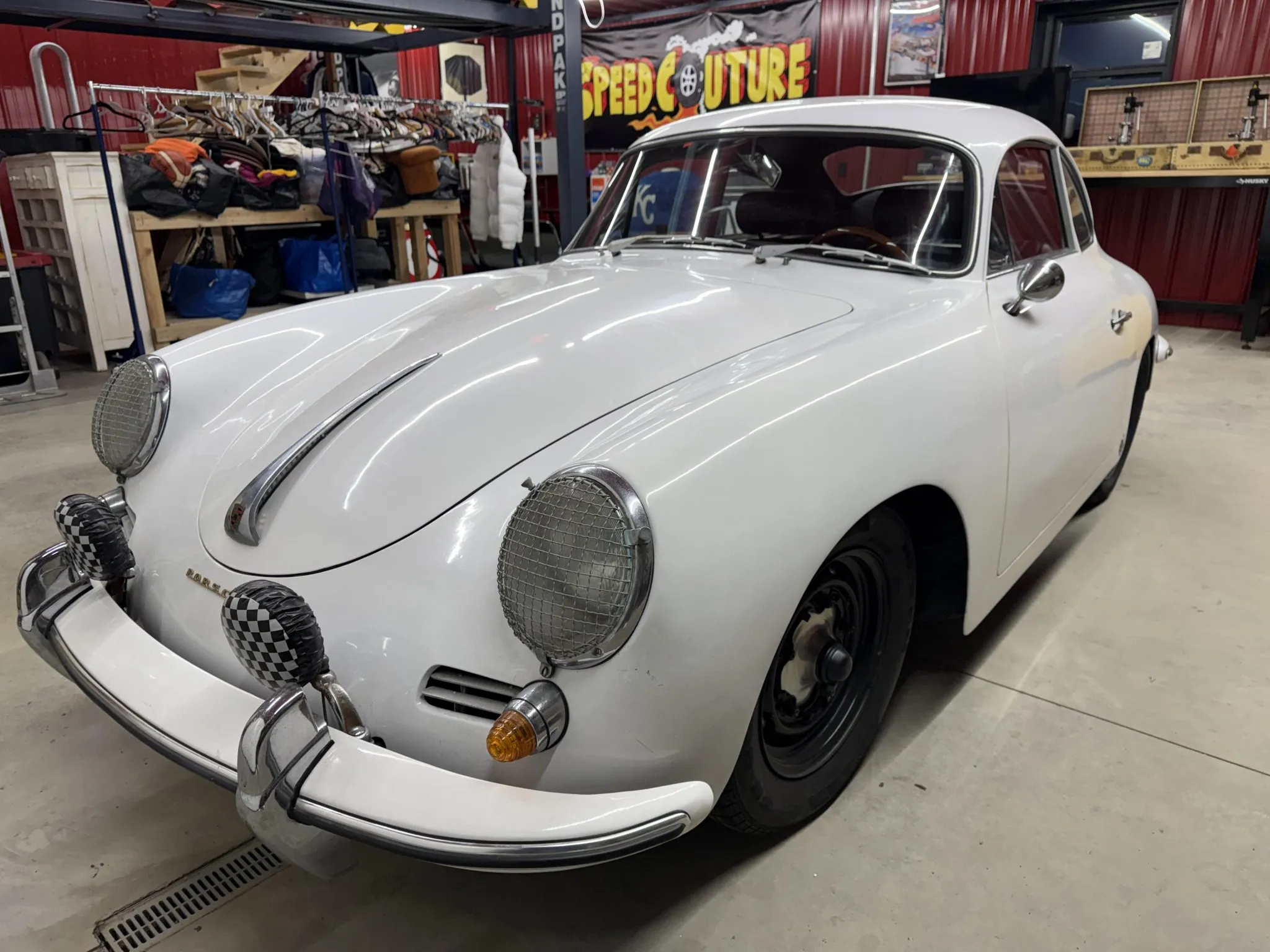 This 1960 Porsche 356B coupe is a Reutter-built T5 body finished in white over black leather and is powered by a replacement 1.6-liter flat-four paired with a four-speed manual transaxle.