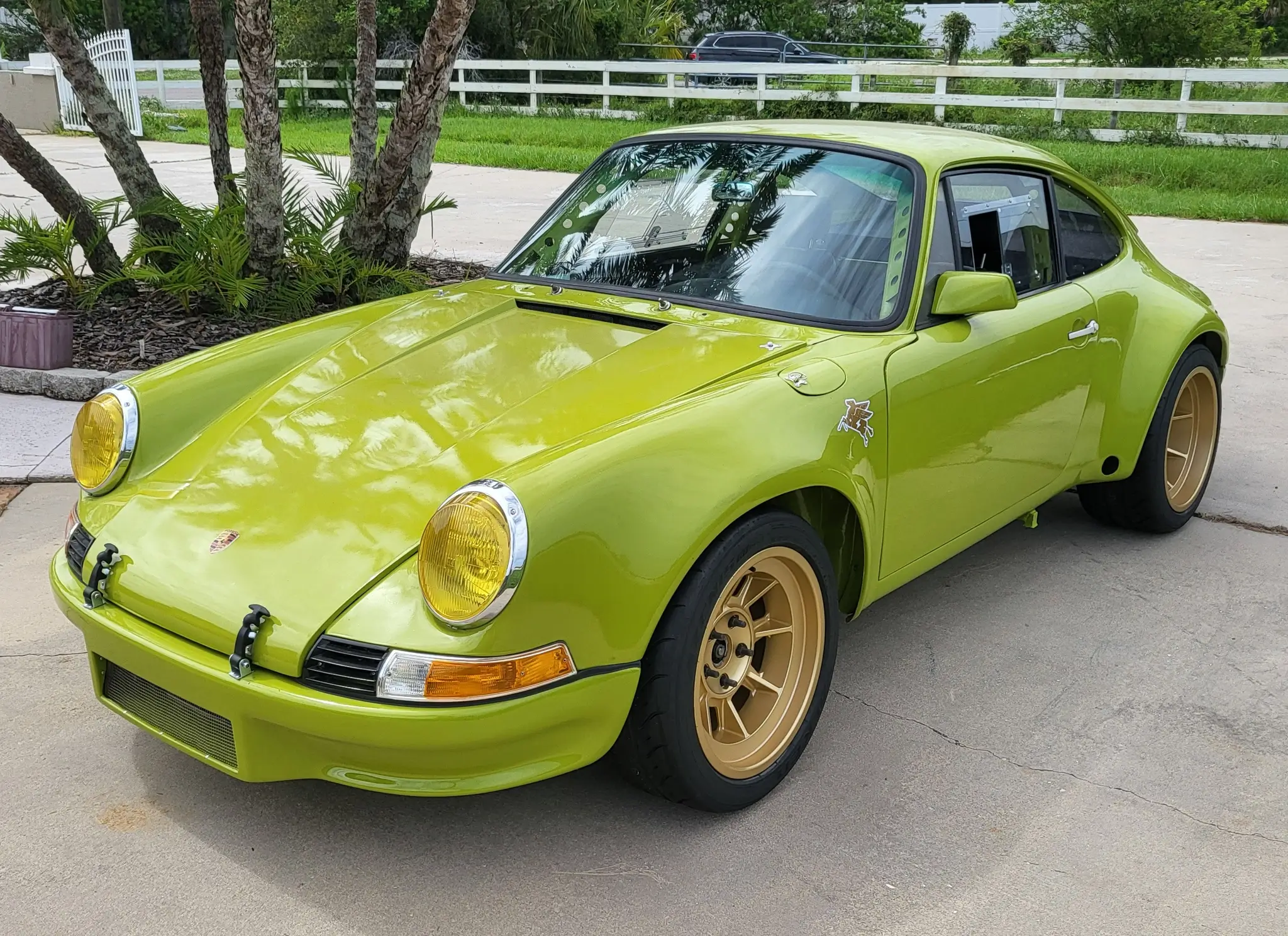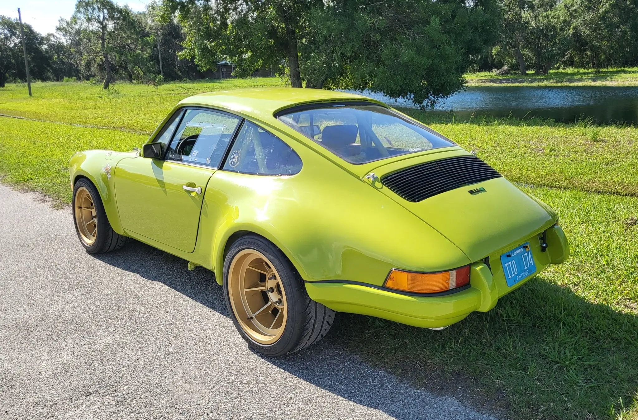 Equipment includes an EV West-sourced Tesla Model S Large Drive Unit, a Tesla Model S cooling system, GPS-based traction control, a lightweight driver-focused interior with Rennline components, a “big” front brake kit, Boxster rear brakes, RS-style bodywork, wide fenders, polycarbonate windows with sliders, Campagnolo-style wheels, a body-color roll cage, and RS-style bucket seats. This custom 912 EV is now being offered for auction out of Florida.