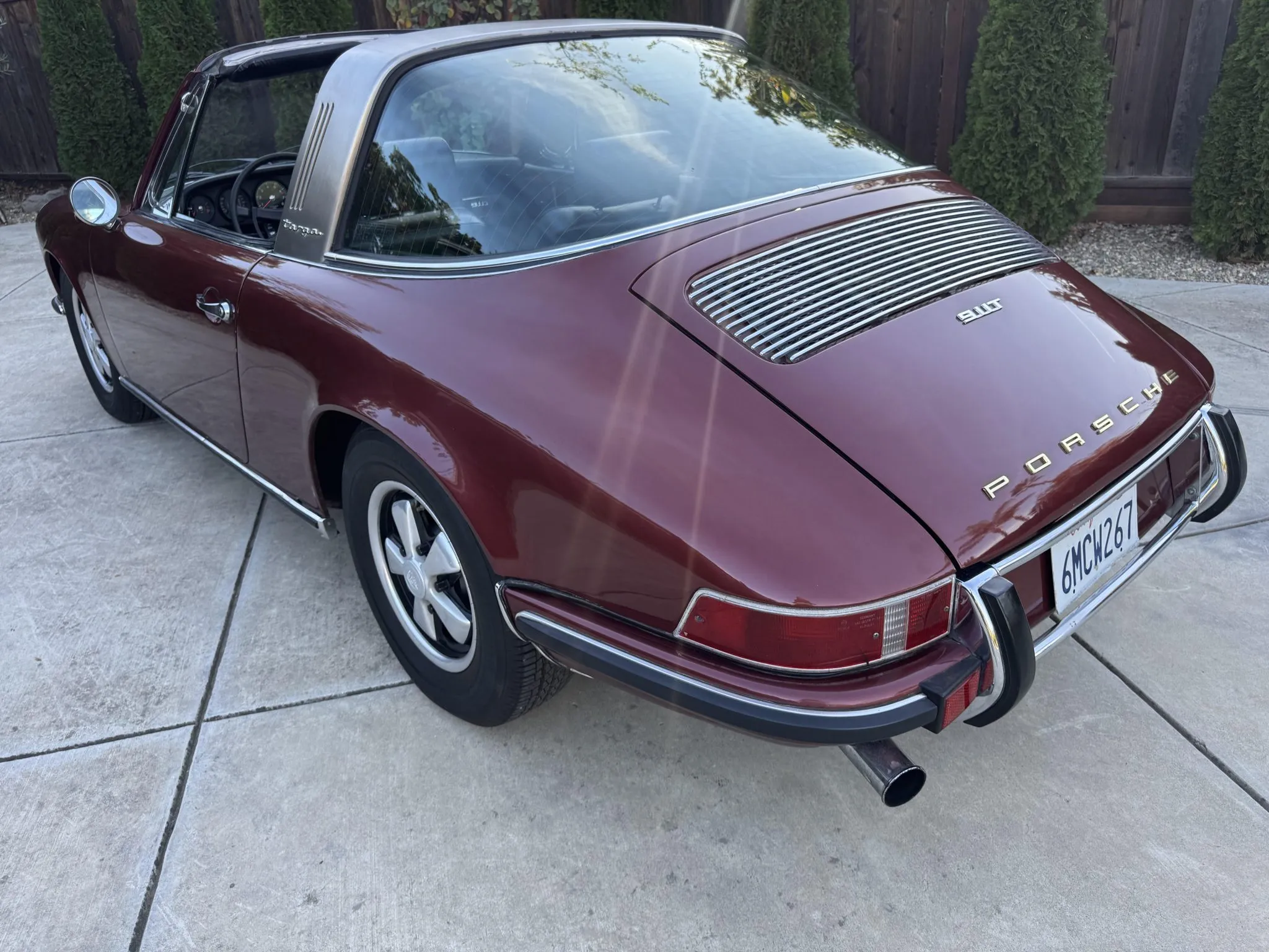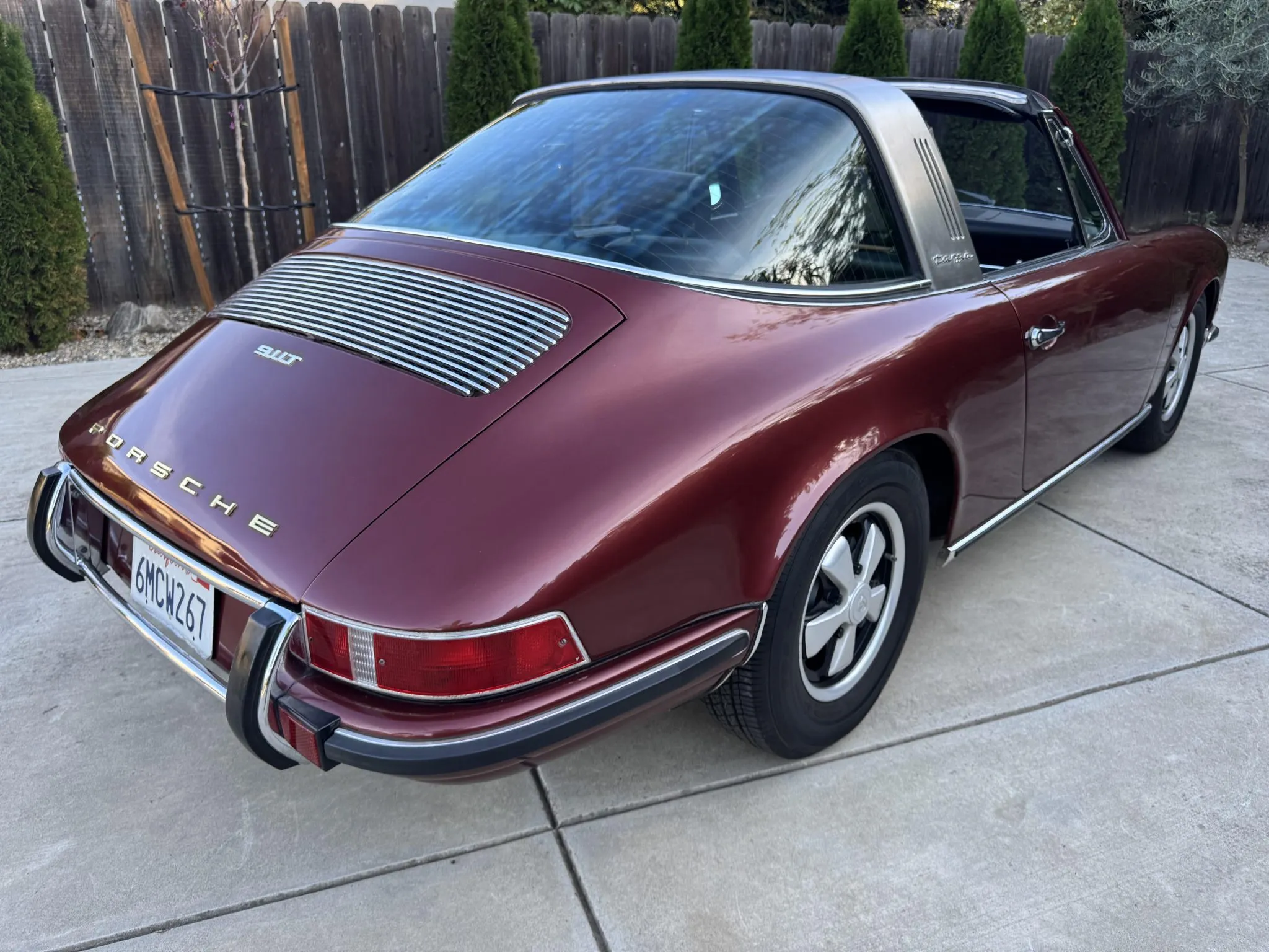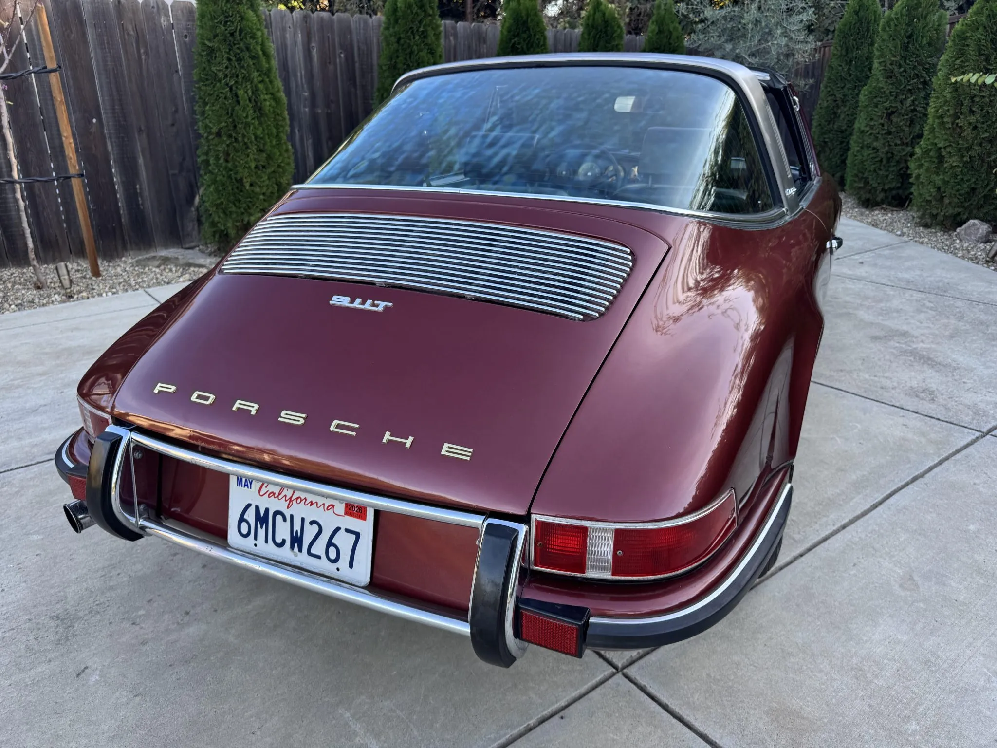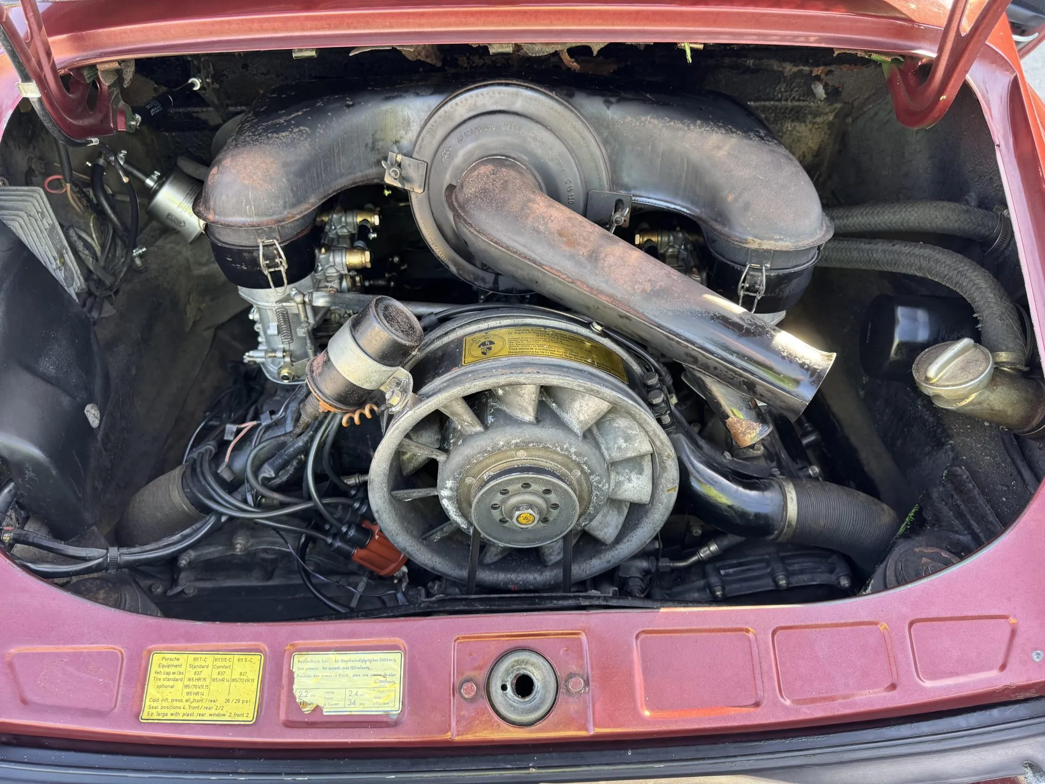 It was repainted burgundy before that time, and in 2025 the car was refurbished with an overhaul of the brake system, a replacement clutch for the five-speed 901 manual transaxle, and a rebuild of the twin Weber carburetors for the 2.2-liter flat-six.