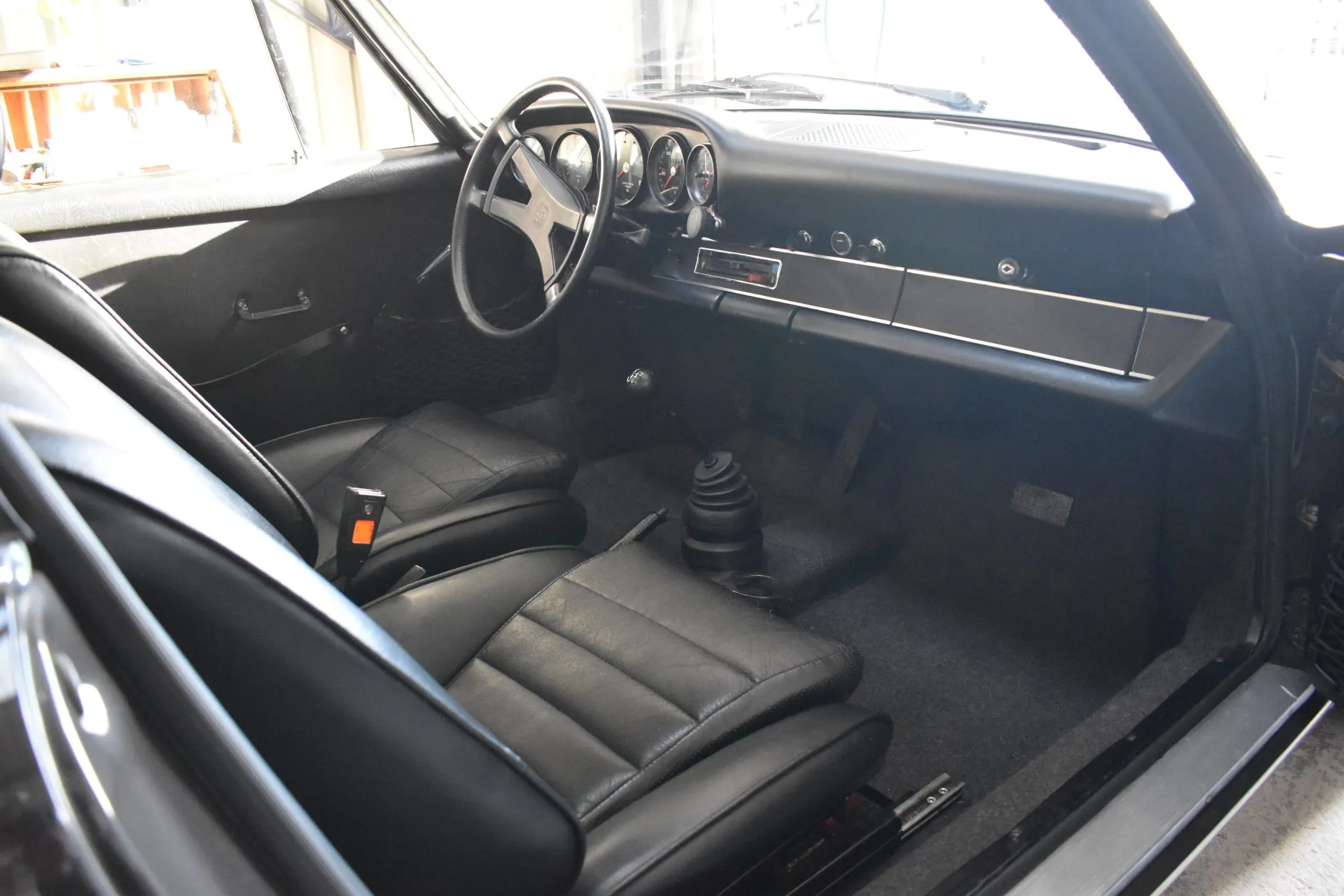 Repainted Gray Black over black leather, the car is powered by a 2.4-liter flat-six equipped with Bosch mechanical fuel injection and linked with a 915 five-speed manual transaxle and a limited-slip differential. Equipment includes a front spoiler, an aftermarket rear bumper, 15″ Fuchs alloy wheels, sport seats, and a heater.