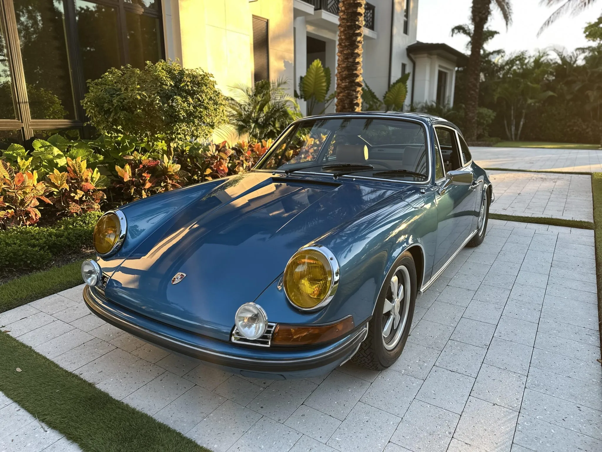 This 1973.5 Porsche 911T coupe is powered by a 2.4-liter flat-six equipped with dual Weber carburetors and linked with a five-speed manual transaxle and is finished in Blue Metallic over beige leather.