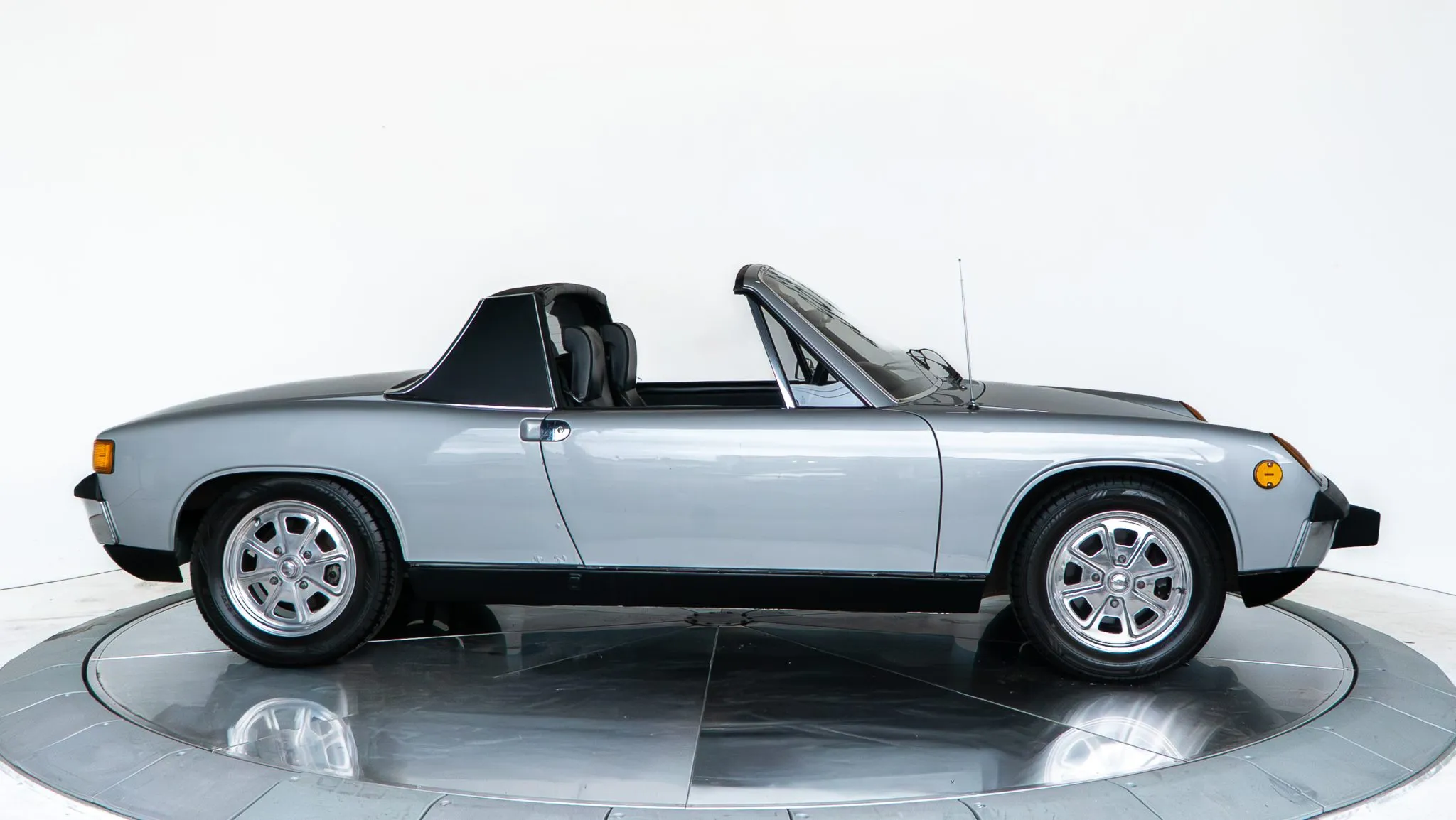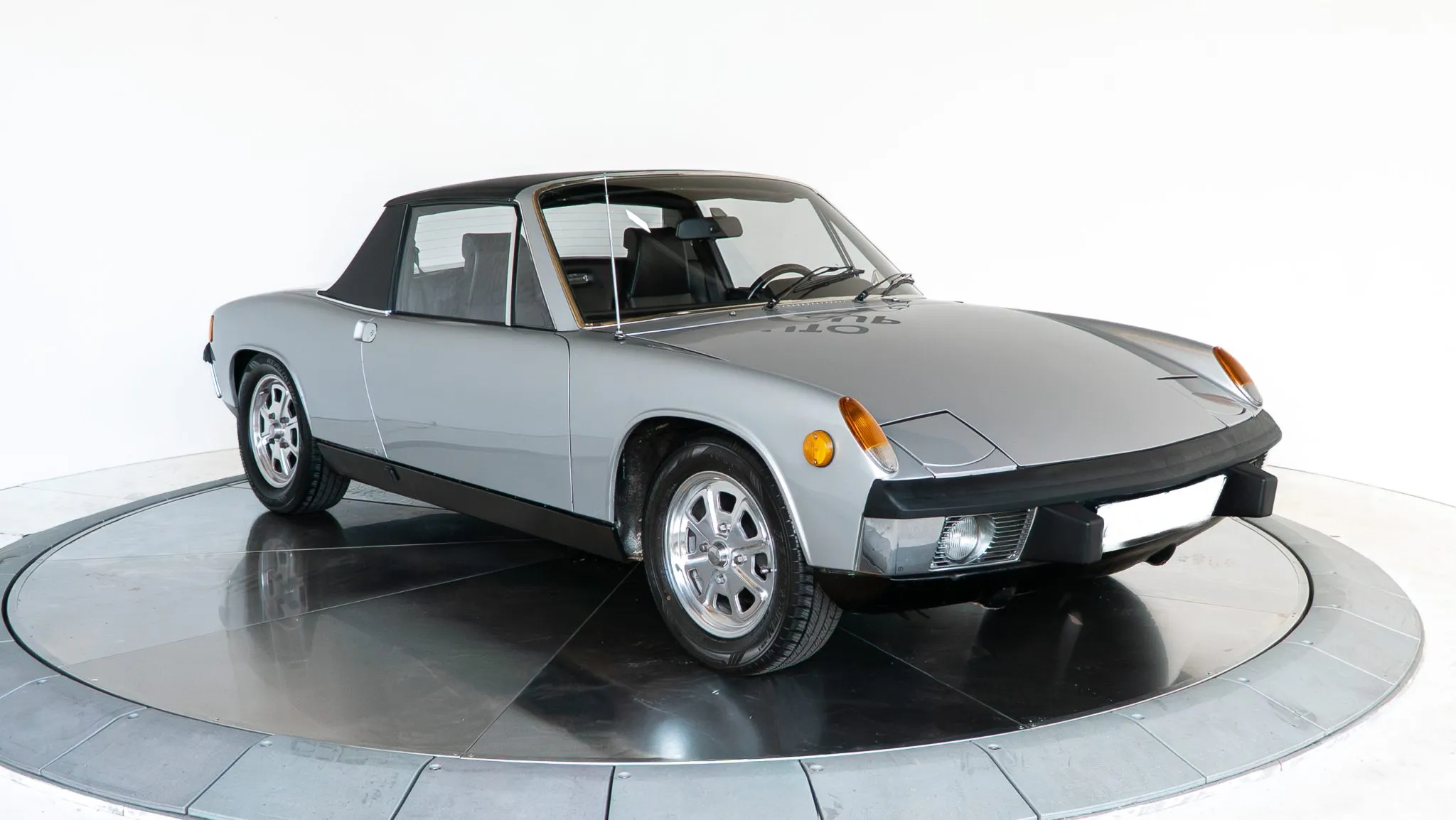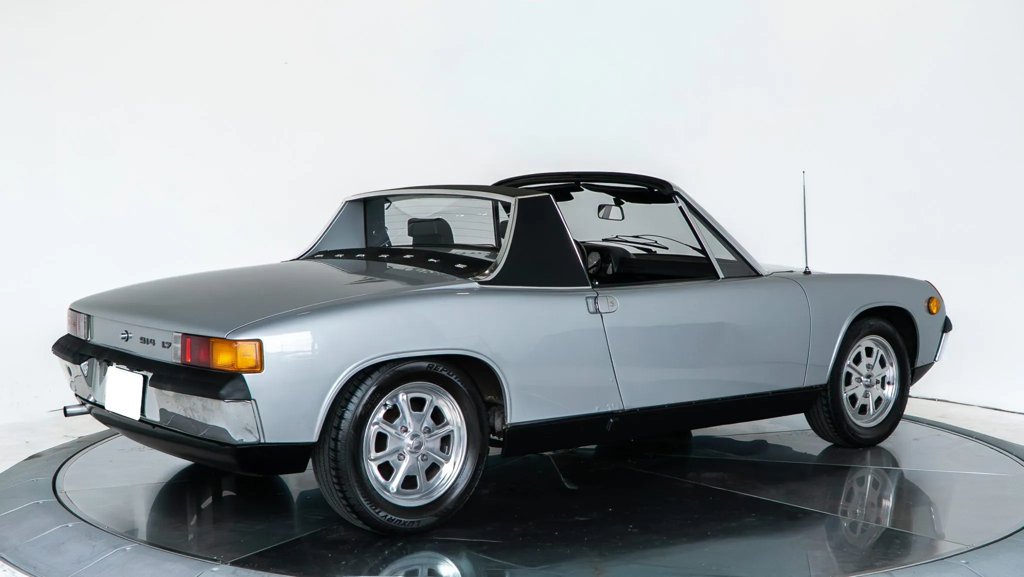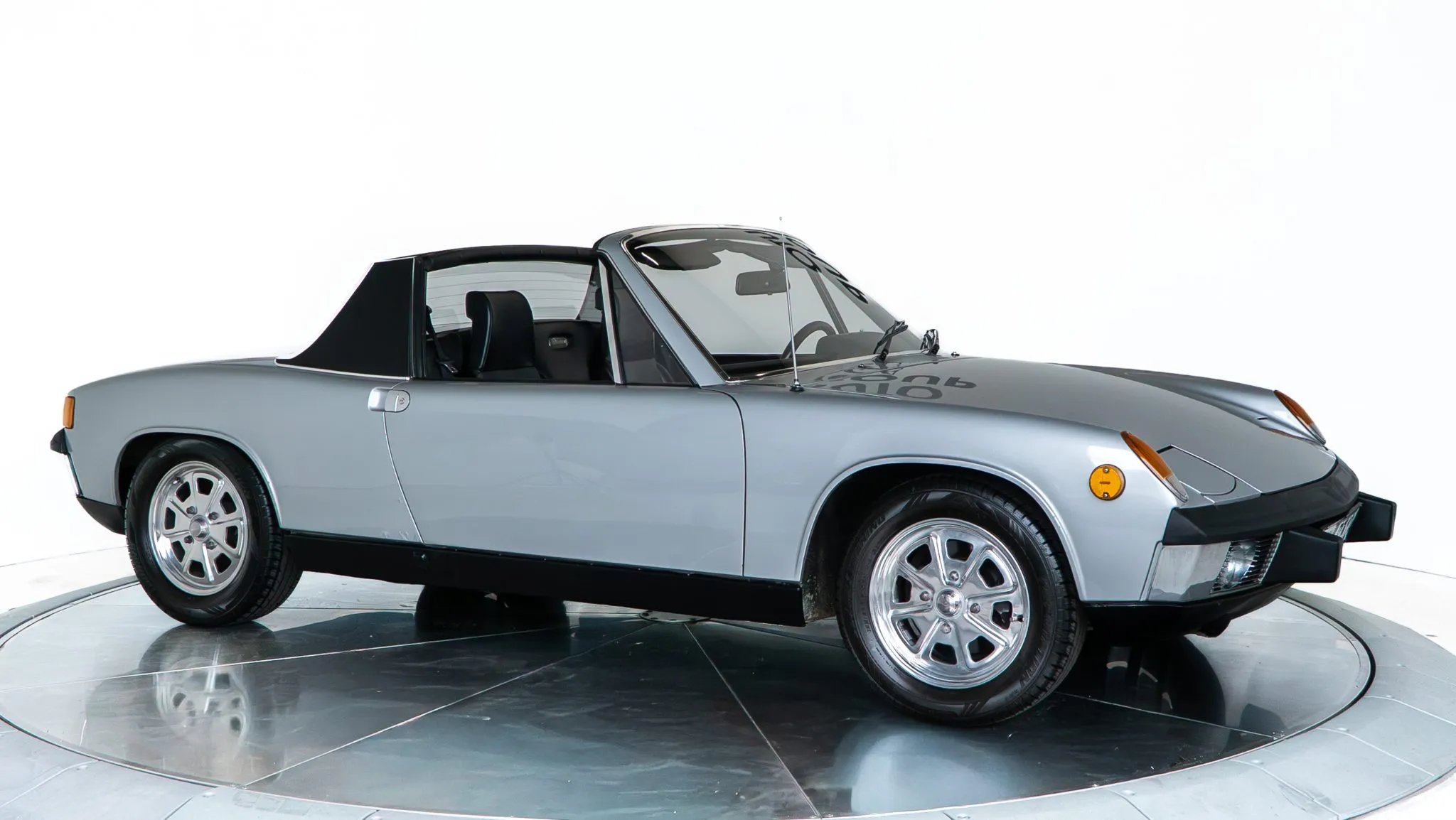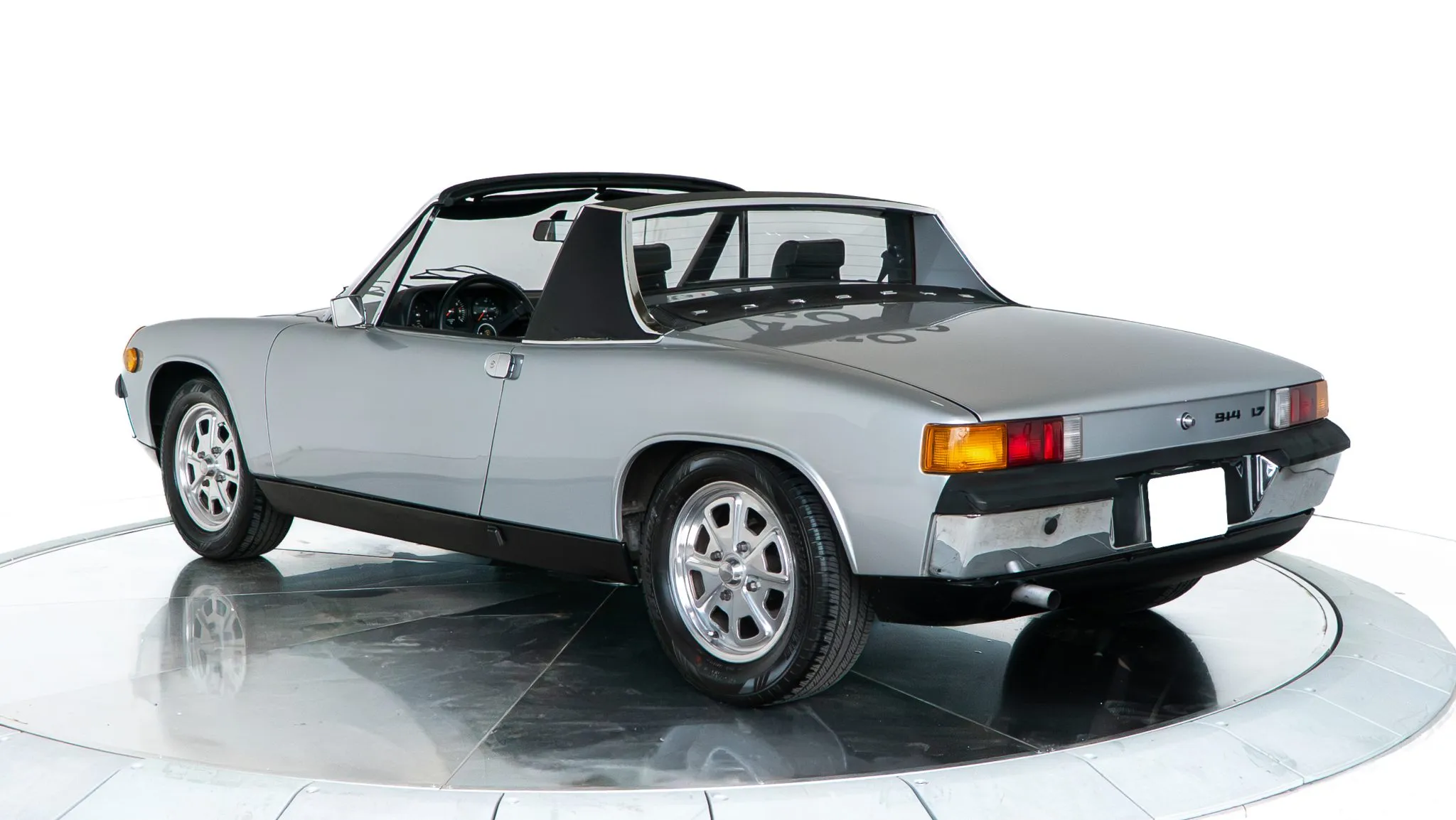 This 1973 Porsche 914 is finished in silver over black vinyl and is powered by a 1.7-liter flat-four paired with a five-speed manual transaxle.