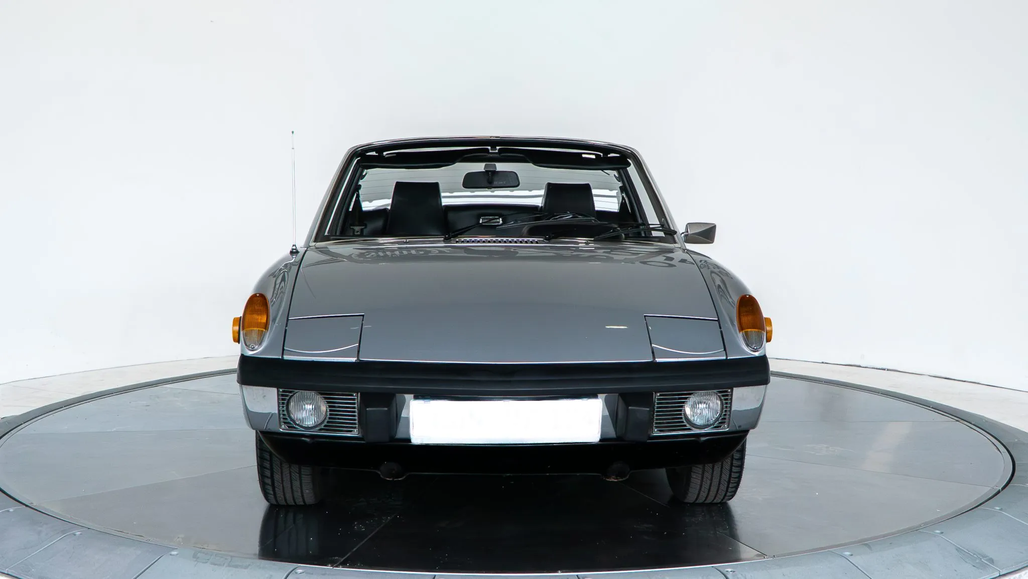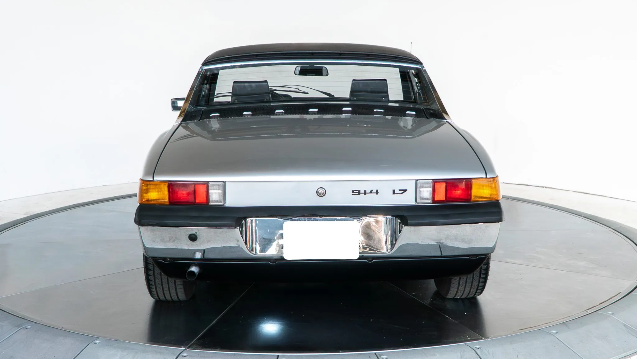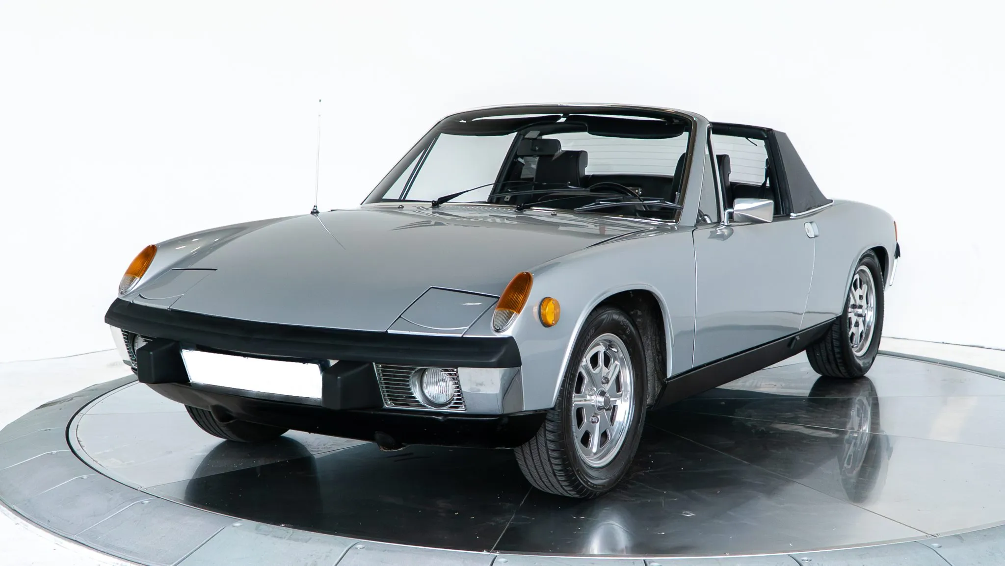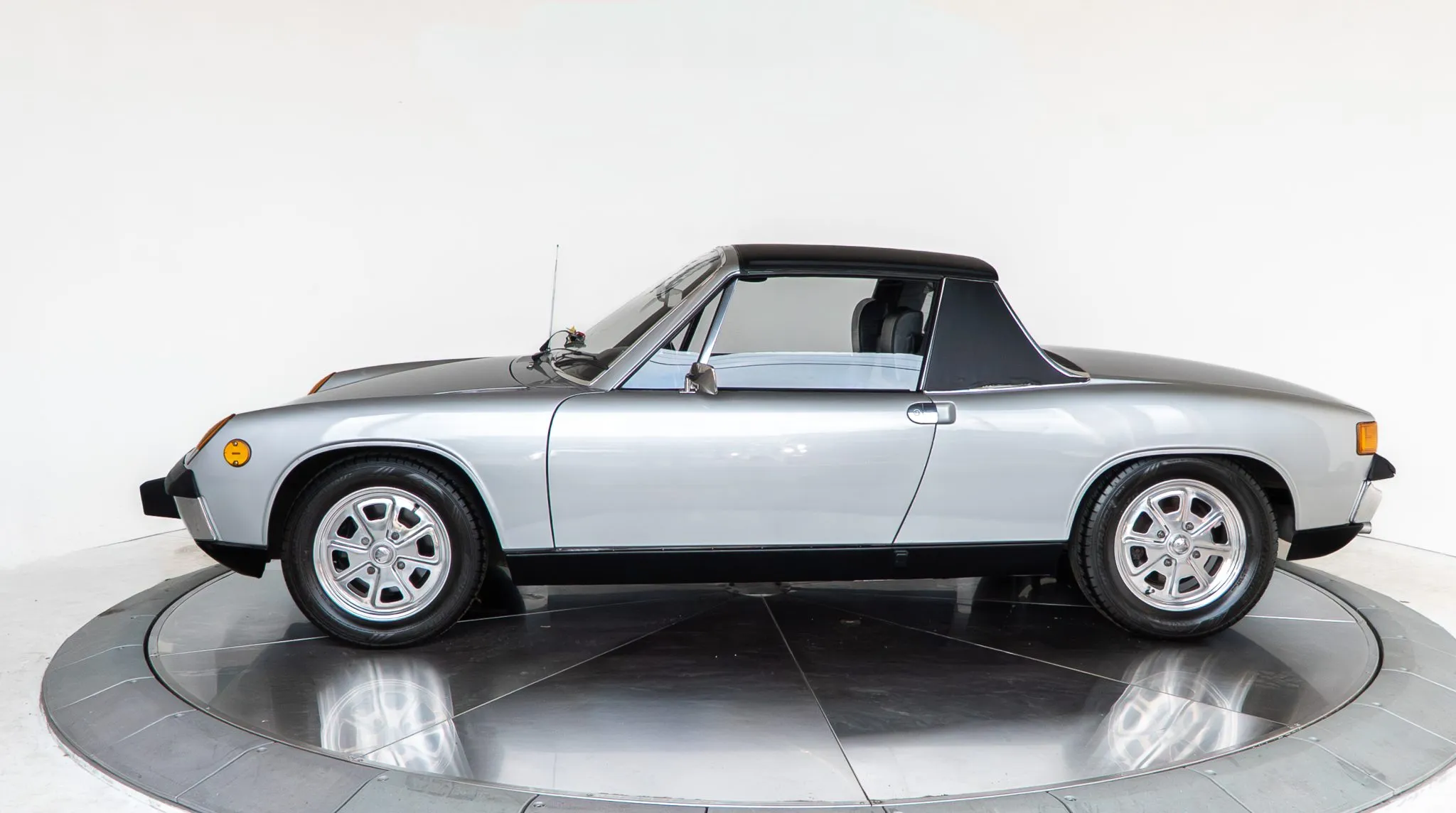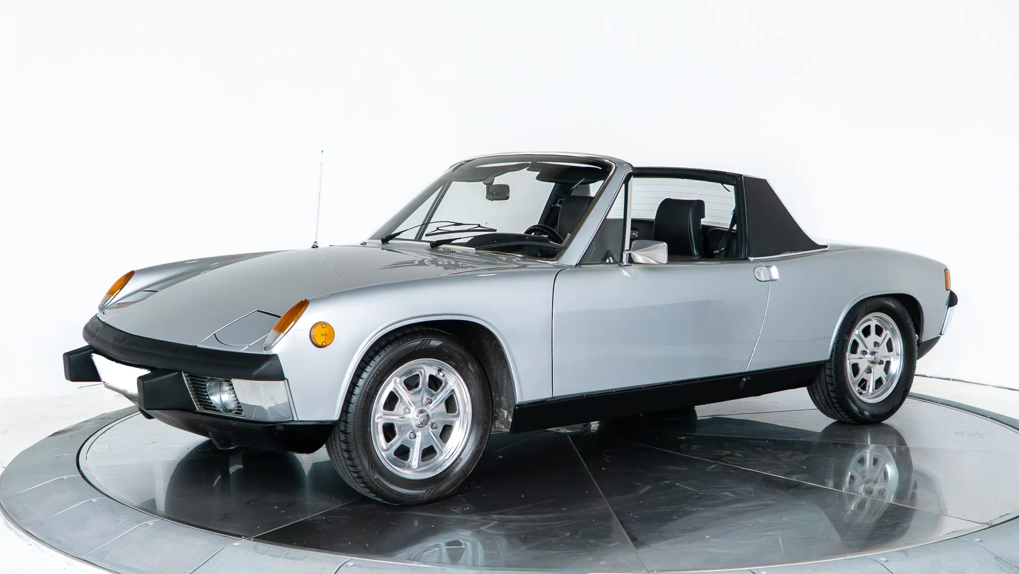This 1973 Porsche 914 is finished in silver over black vinyl and is powered by a 1.7-liter flat-four paired with a five-speed manual transaxle.