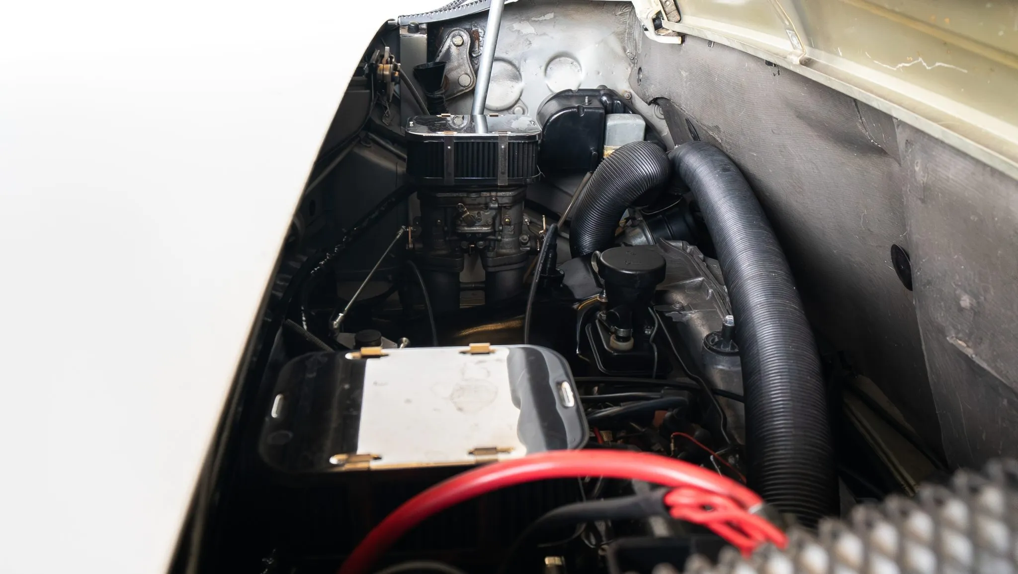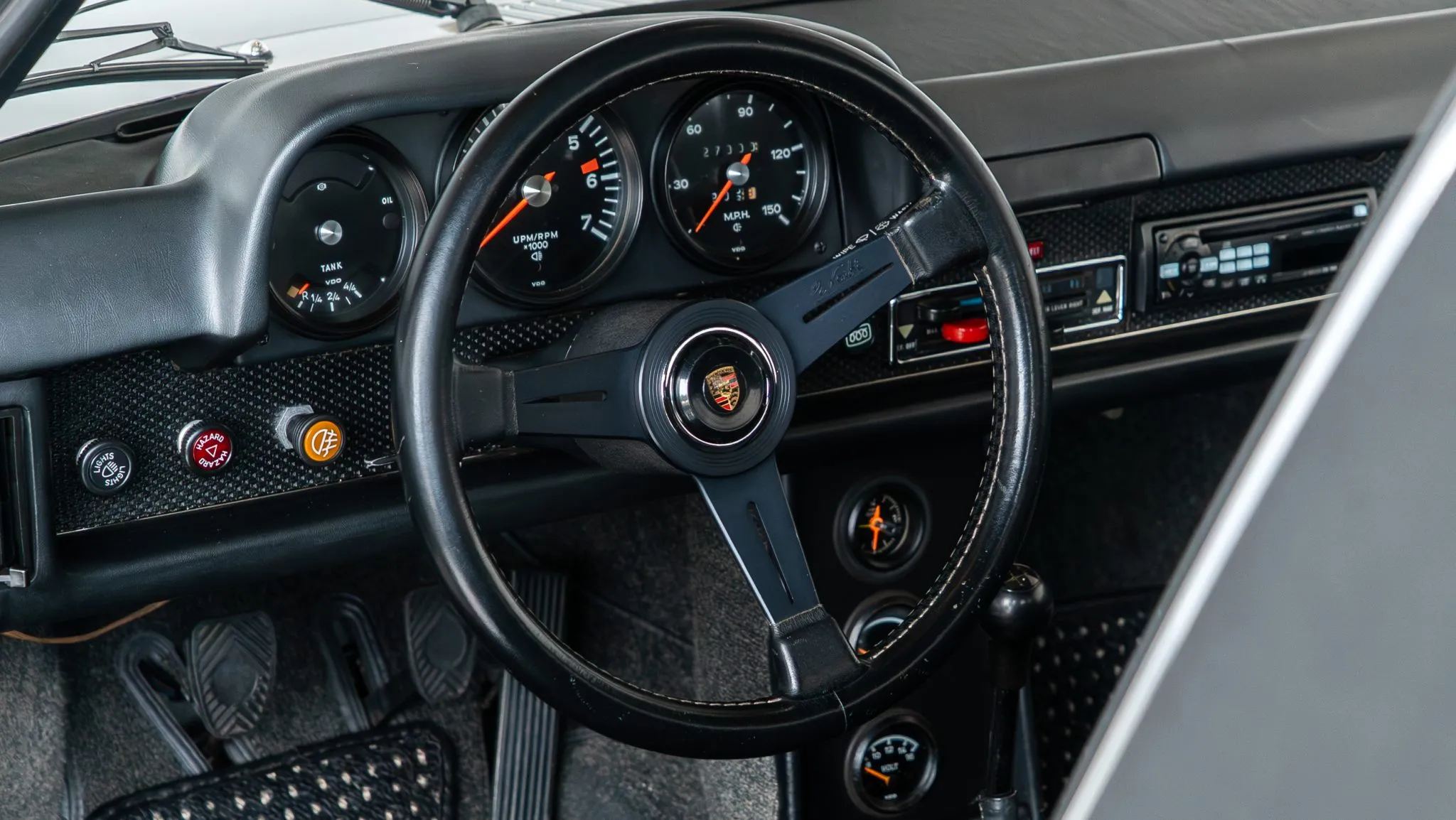 Equipment includes dual Weber carburetors, disc brakes, 15″ Fuchs alloy wheels, chrome bumpers, pop-up headlights, a removable Targa roof panel, a cabin heater, crank windows, and an Alpine CD stereo.
