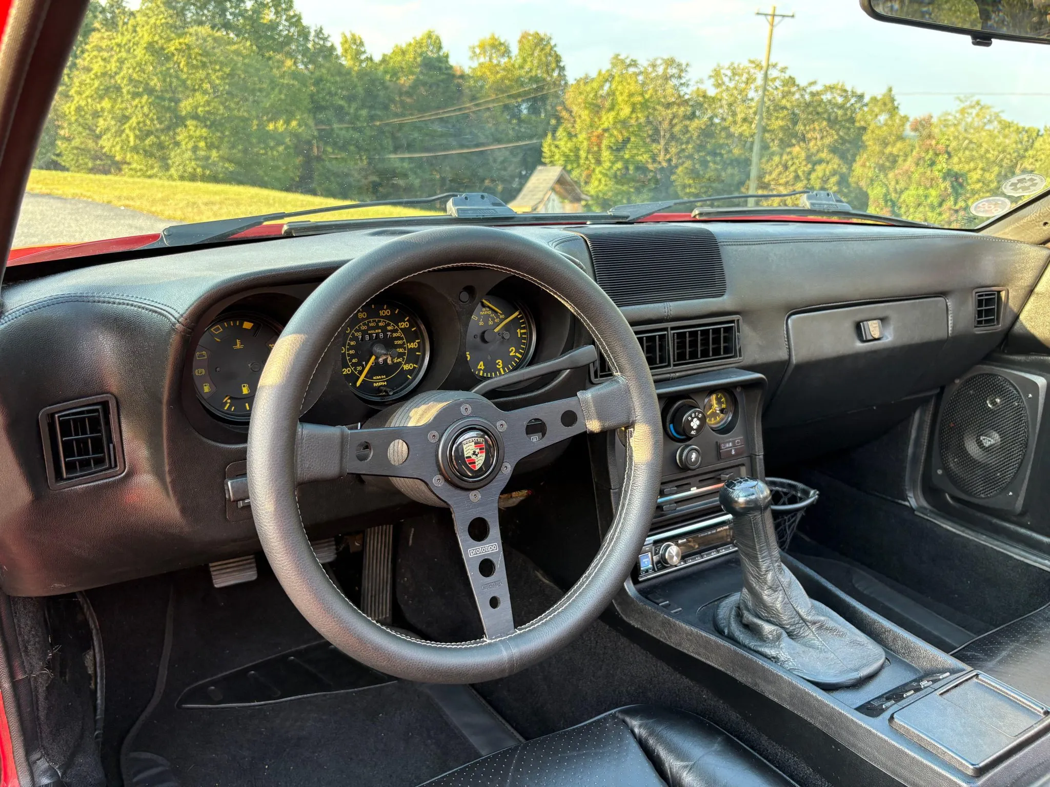 It is finished in Guards Red over black leather and is powered by a 2.5-liter inline-four paired with a five-speed manual transaxle. Equipment includes 15″ cookie-cutter alloy wheels, a sunroof, pop-up headlights, fog lights, a Momo Prototipo steering wheel, an Alpine head unit, and air conditioning.