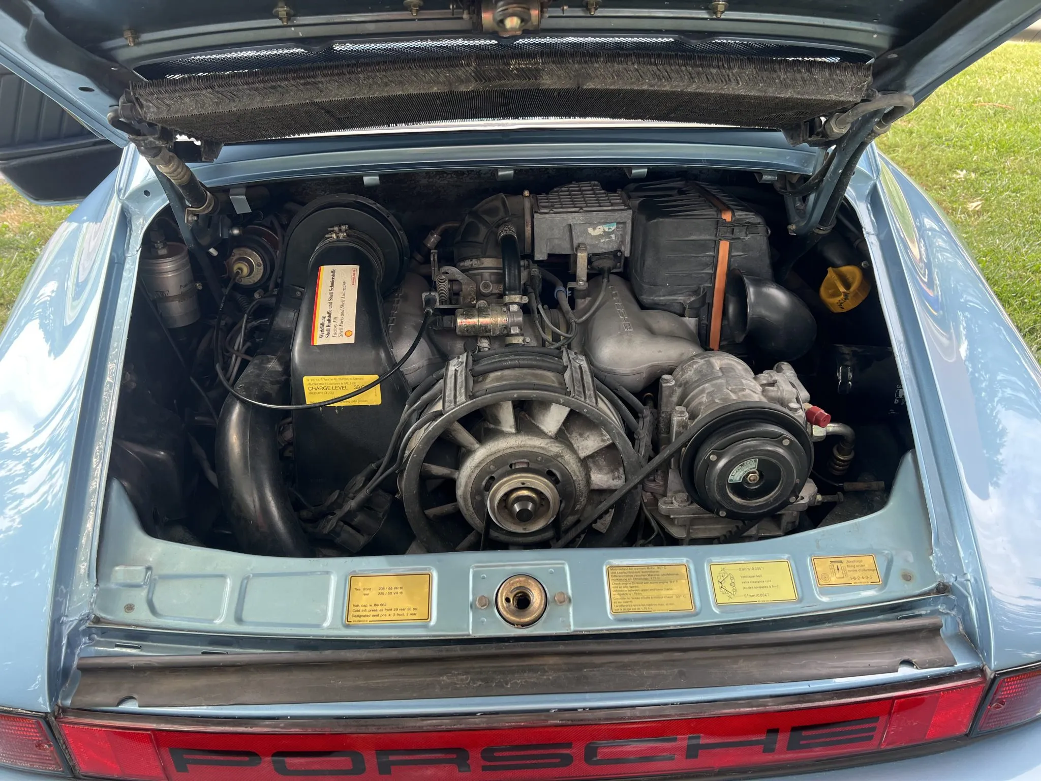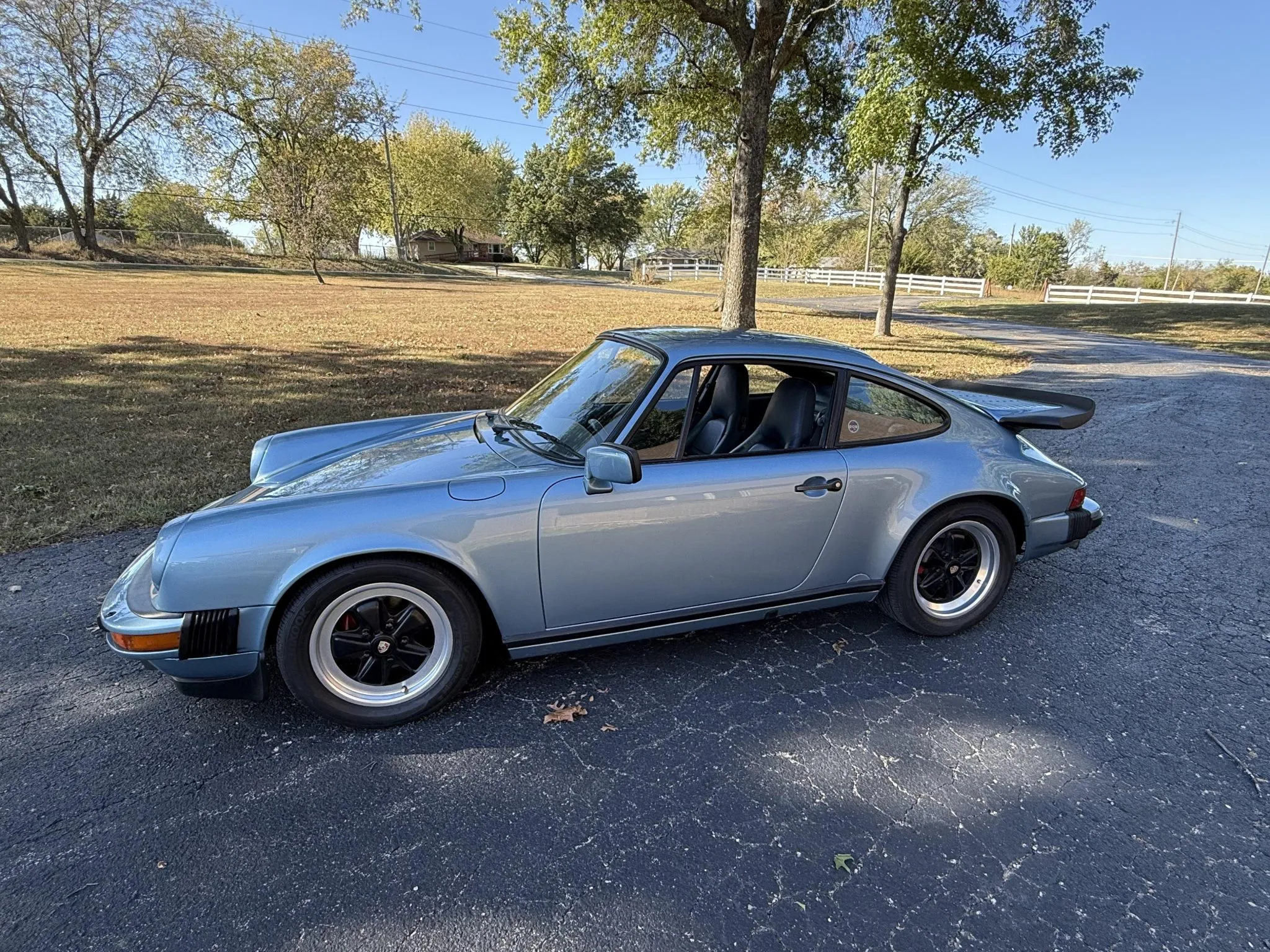 Powered by a 3.2-liter flat-six paired with a 915 five-speed manual transaxle, the car is equipped with a retrofitted rear spoiler, a power sunroof, 16″ Fuchs wheels, fog lights, cruise control, a Panasonic CD stereo head unit, and power-adjustable front seats trimmed in blue partial leather.