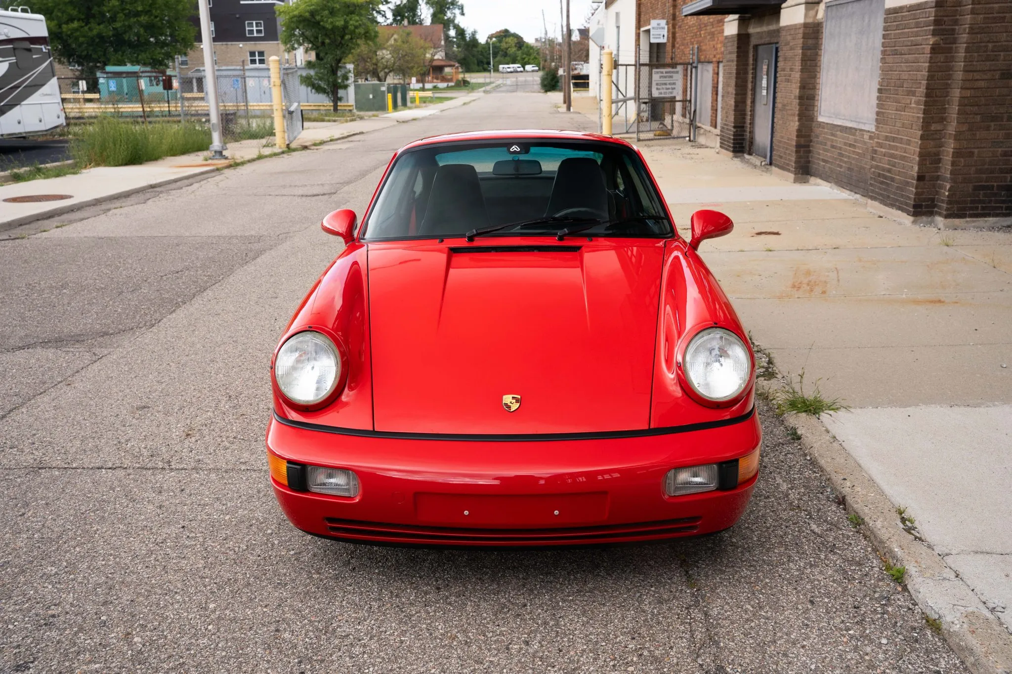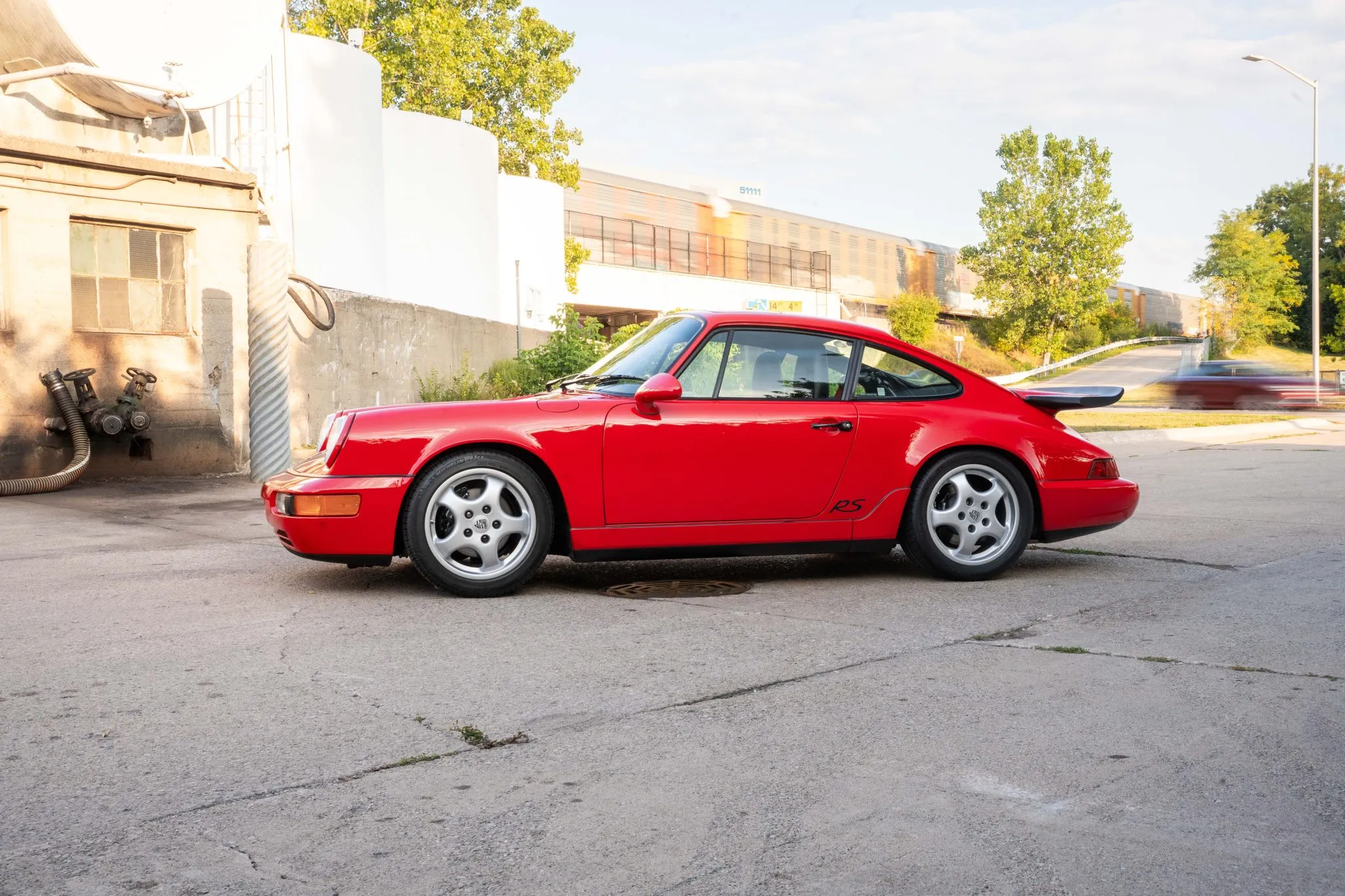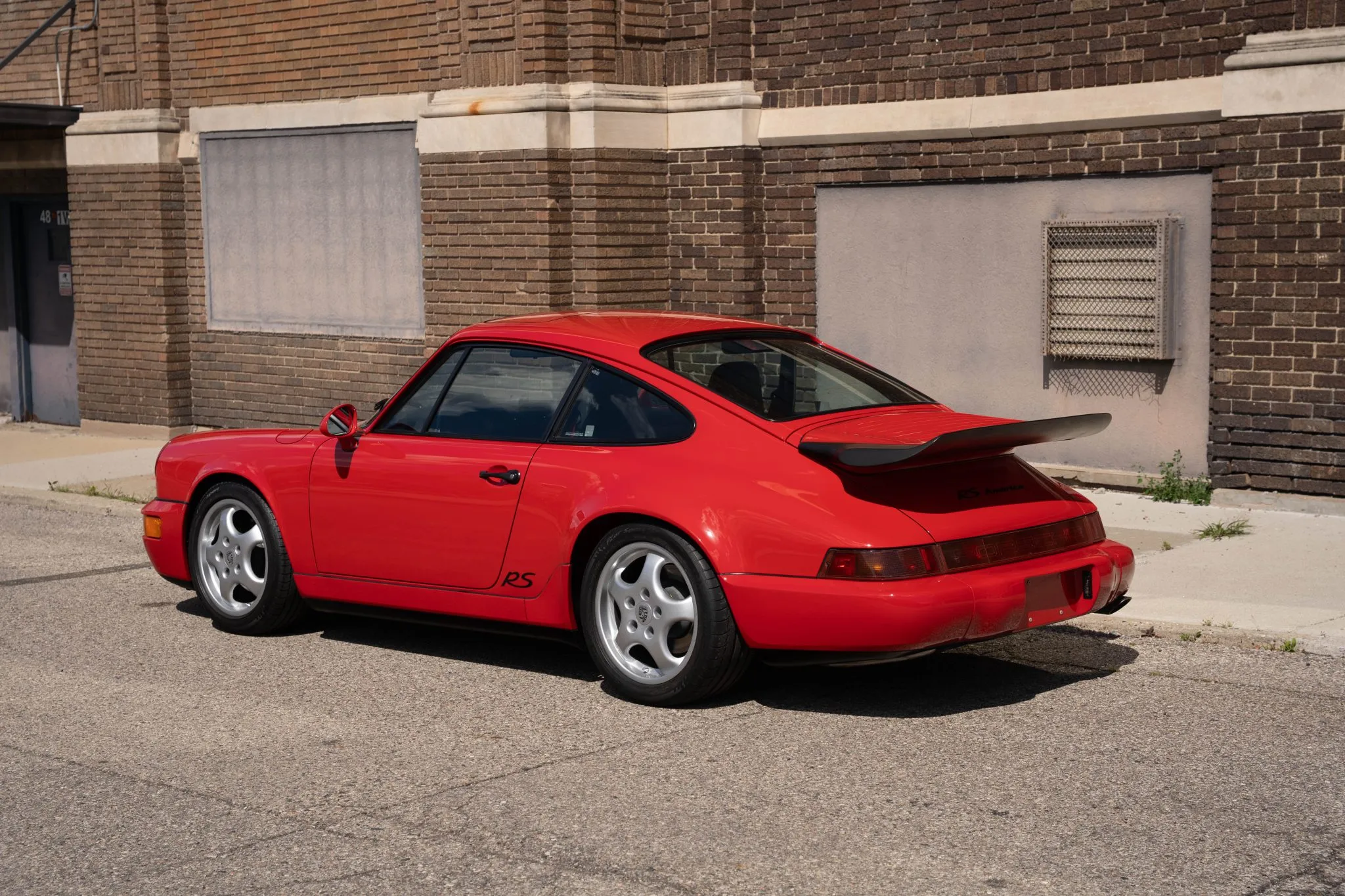 This 964 RS America shows 25k miles and is now offered on dealer consignment in Michigan with a window sticker, manufacturer’s literature, service records, a tool kit, a clean Carfax report, and a clean Arizona title.
