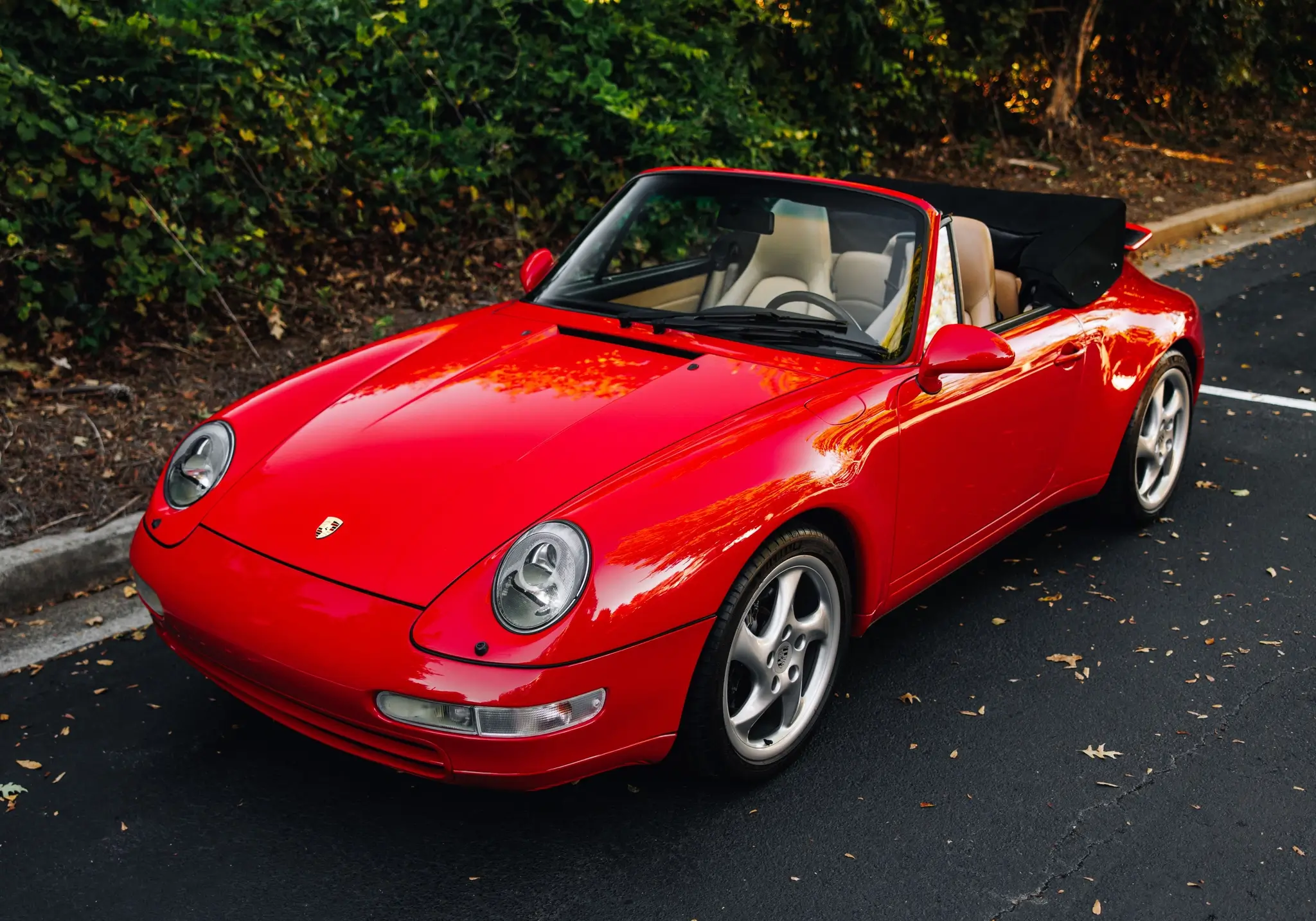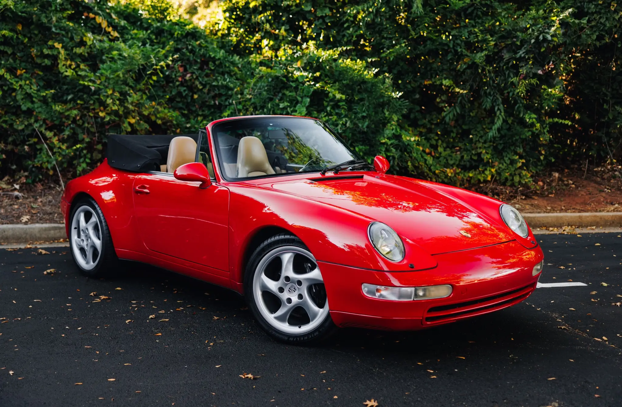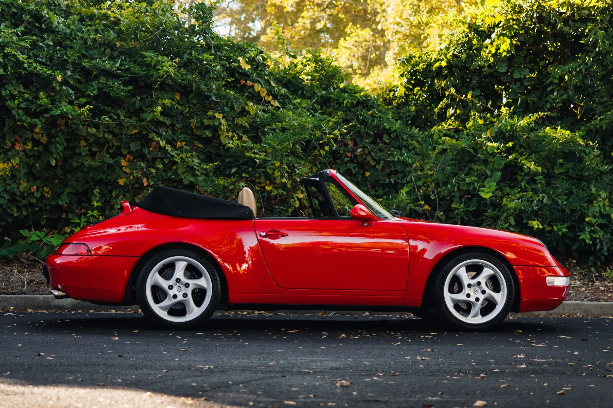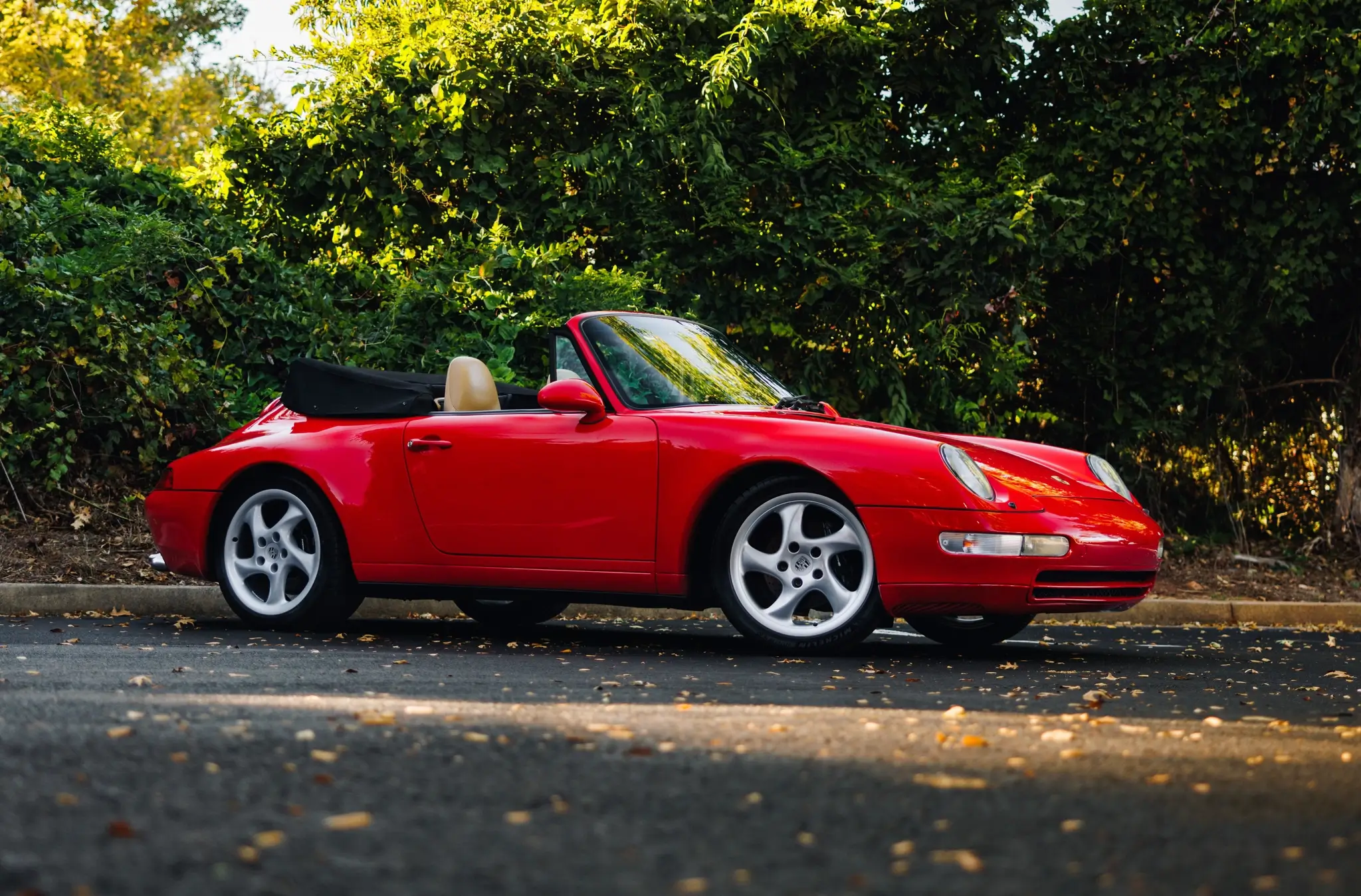 Finished in Guards Red over Cashmere Beige upholstery, this 1995 Porsche 993 Carrera Cabriolet is equipped with a 6-speed manual transmission paired with its air-cooled 3.6-liter flat-six engine.