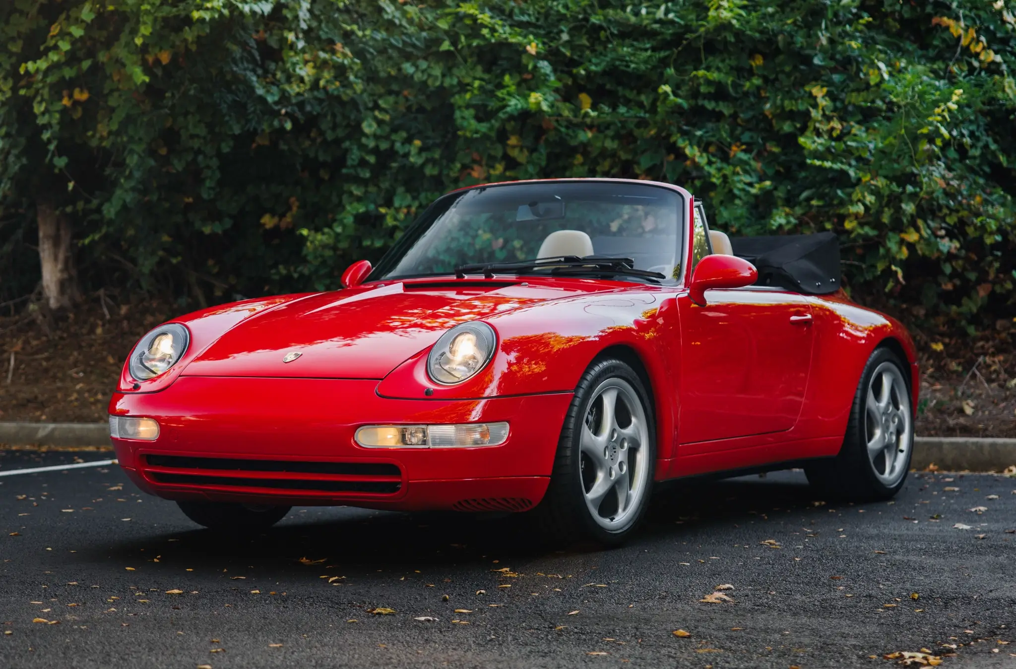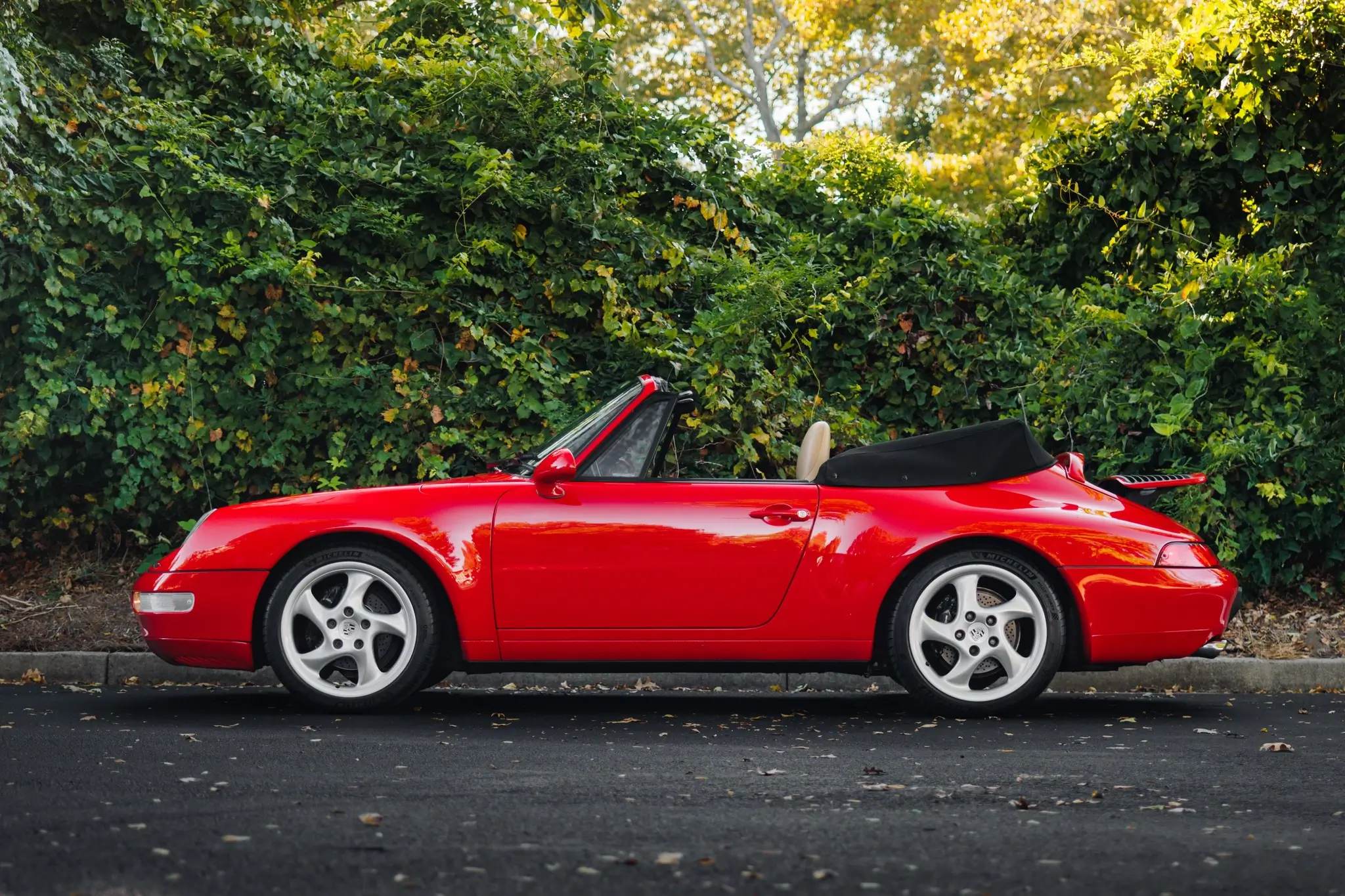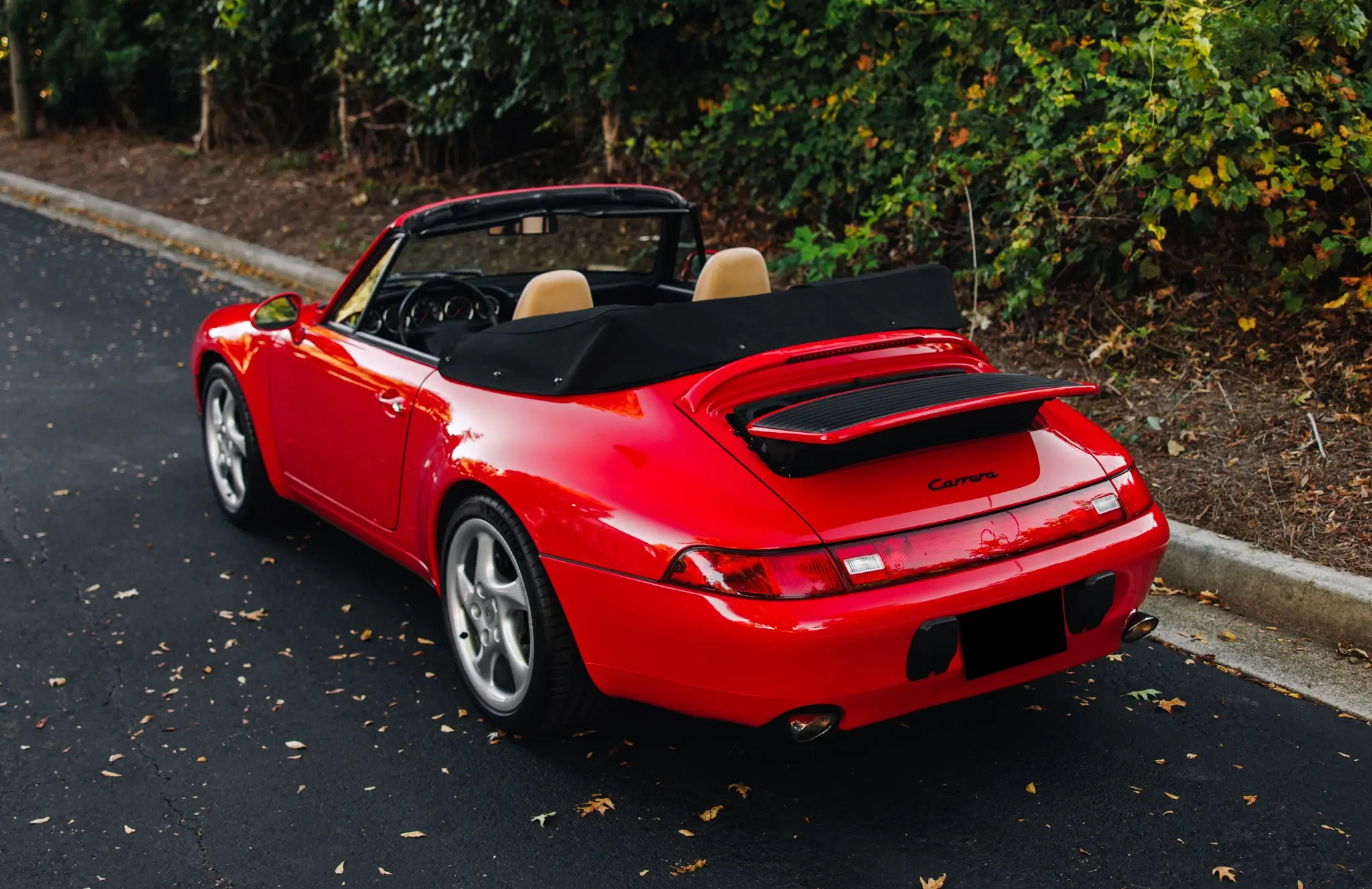 Finished in Guards Red over Cashmere Beige upholstery, this 1995 Porsche 993 Carrera Cabriolet is equipped with a 6-speed manual transmission paired with its air-cooled 3.6-liter flat-six engine.