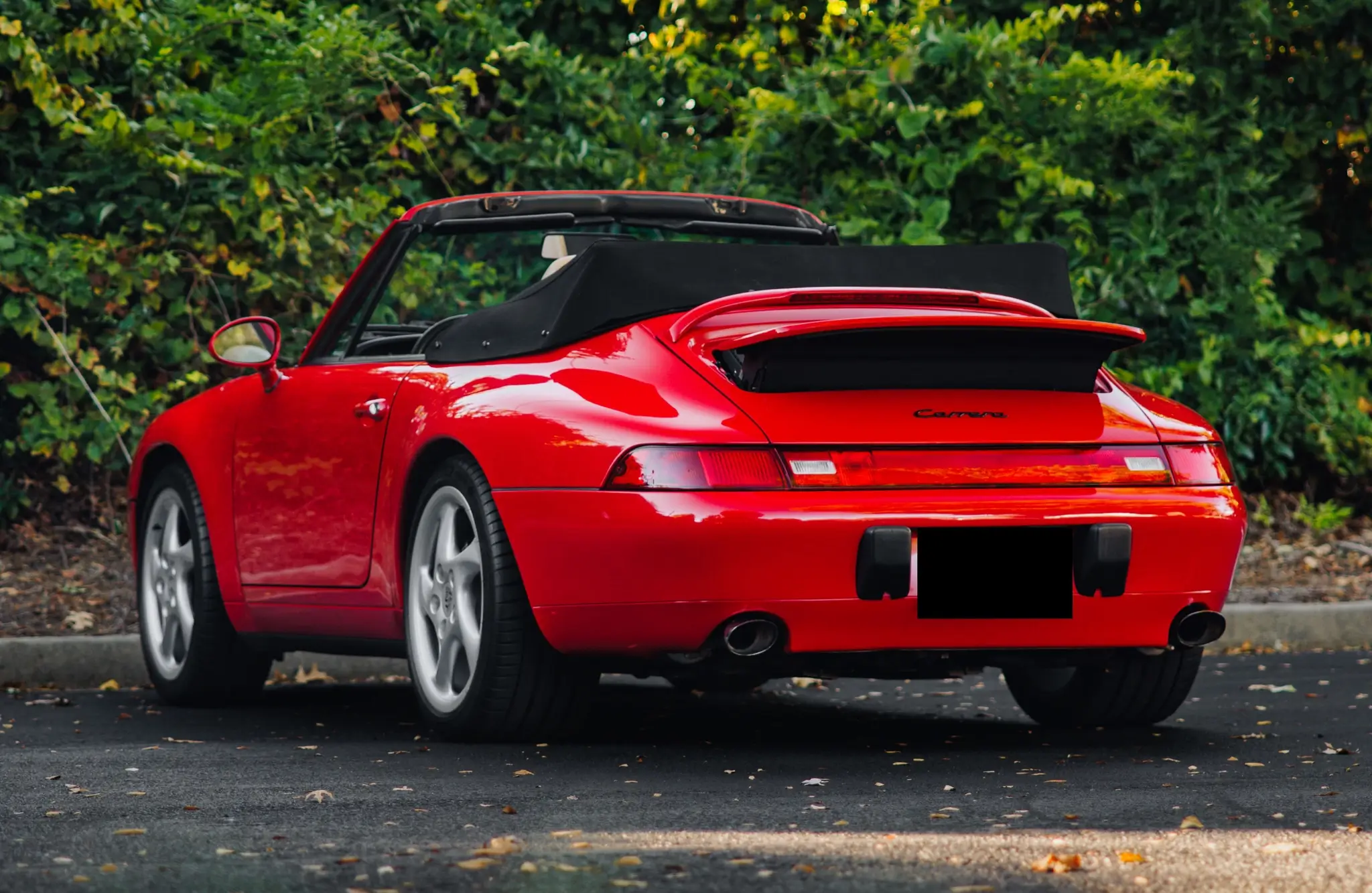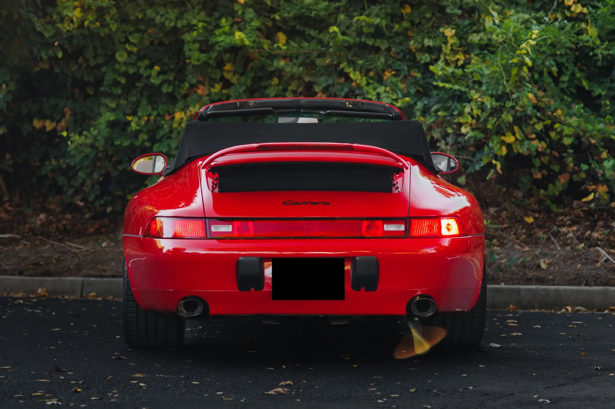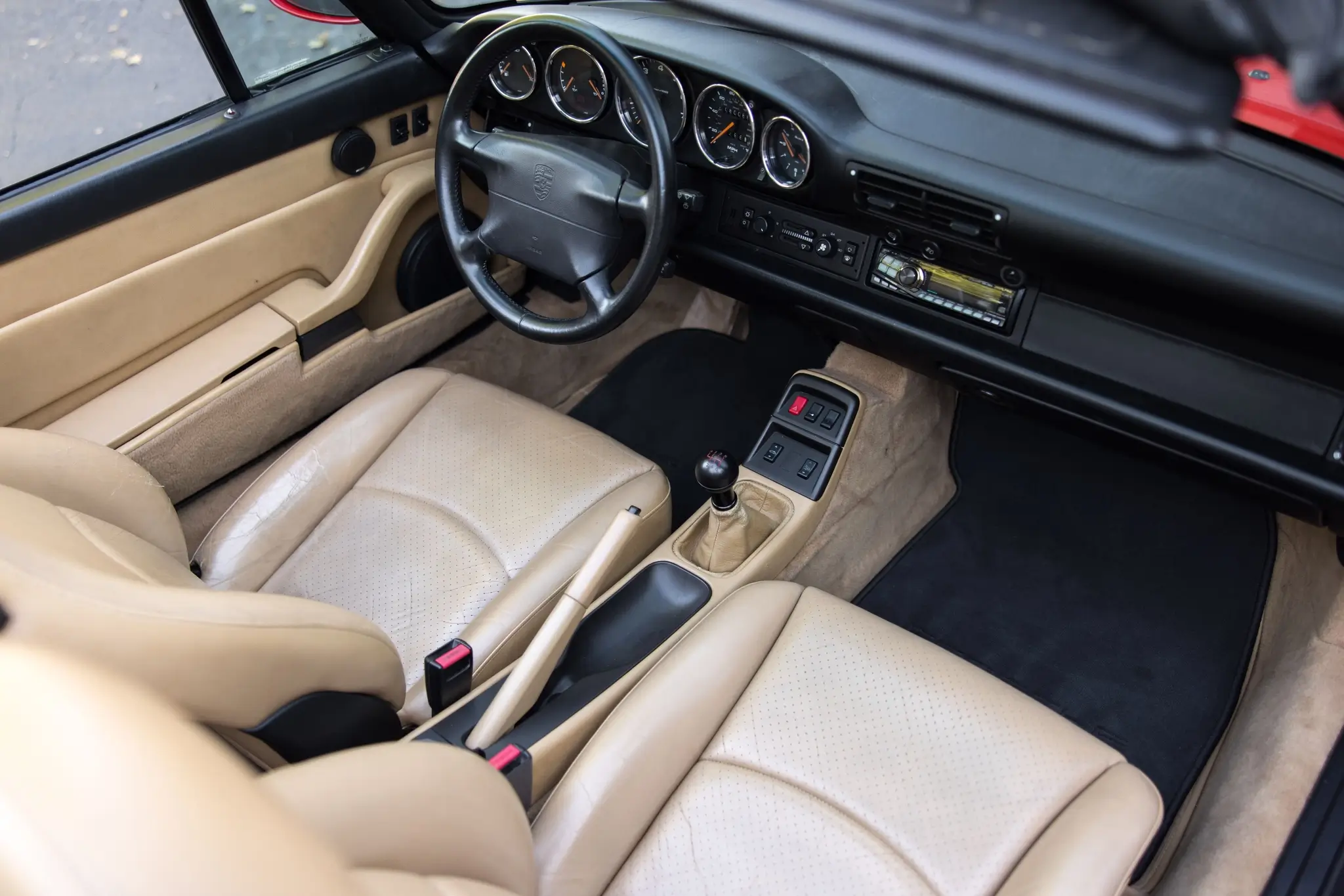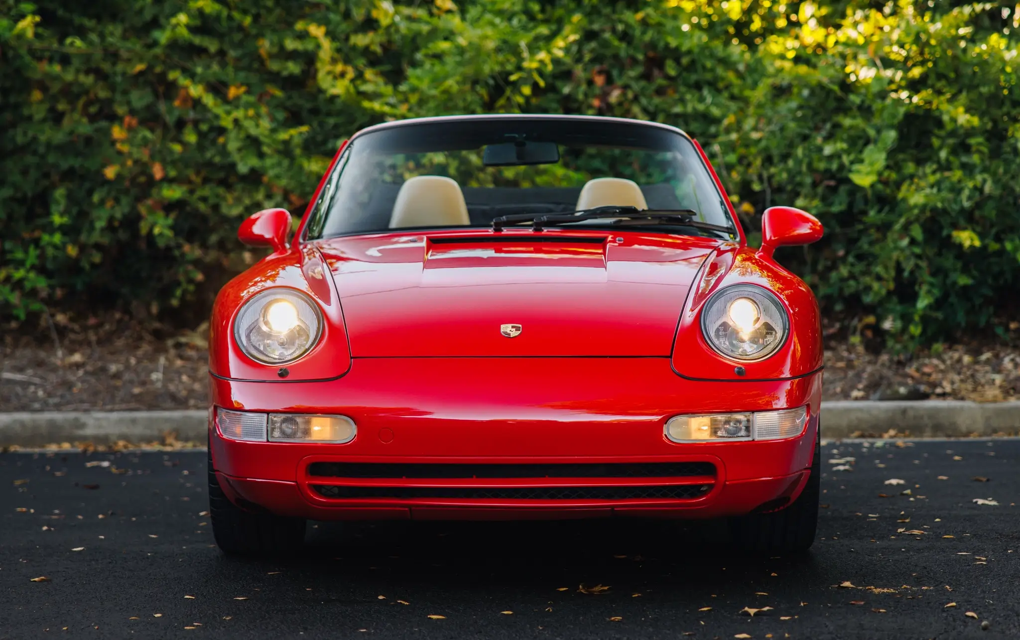 Finished in Guards Red over Cashmere Beige upholstery, this 1995 Porsche 993 Carrera Cabriolet is equipped with a 6-speed manual transmission paired with its air-cooled 3.6-liter flat-six engine.