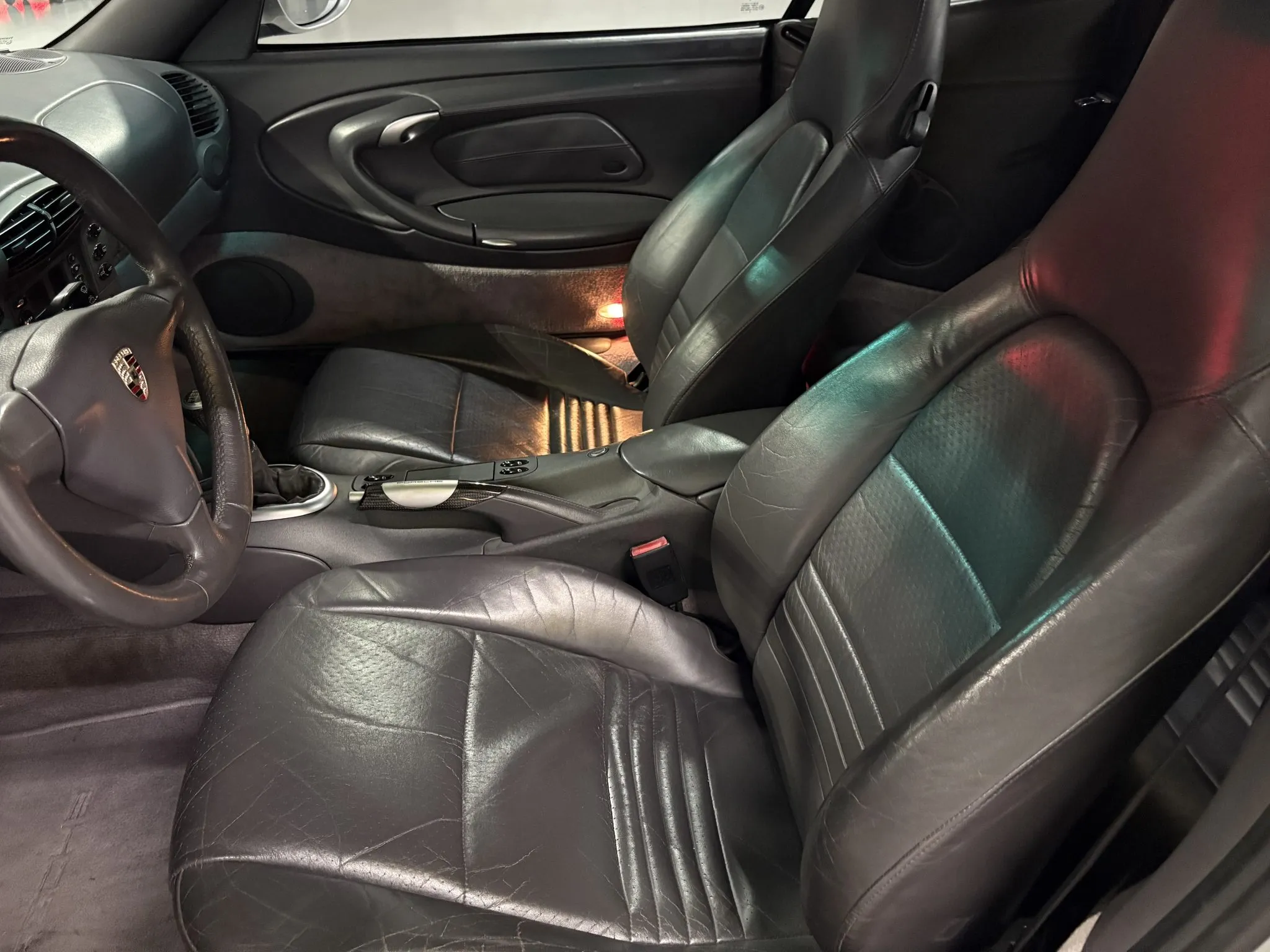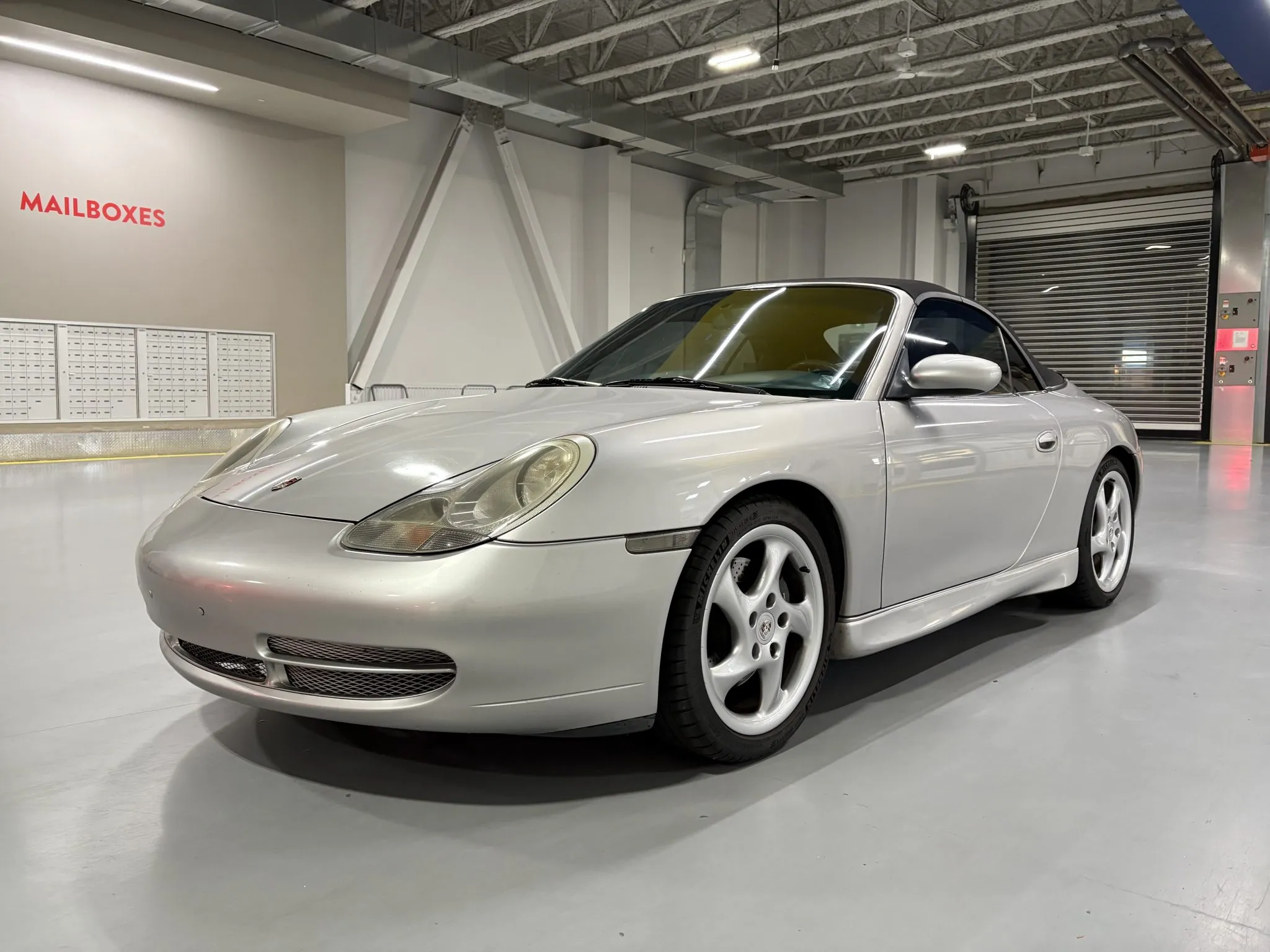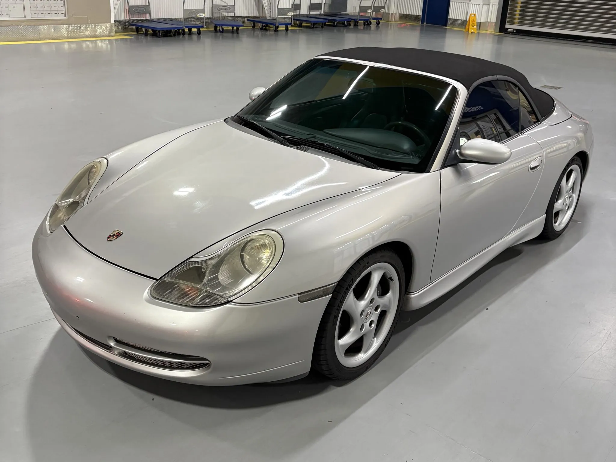 Finished in Arctic Silver Metallic over Space Grey full leather upholstery, the car has a body-color removable hardtop, a black soft top, a deployable rear spoiler, Aerokit-style side skirts, 18″ Turbo-look wheels, traction control, heated power-adjustable front seats, a carbon-fiber trimmed shifter and handbrake lever, aluminum-look instrument dials, a Becker Porsche CD stereo, cruise control, and automatic climate control.