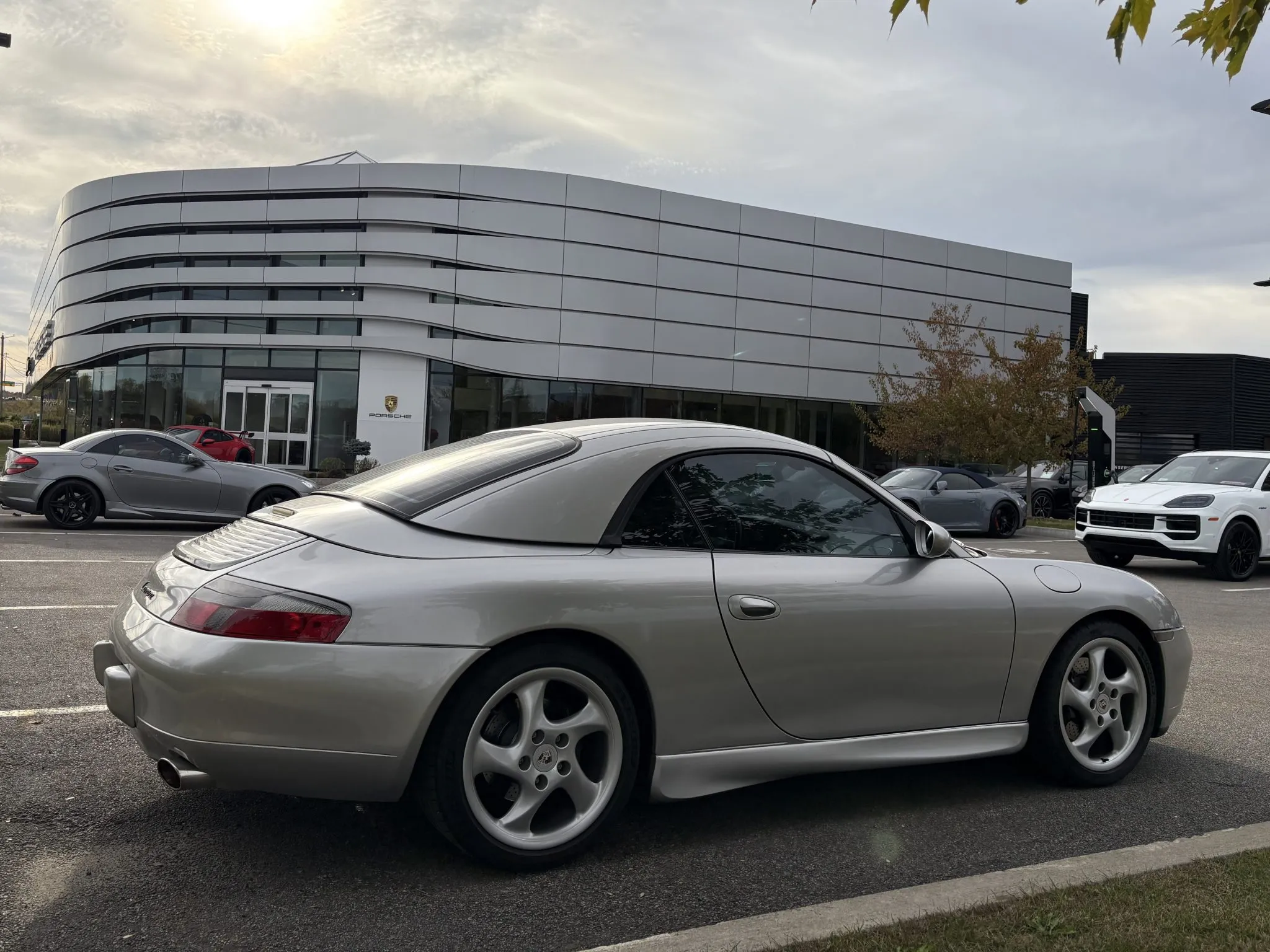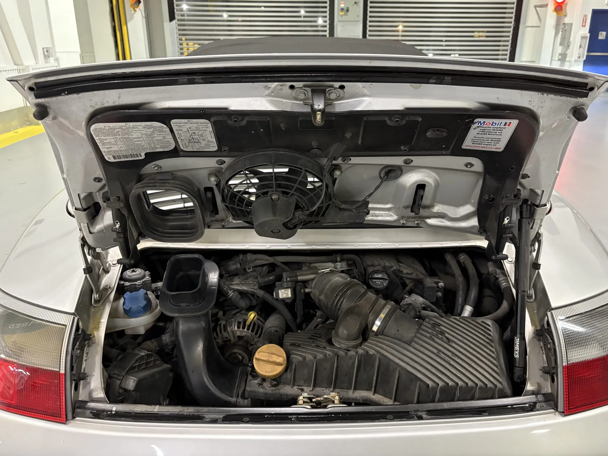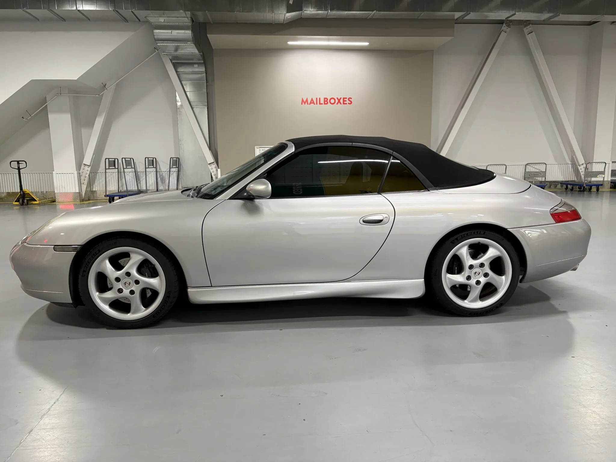 Finished in Arctic Silver Metallic over Space Grey full leather upholstery, the car has a body-color removable hardtop, a black soft top, a deployable rear spoiler, Aerokit-style side skirts, 18″ Turbo-look wheels, traction control, heated power-adjustable front seats, a carbon-fiber trimmed shifter and handbrake lever, aluminum-look instrument dials, a Becker Porsche CD stereo, cruise control, and automatic climate control.