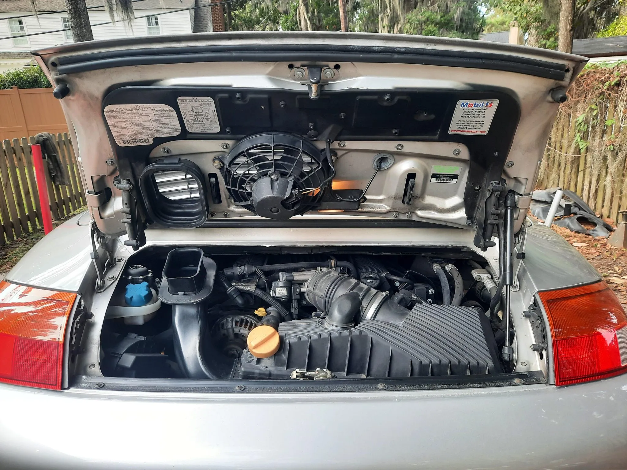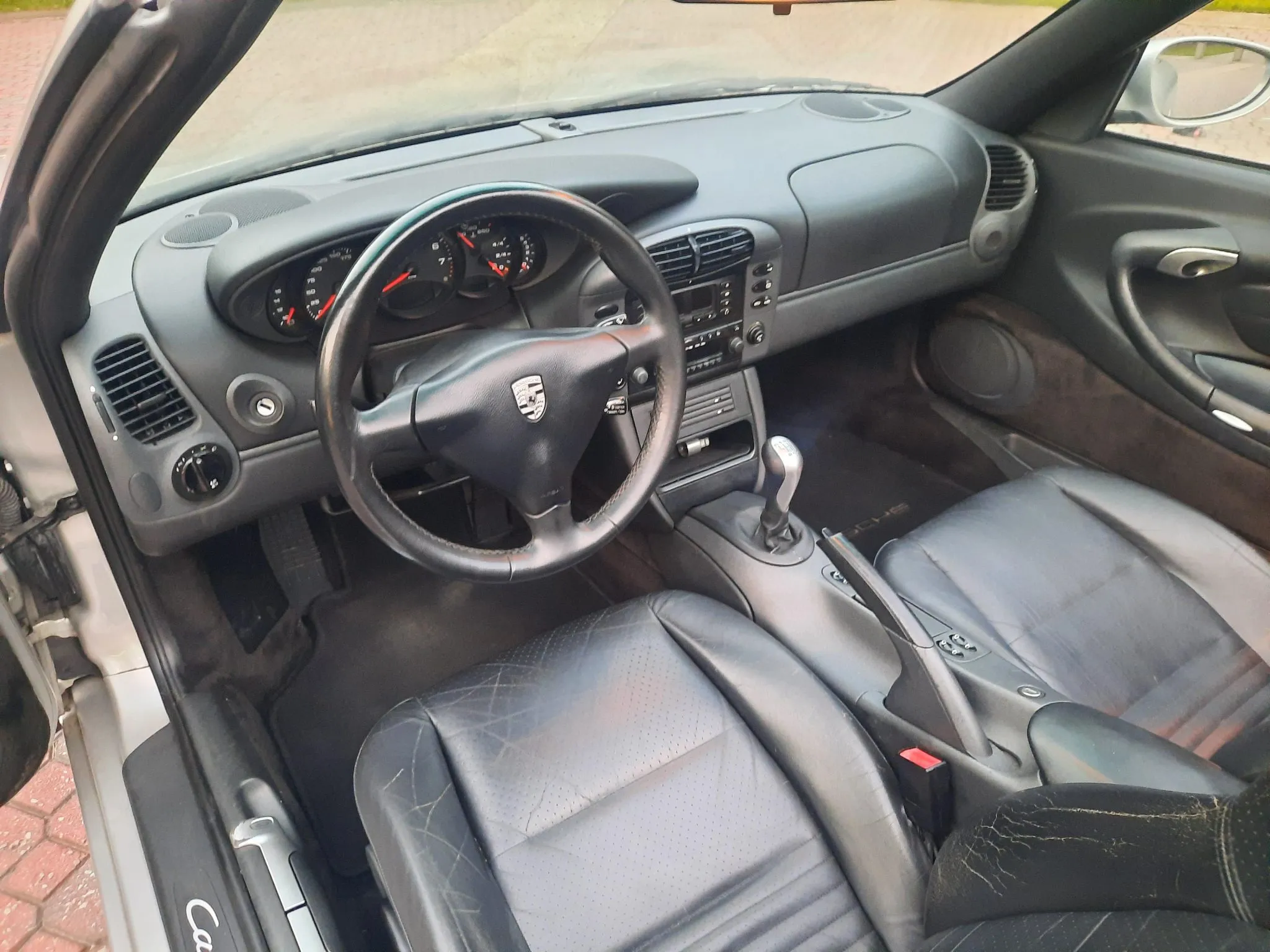 The car is powered by a 3.4-liter M96 flat-six paired with a six-speed manual transaxle, and equipment includes 18″ Turbo-look wheels, Bilstein dampers, a black soft top, a deployable rear spoiler, a three-spoke steering wheel, a short-throw shifter, power-adjustable sport seats, cruise control, automatic climate control, and a Porsche CDR-220 stereo.