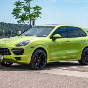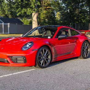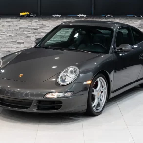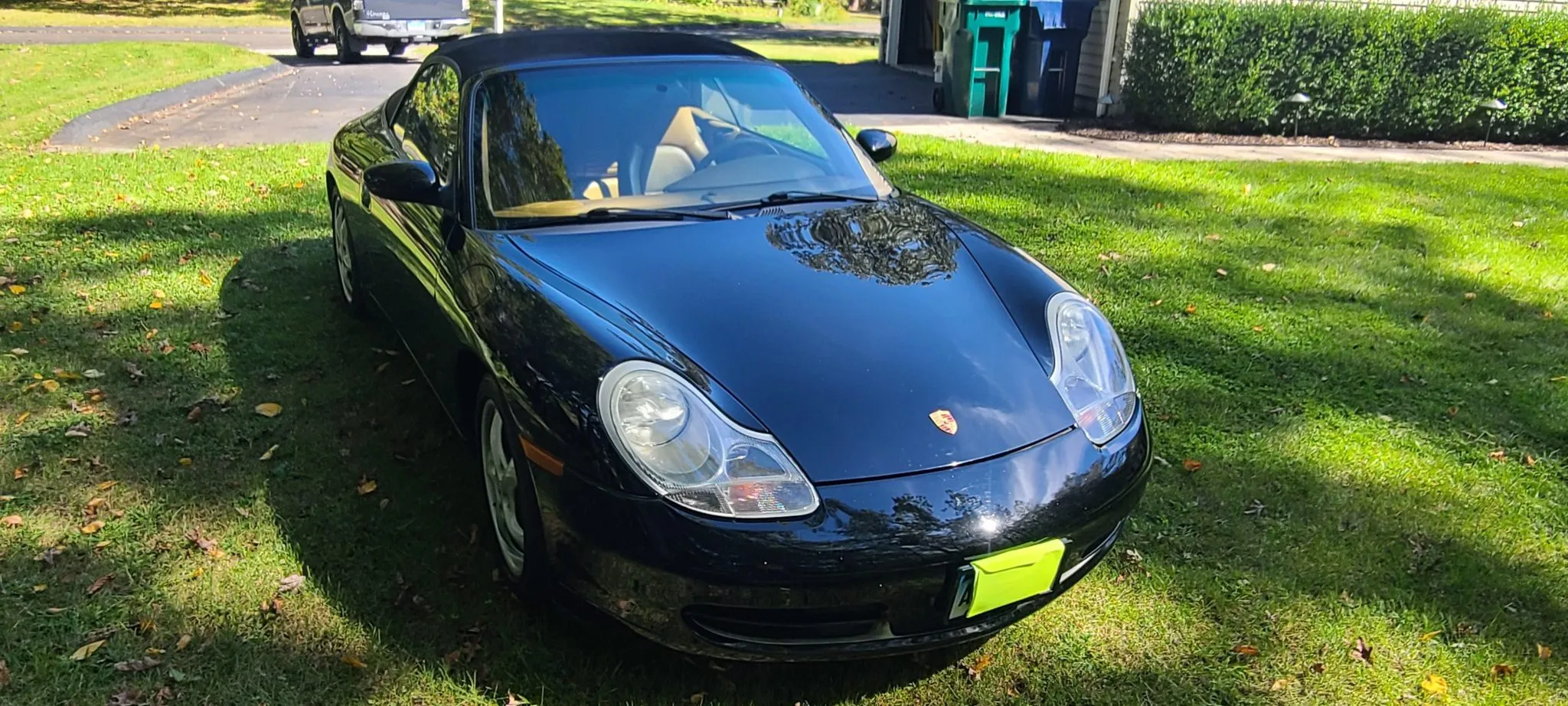 Equipment includes a black soft top, the Full Leather Package, a deployable rear spoiler, 17″ five-spoke alloy wheels, heated power-adjustable front seats, cruise control, automatic climate control, a Porsche CR-220 stereo, and stainless-steel sill plates.