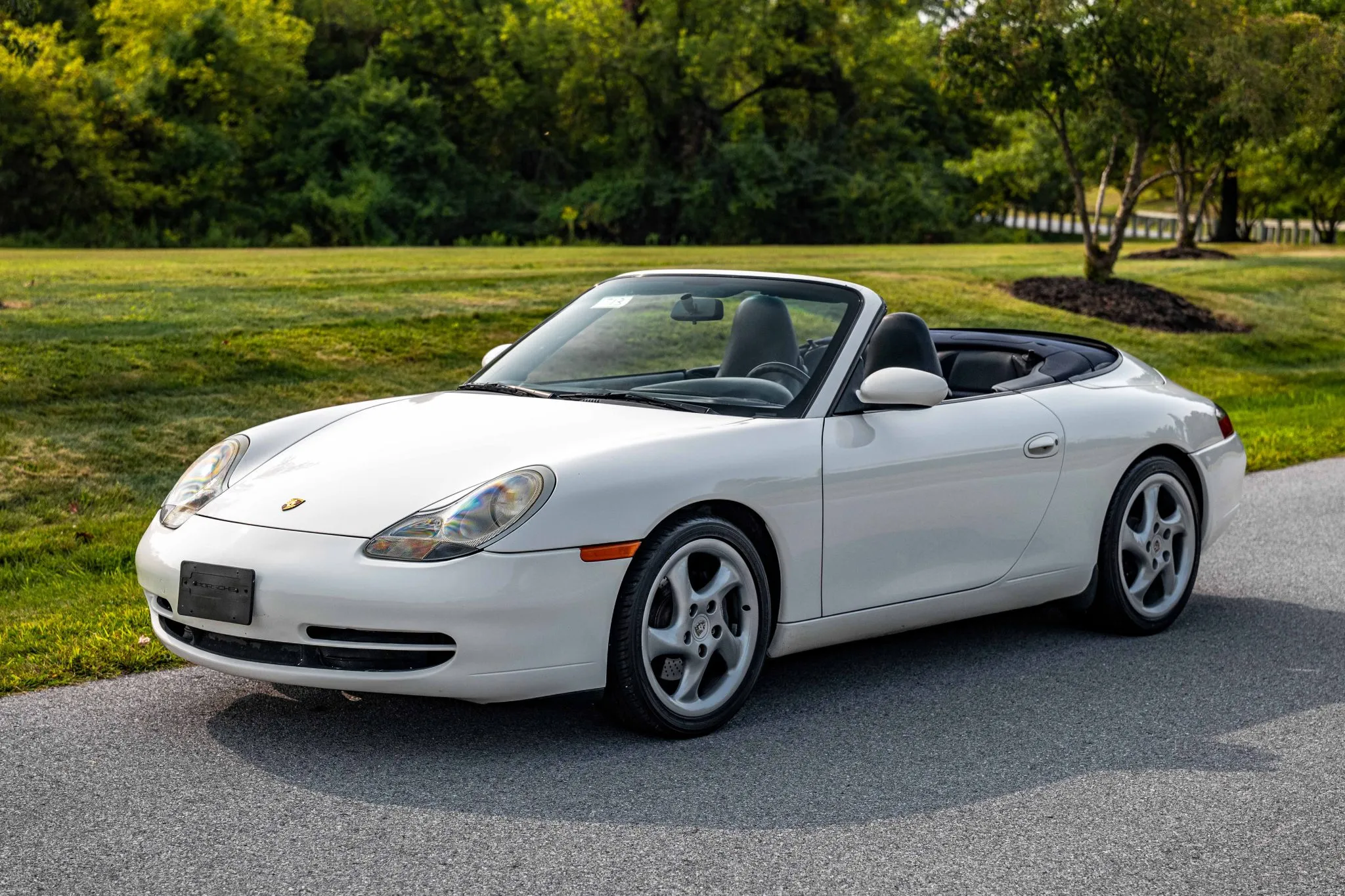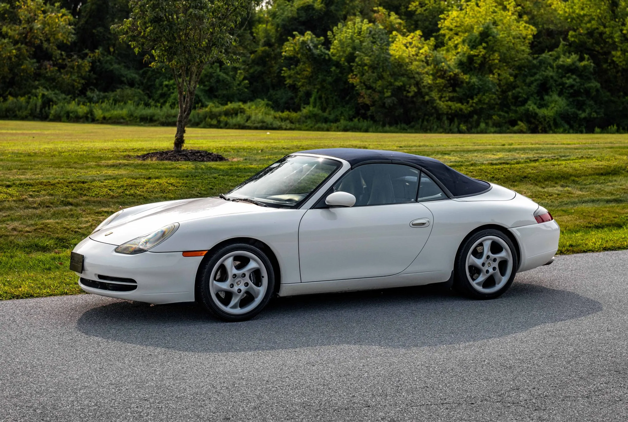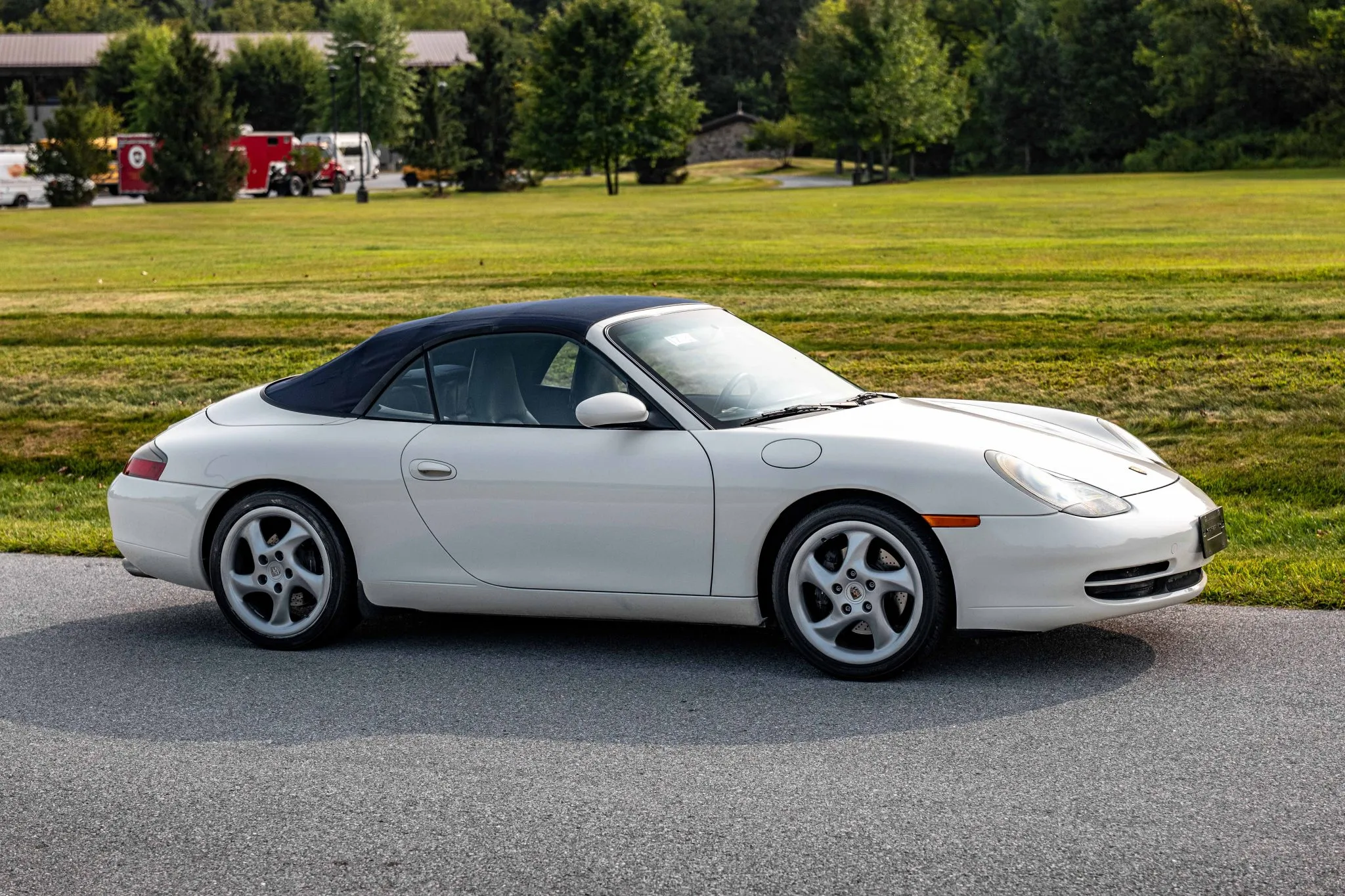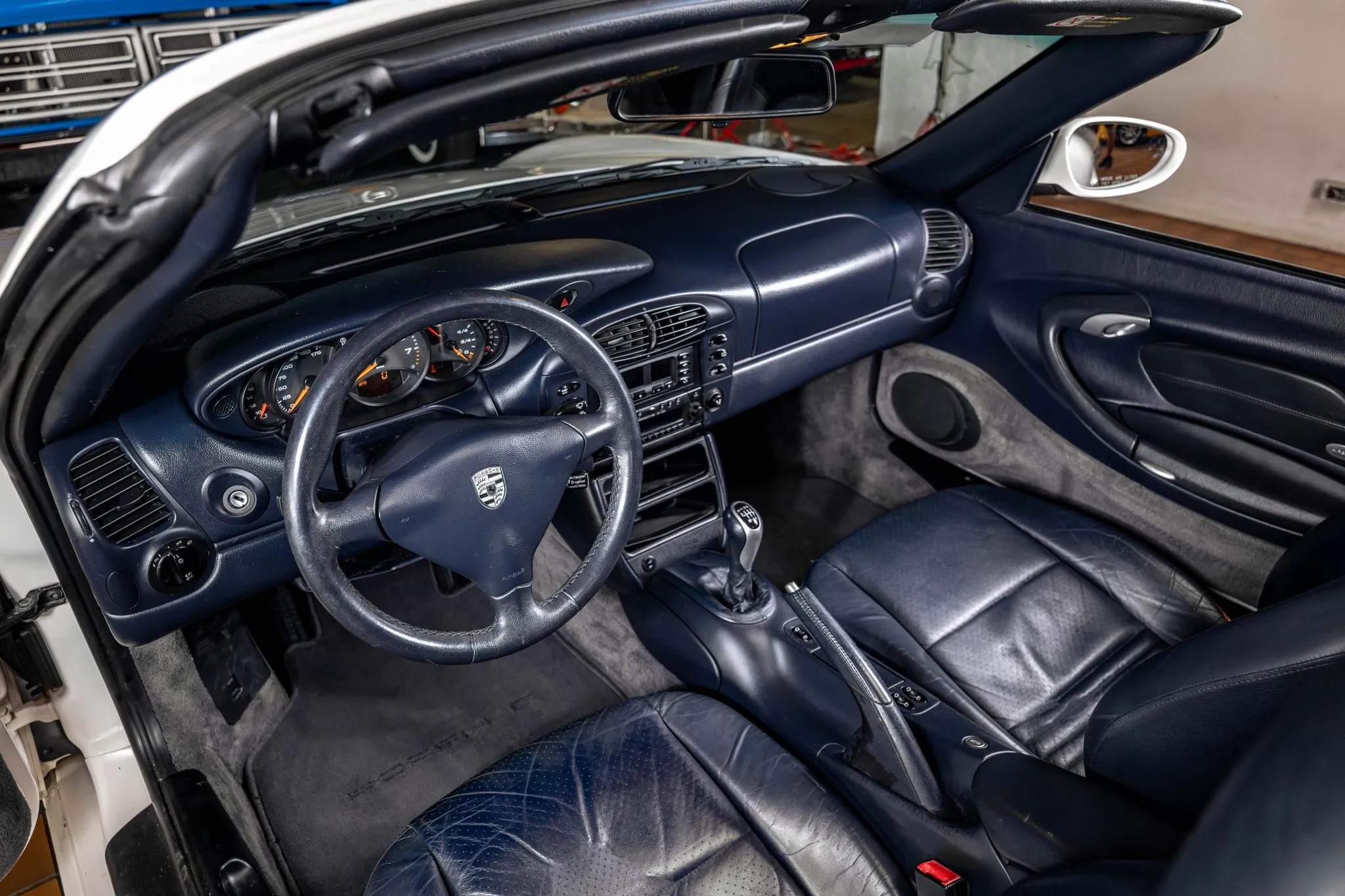 This 2000 Porsche 911 Carrera cabriolet is finished in Biarritz White over Metropol Blue leather and is powered by a 3.4-liter M96 flat-six paired with a six-speed manual transaxle.