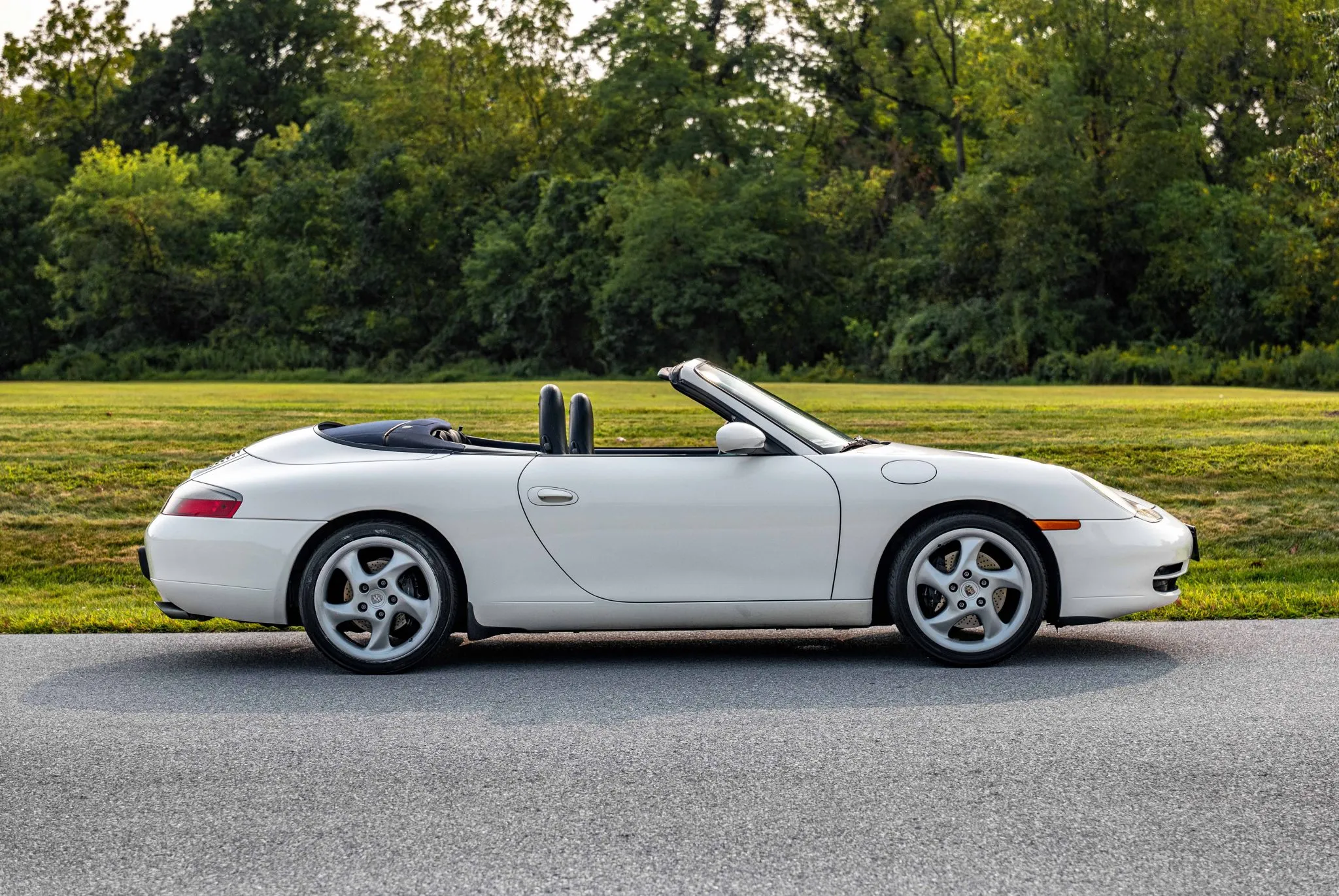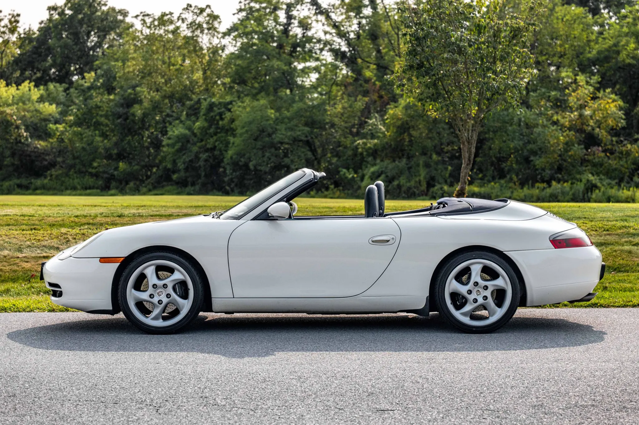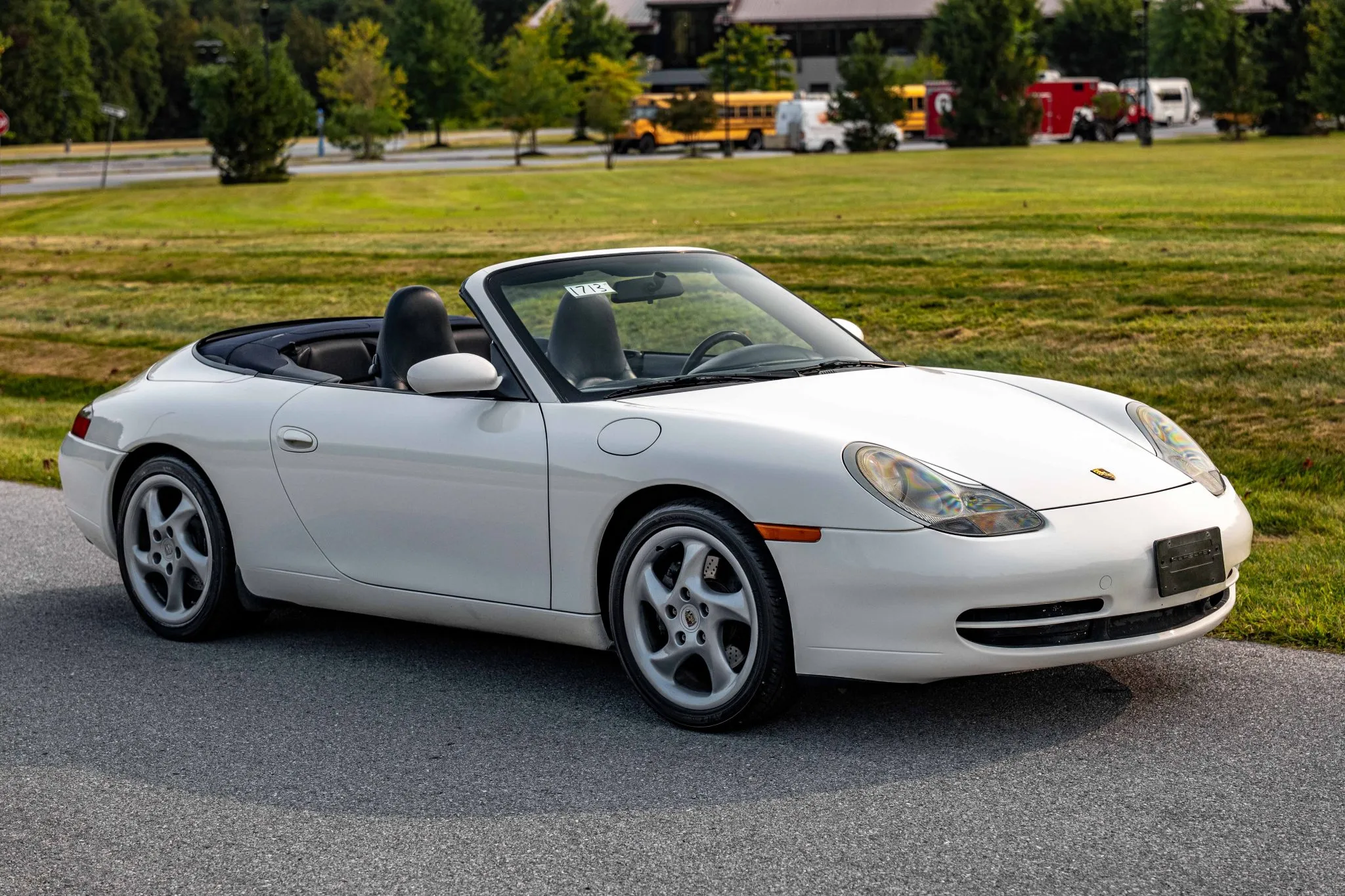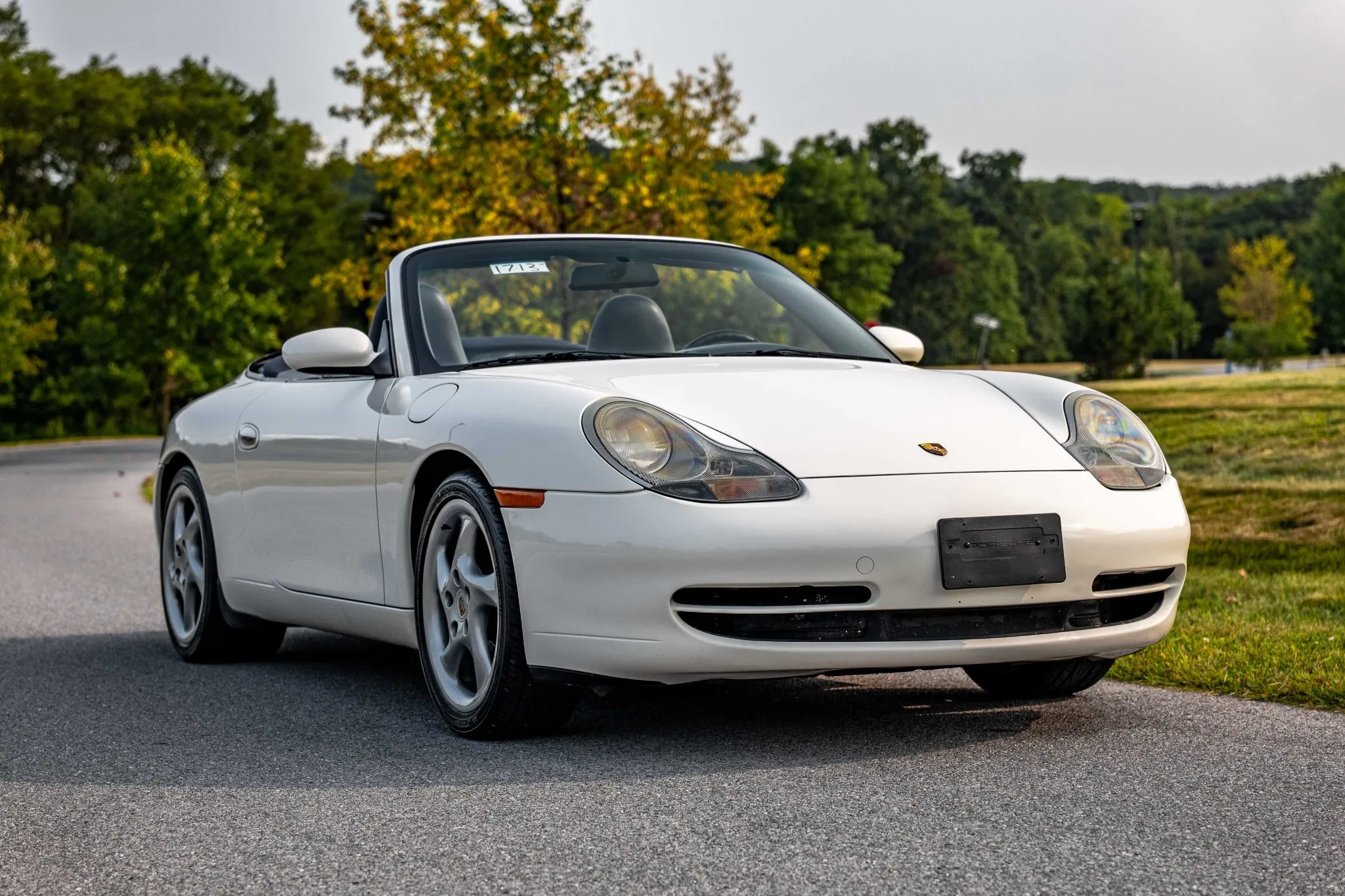 This 2000 Porsche 911 Carrera cabriolet is finished in Biarritz White over Metropol Blue leather and is powered by a 3.4-liter M96 flat-six paired with a six-speed manual transaxle.