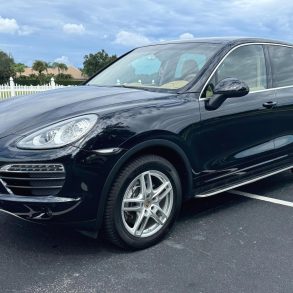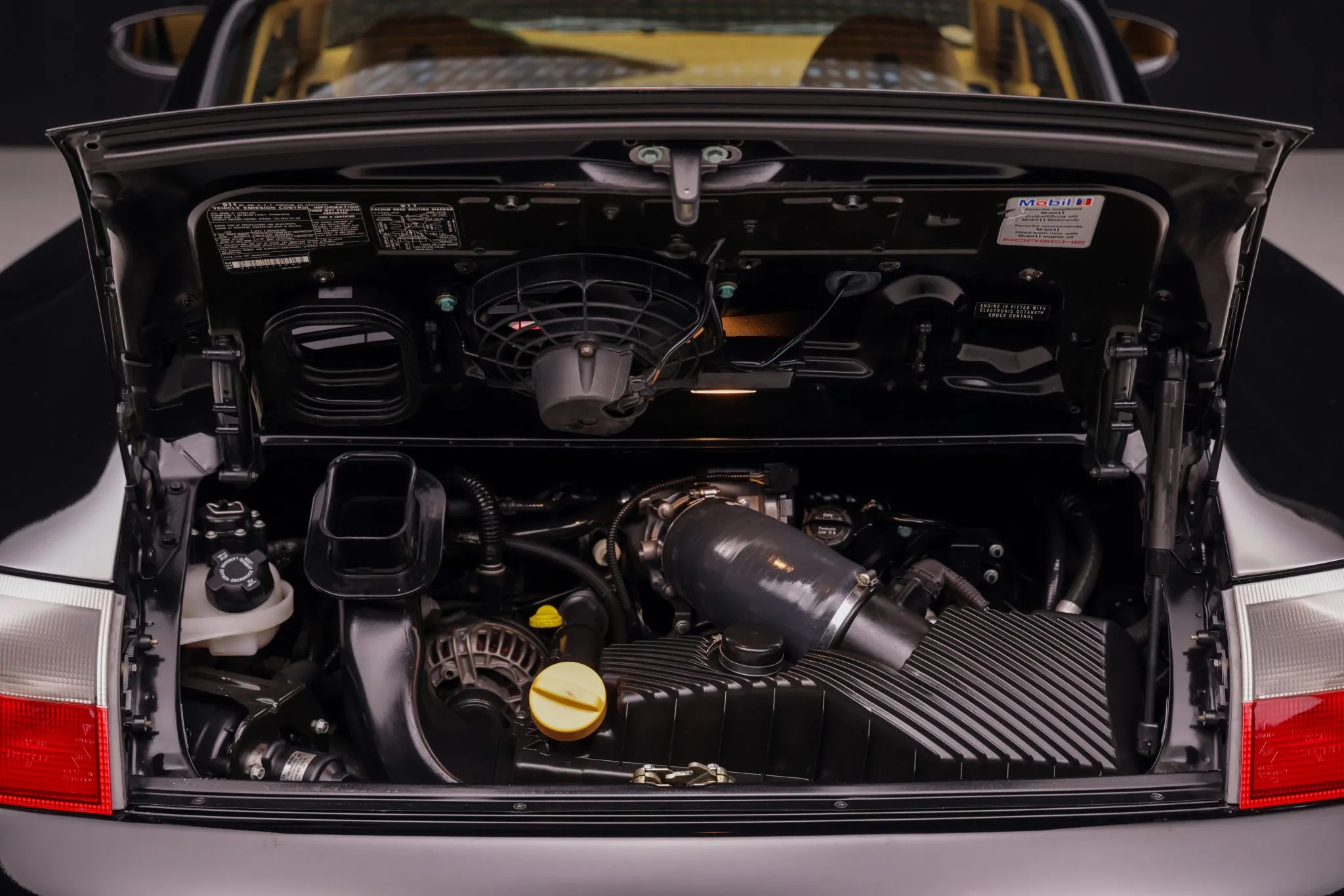 Equipment includes an aftermarket air intake elbow, an IPD intake plenum, tubular headers, Fister mufflers, Vogtland lowering springs, 18″ Turbo-look wheels, xenon headlights, a sunroof, a deployable rear spoiler, power-adjustable front seats, automatic climate control, and Porsche Classic Communication Management with navigation.