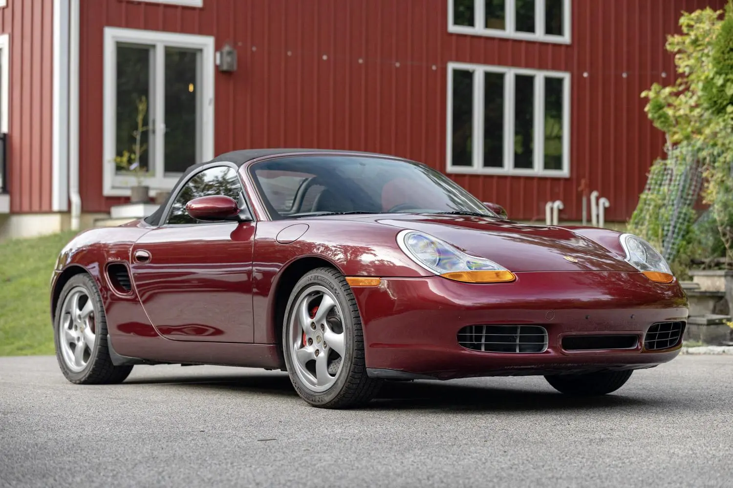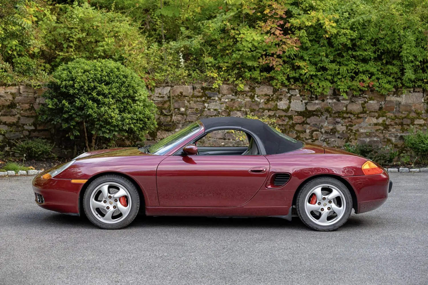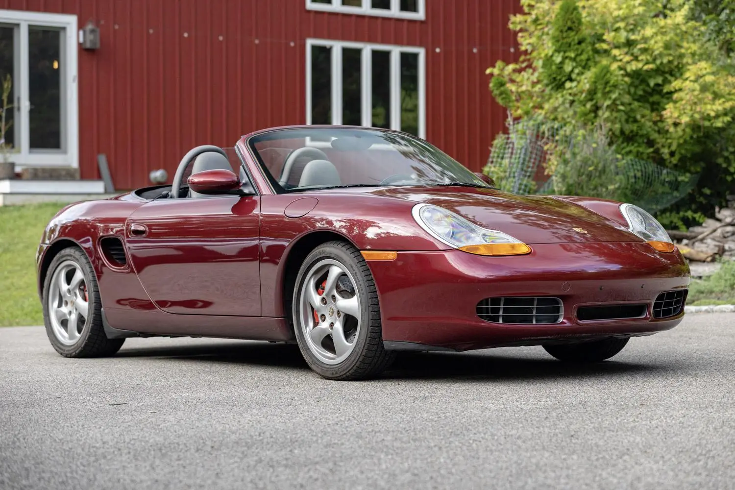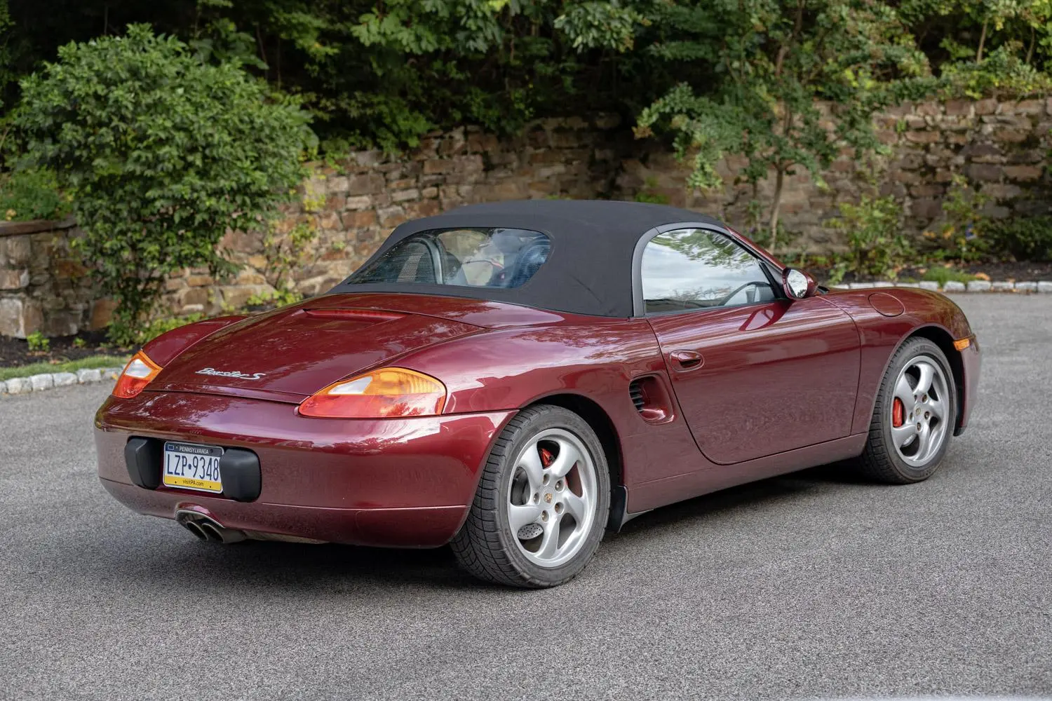 This 2000 Porsche Boxster S is powered by a 3.2-liter flat-six paired with a six-speed manual transaxle and is finished in Arena Red Metallic over Graphite Gray full leather. It was sold on BaT in February 2022, and the black convertible soft top has been replaced since that time.