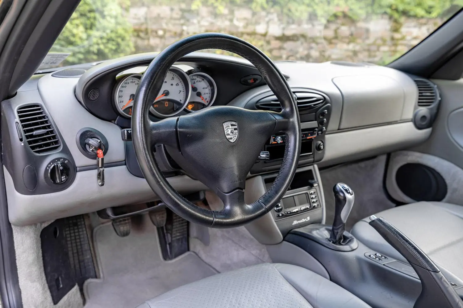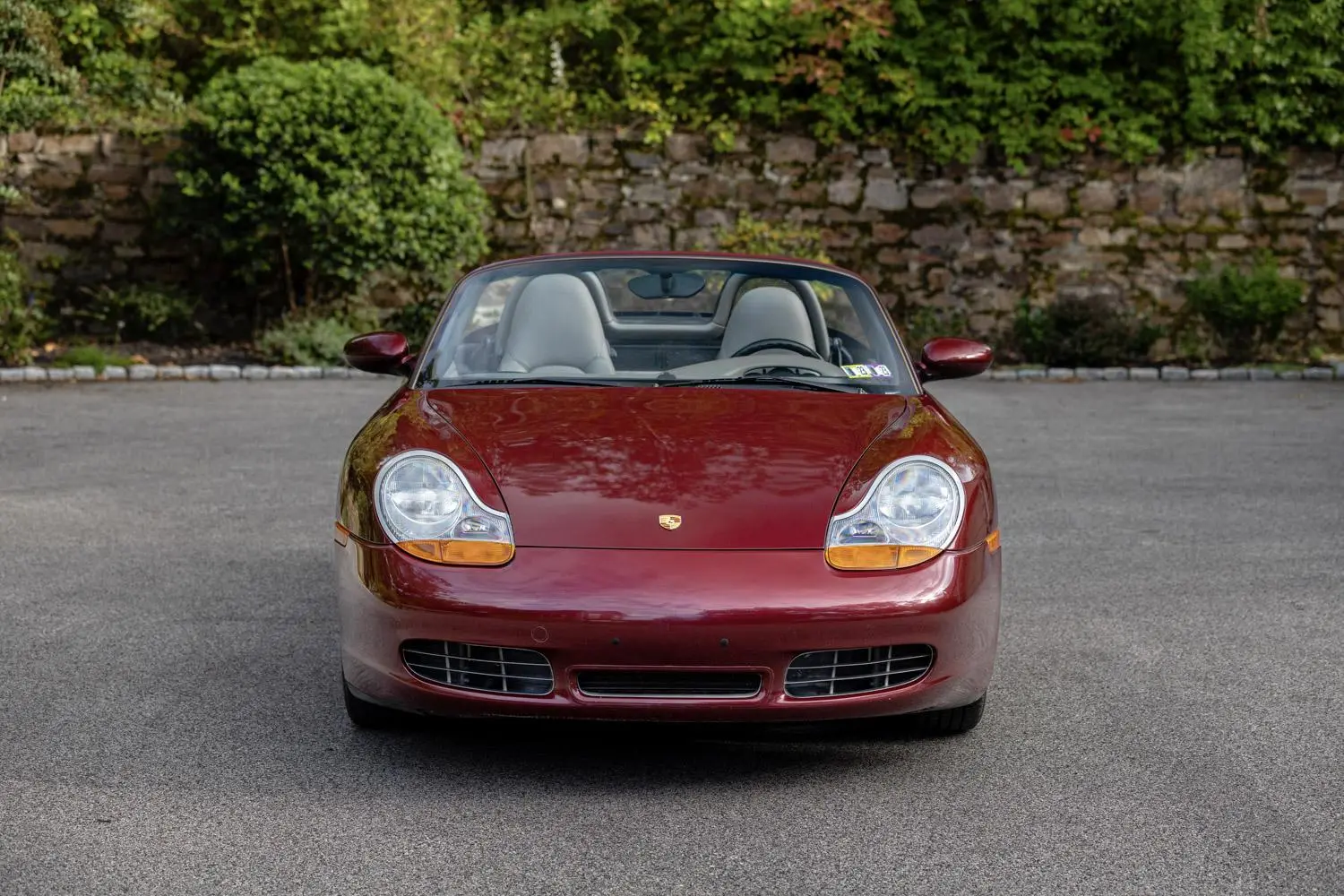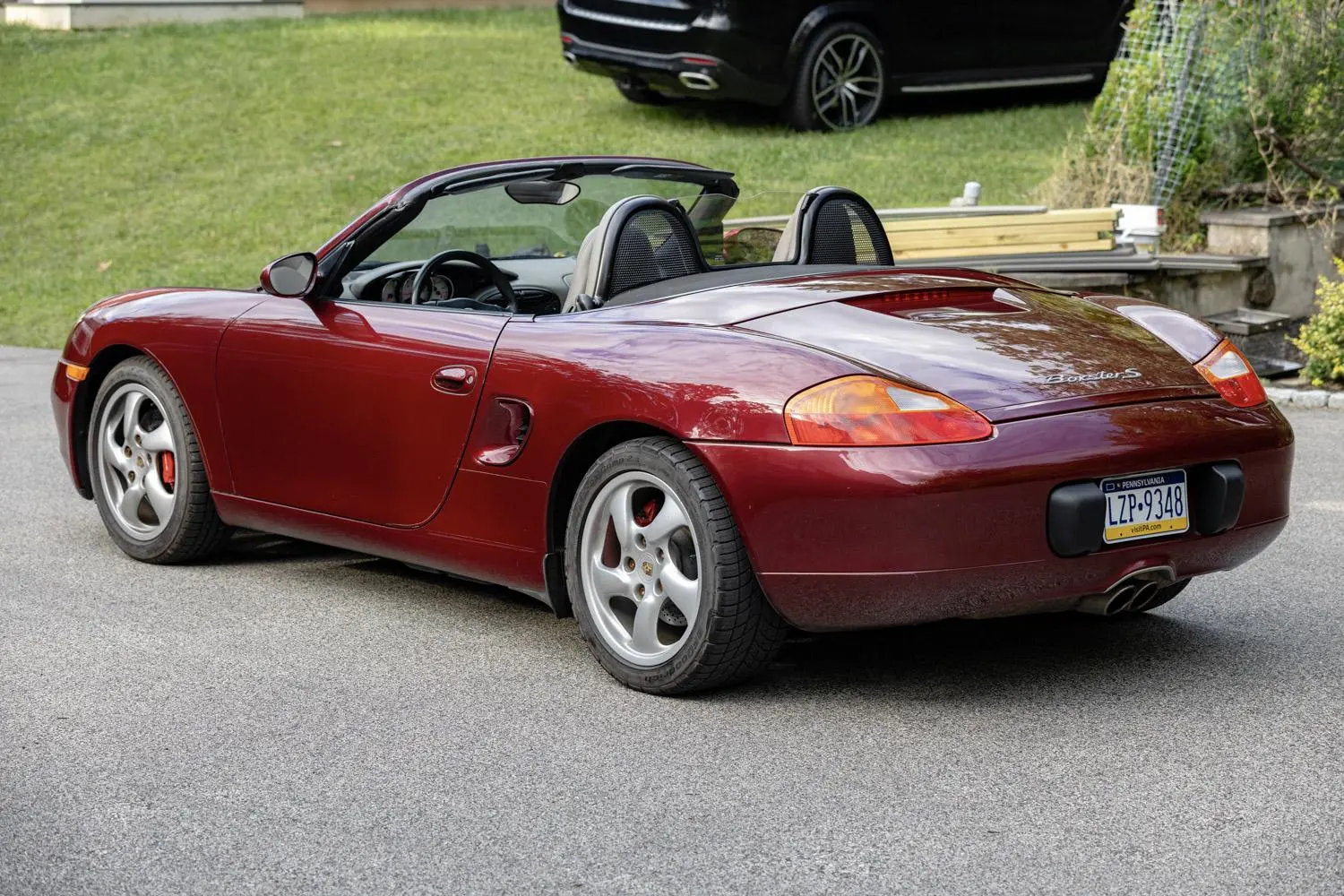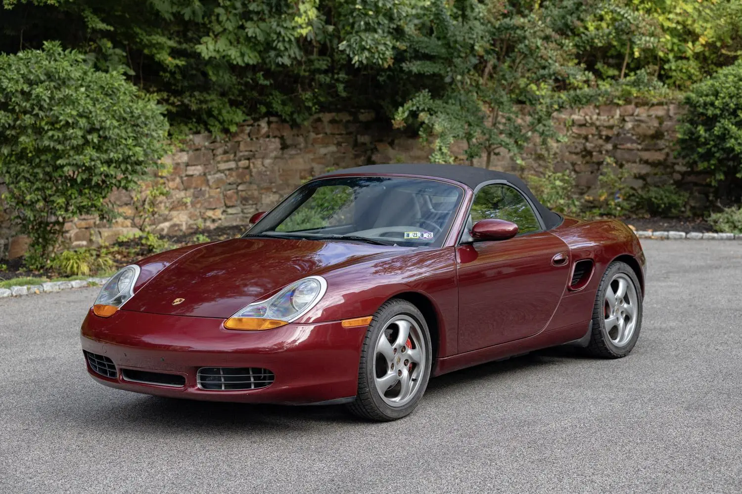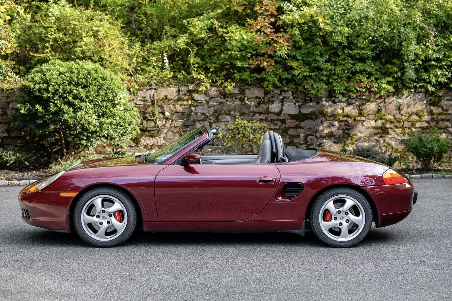 This 2000 Porsche Boxster S is powered by a 3.2-liter flat-six paired with a six-speed manual transaxle and is finished in Arena Red Metallic over Graphite Gray full leather. It was sold on BaT in February 2022, and the black convertible soft top has been replaced since that time.