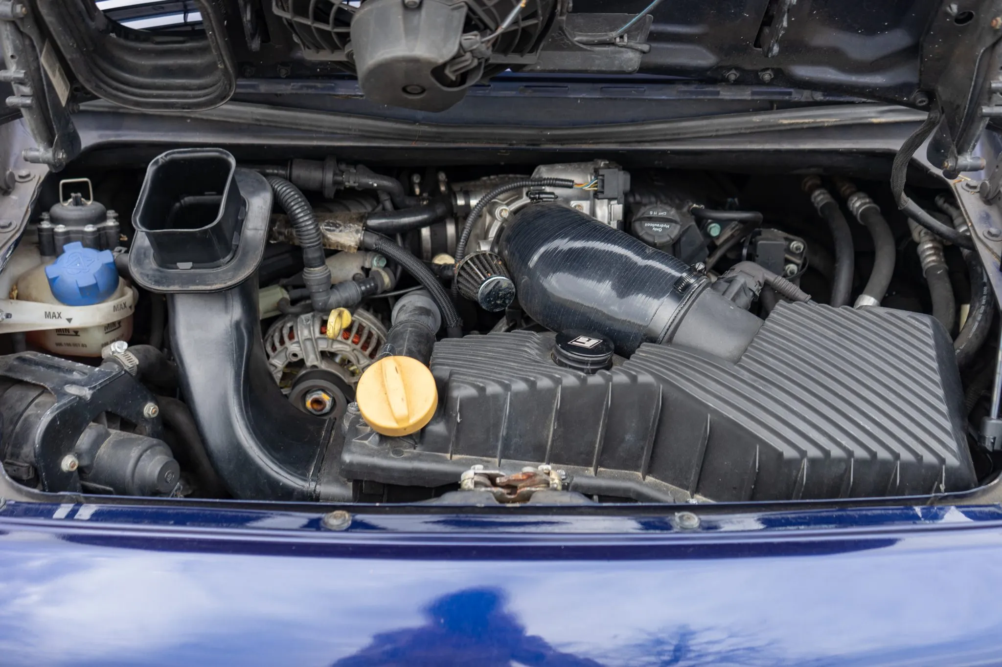 Equipment includes a blue soft top, a blue removable hardtop, Aerokit components, the Power Seat Package, a GT3 throttlebody, an IPD plenum, Fabspeed exhaust tips, xenon headlights, a deployable rear spoiler, 18″ Sport Classic wheels, cruise control, a body-color center console, interior wood trim, and automatic climate control.